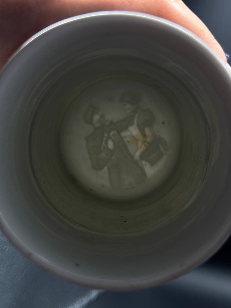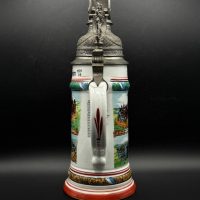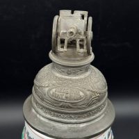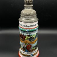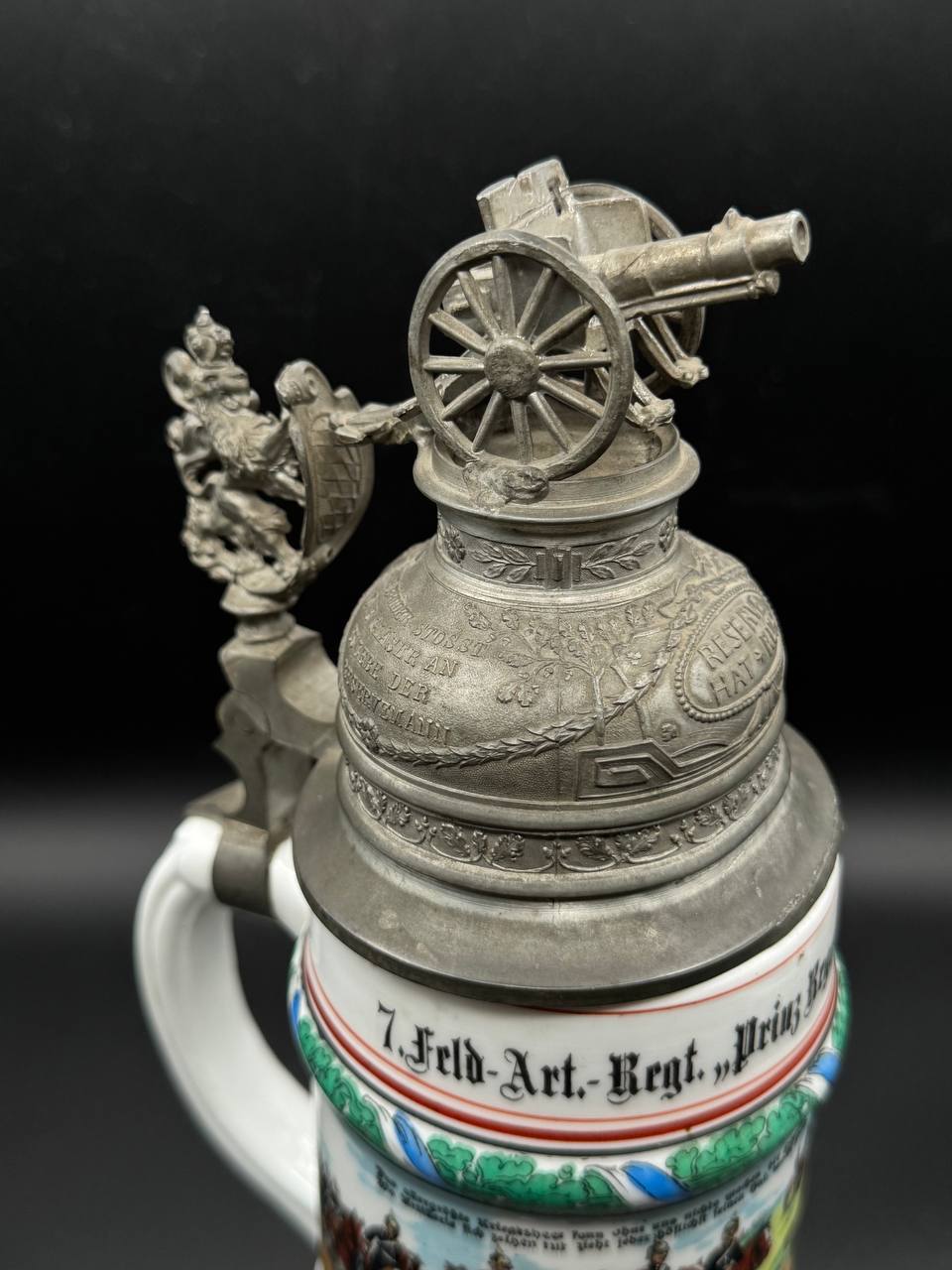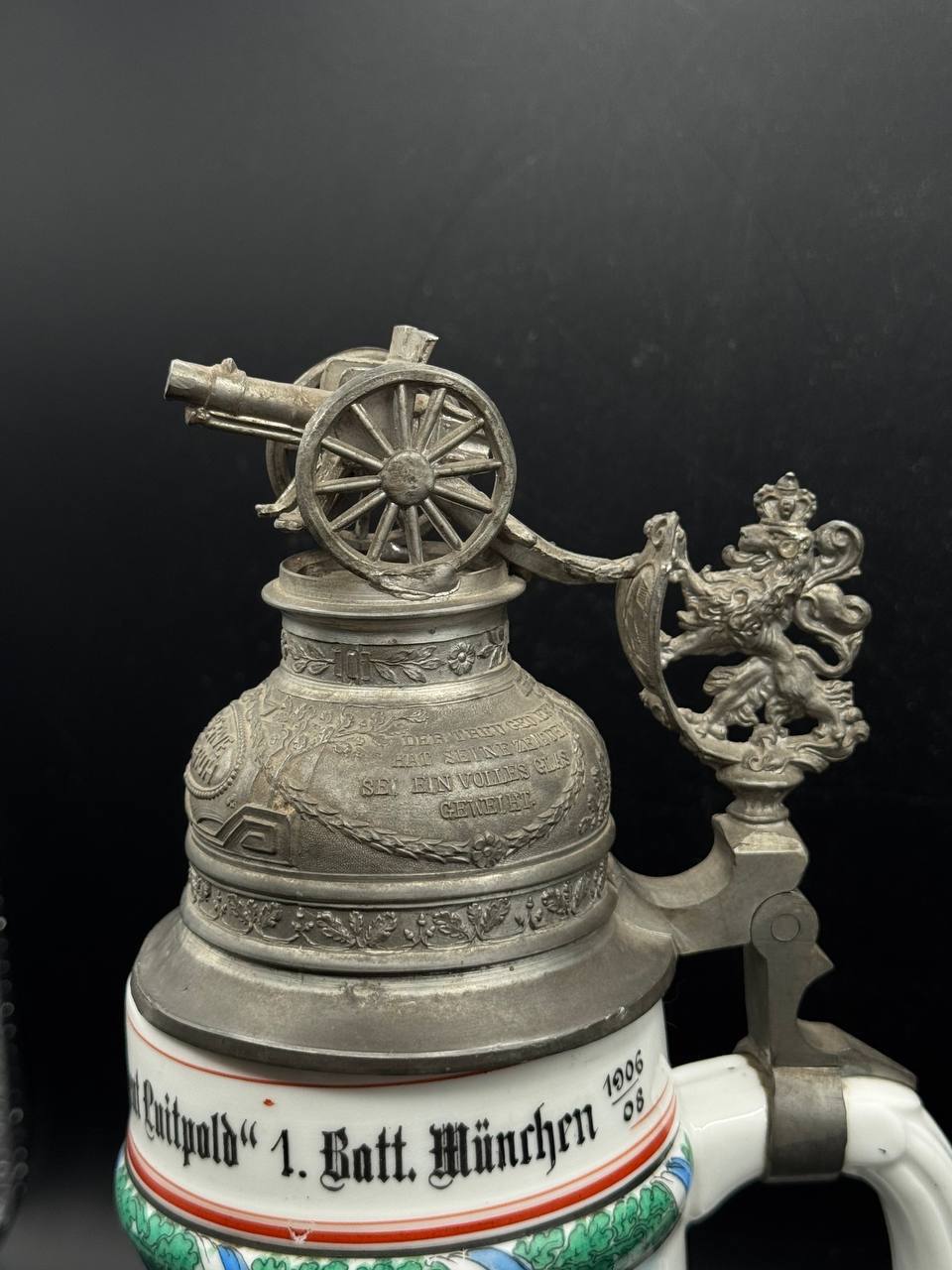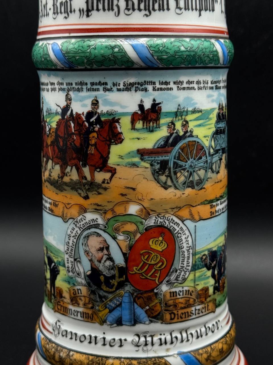 The front features the crowned initials PL of Prince Regent Luitpold, surrounded by ornamental motifs and regimental banners. Pewter lid with artilleryman and cannon finial, Bavarian lion thumb lift, and lithophane inside showing the classic “soldier’s farewell” scene. Rich color, fine detail, and strong glaze make this an outstanding example of Munich-produced reservist art from the pre-WWI period.