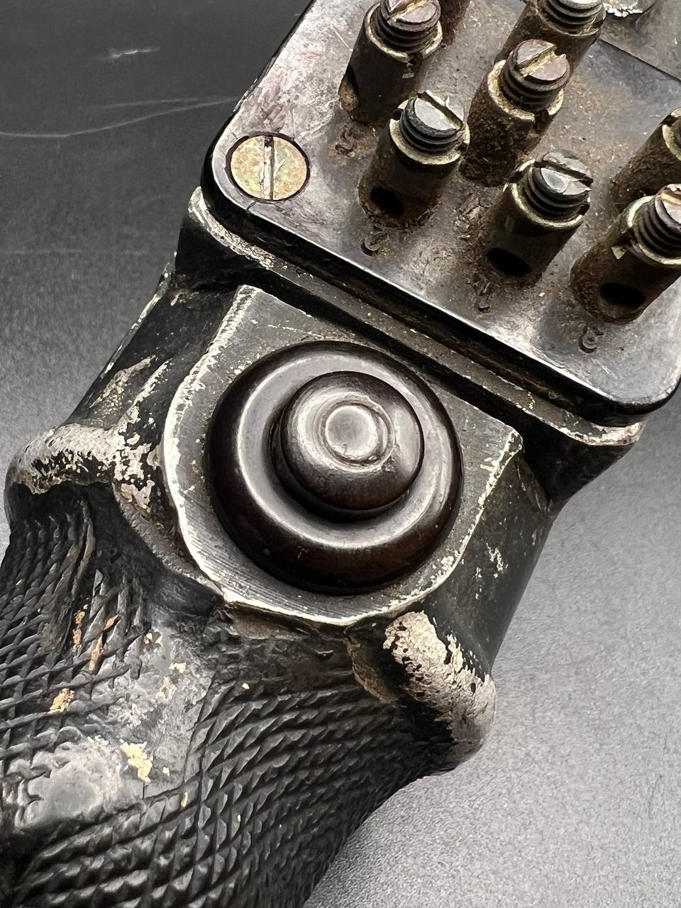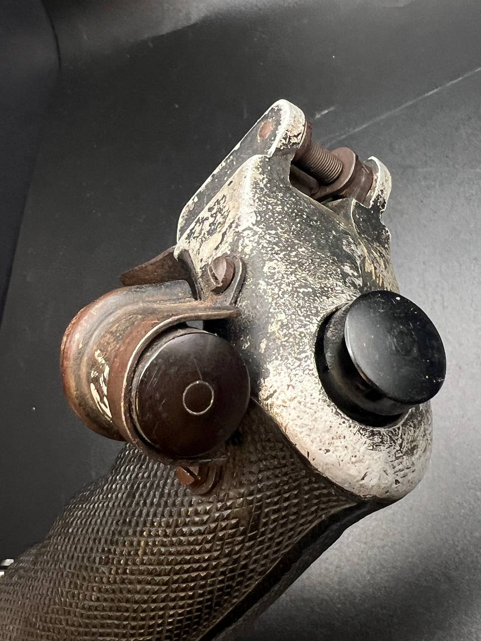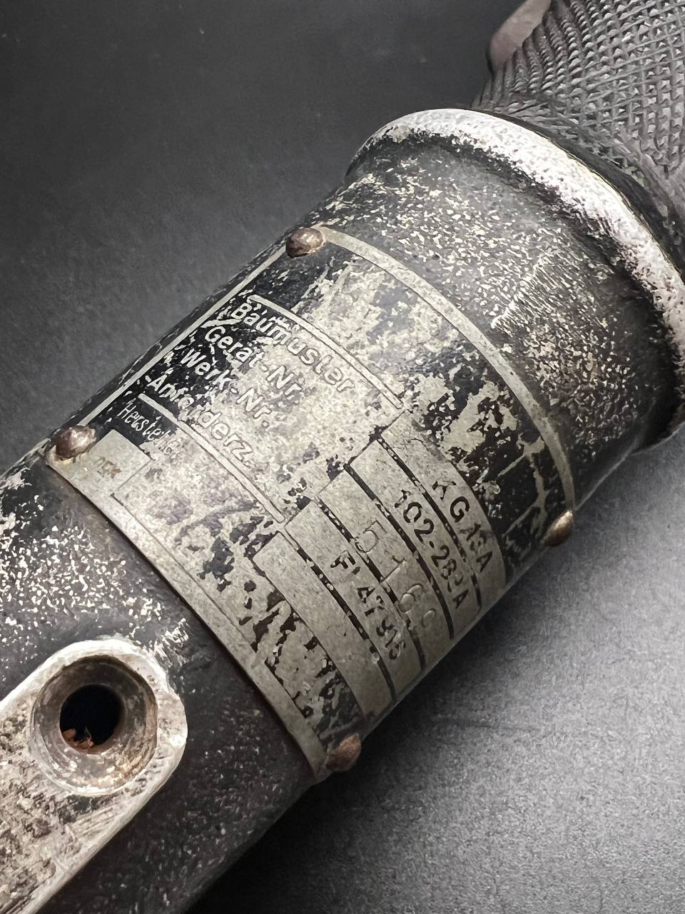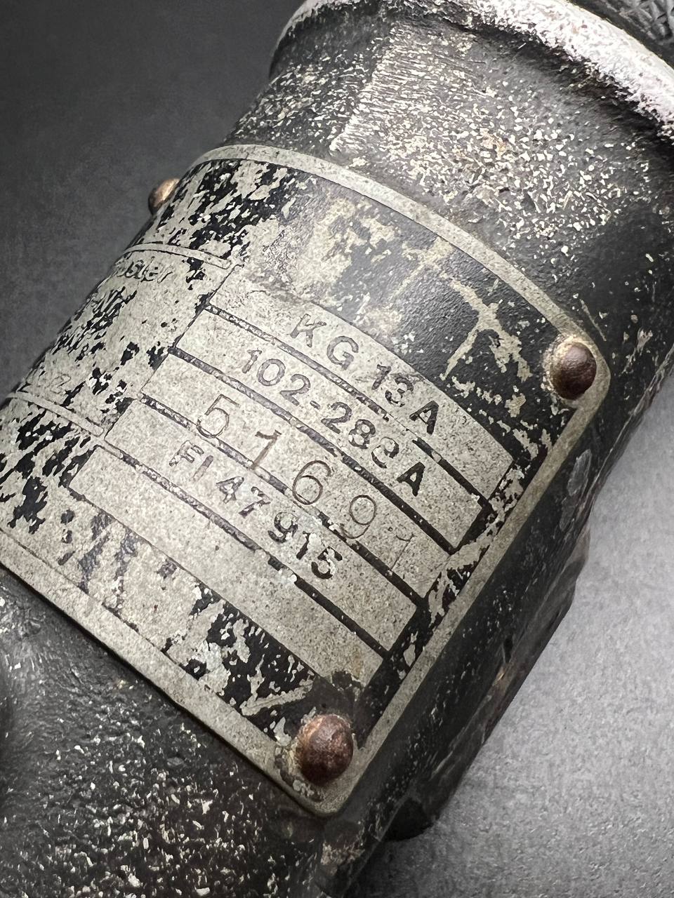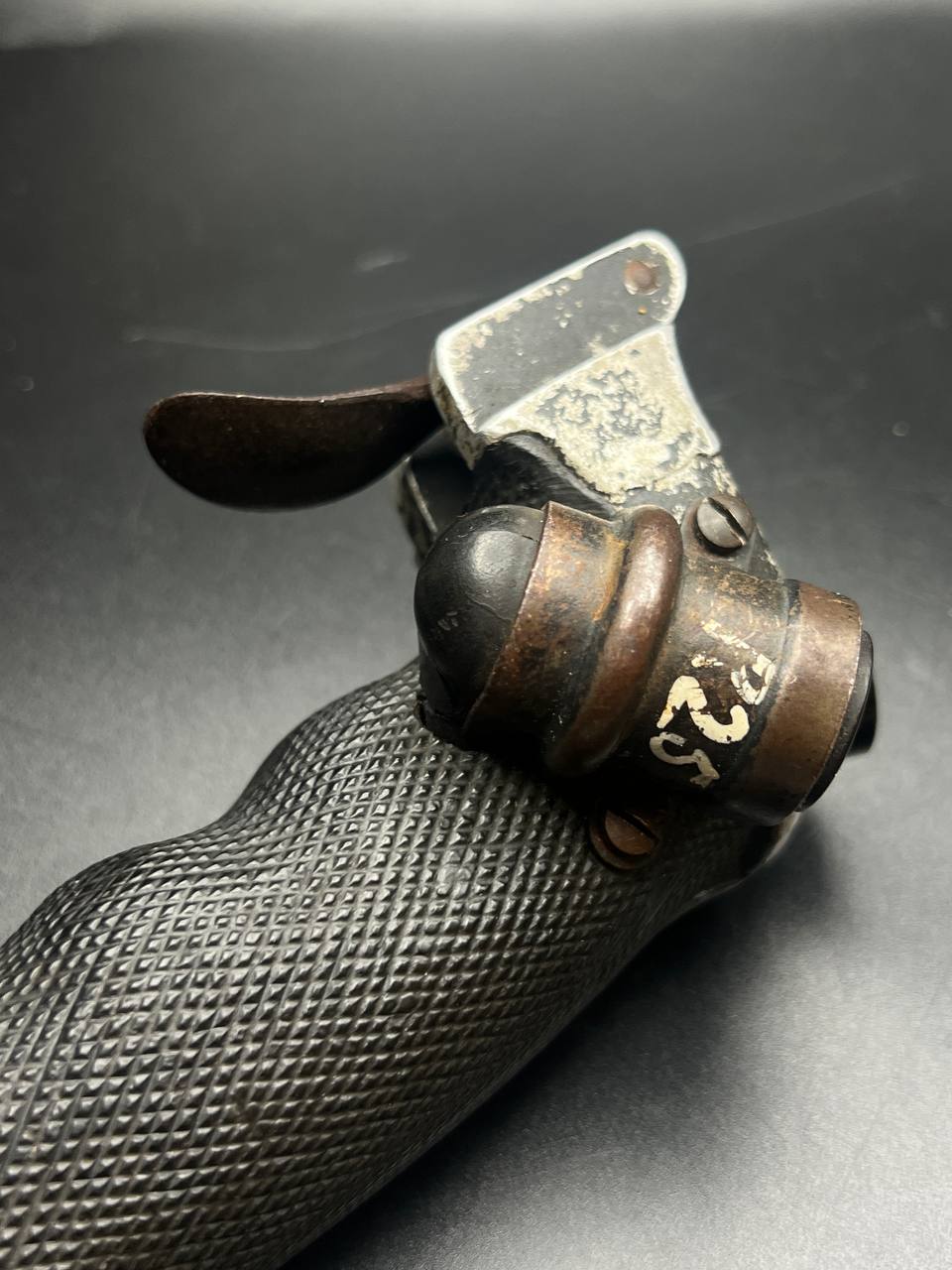 Original control stick grip from the Messerschmitt Bf 109 /Focke Wulf FW 190 fighter aircraft of the World War II period. Features a aluminium body with the characteristic ergonomic shape and textured grip surface. Equipped with original buttons and levers for weapon and system controls. Factory data plate with markings and serial details is present and legible. Authentic aviation component, showing strong service wear, combat patina, and remaining in untouched, unrestored condition.