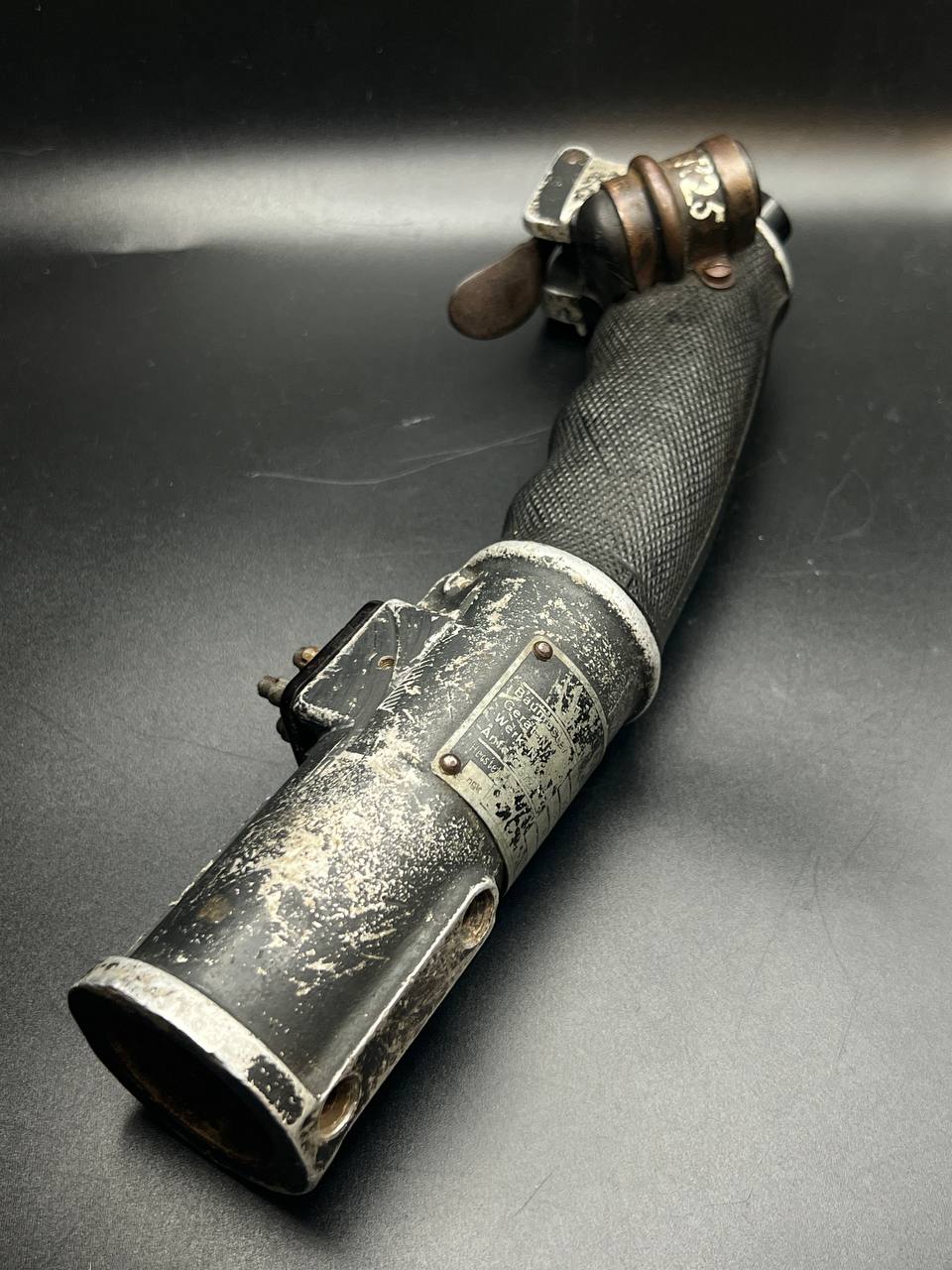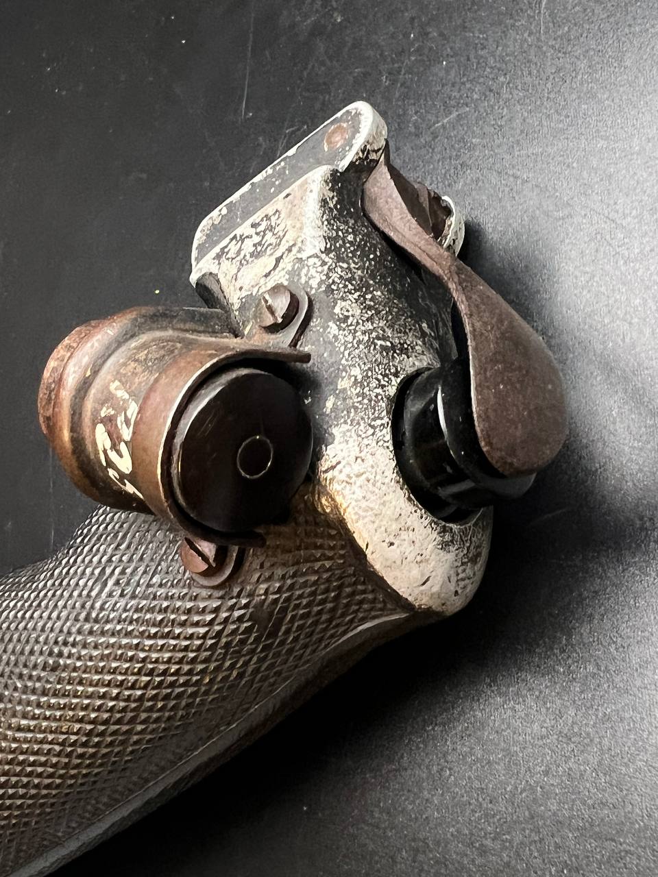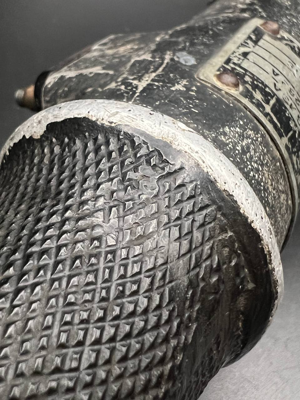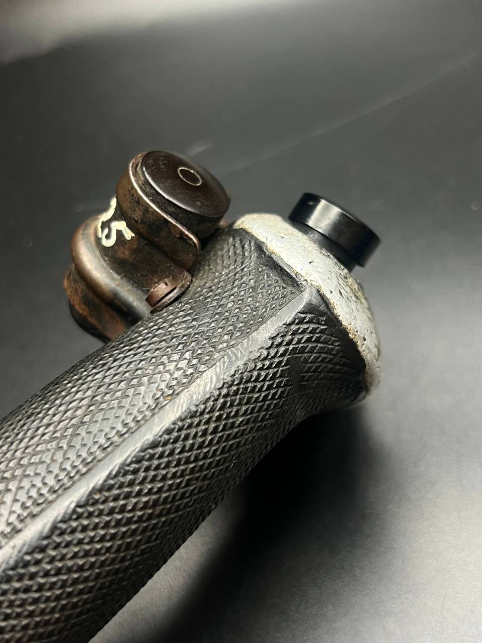 Original control stick grip from the Messerschmitt Bf 109 /Focke Wulf FW 190 fighter aircraft of the World War II period. Features a aluminium body with the characteristic ergonomic shape and textured grip surface. Equipped with original buttons and levers for weapon and system controls. Factory data plate with markings and serial details is present and legible. Authentic aviation component, showing strong service wear, combat patina, and remaining in untouched, unrestored condition.