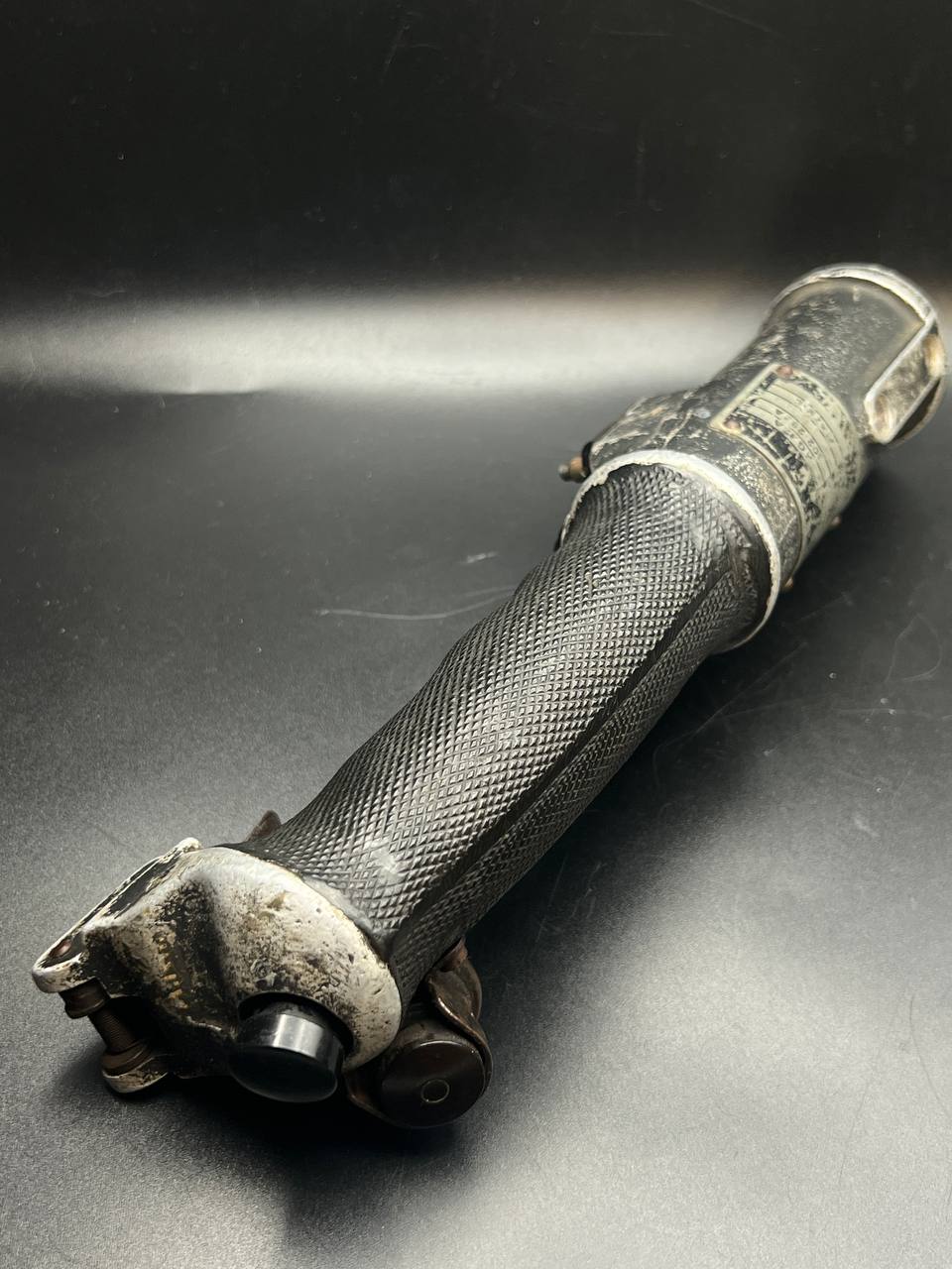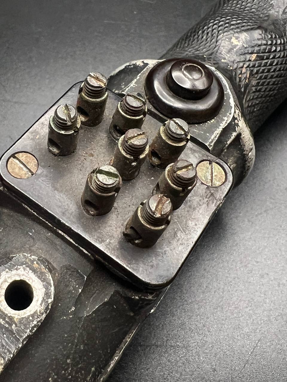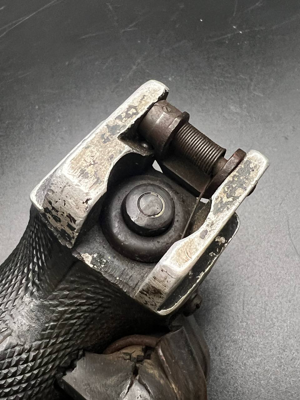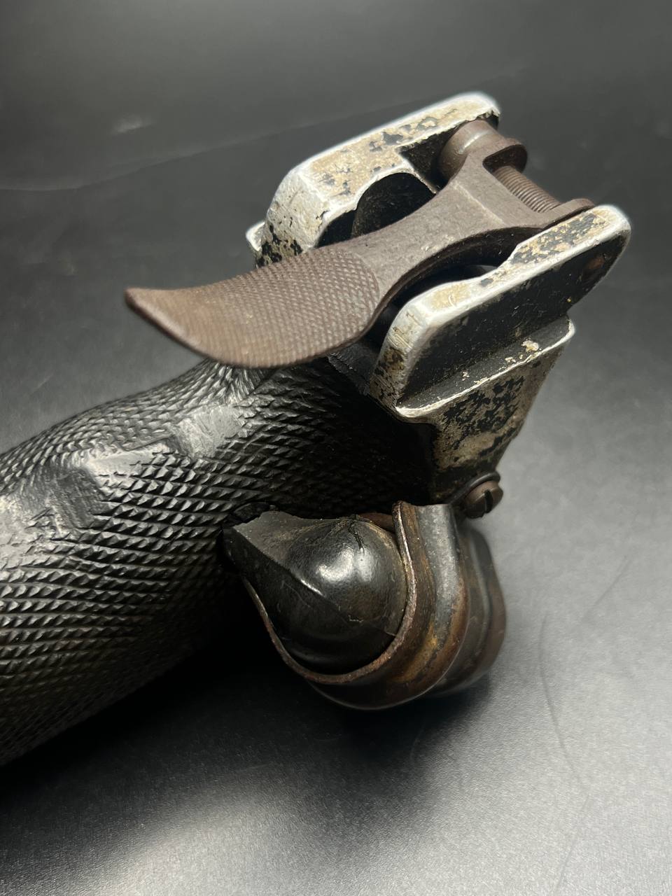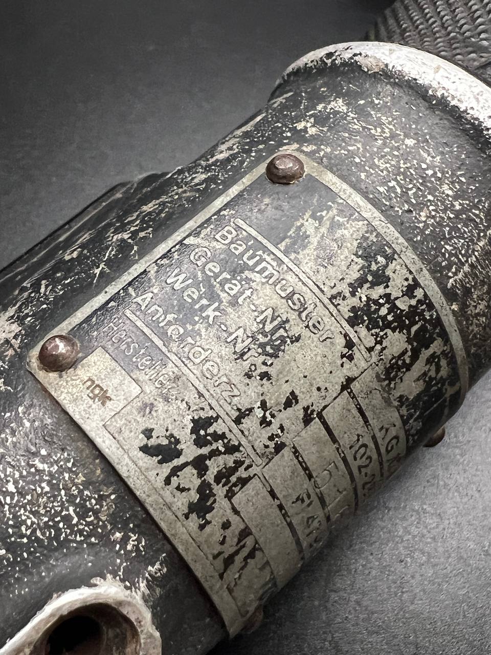 Original control stick grip from the Messerschmitt Bf 109 /Focke Wulf FW 190 fighter aircraft of the World War II period. Features a aluminium body with the characteristic ergonomic shape and textured grip surface. Equipped with original buttons and levers for weapon and system controls. Factory data plate with markings and serial details is present and legible. Authentic aviation component, showing strong service wear, combat patina, and remaining in untouched, unrestored condition.