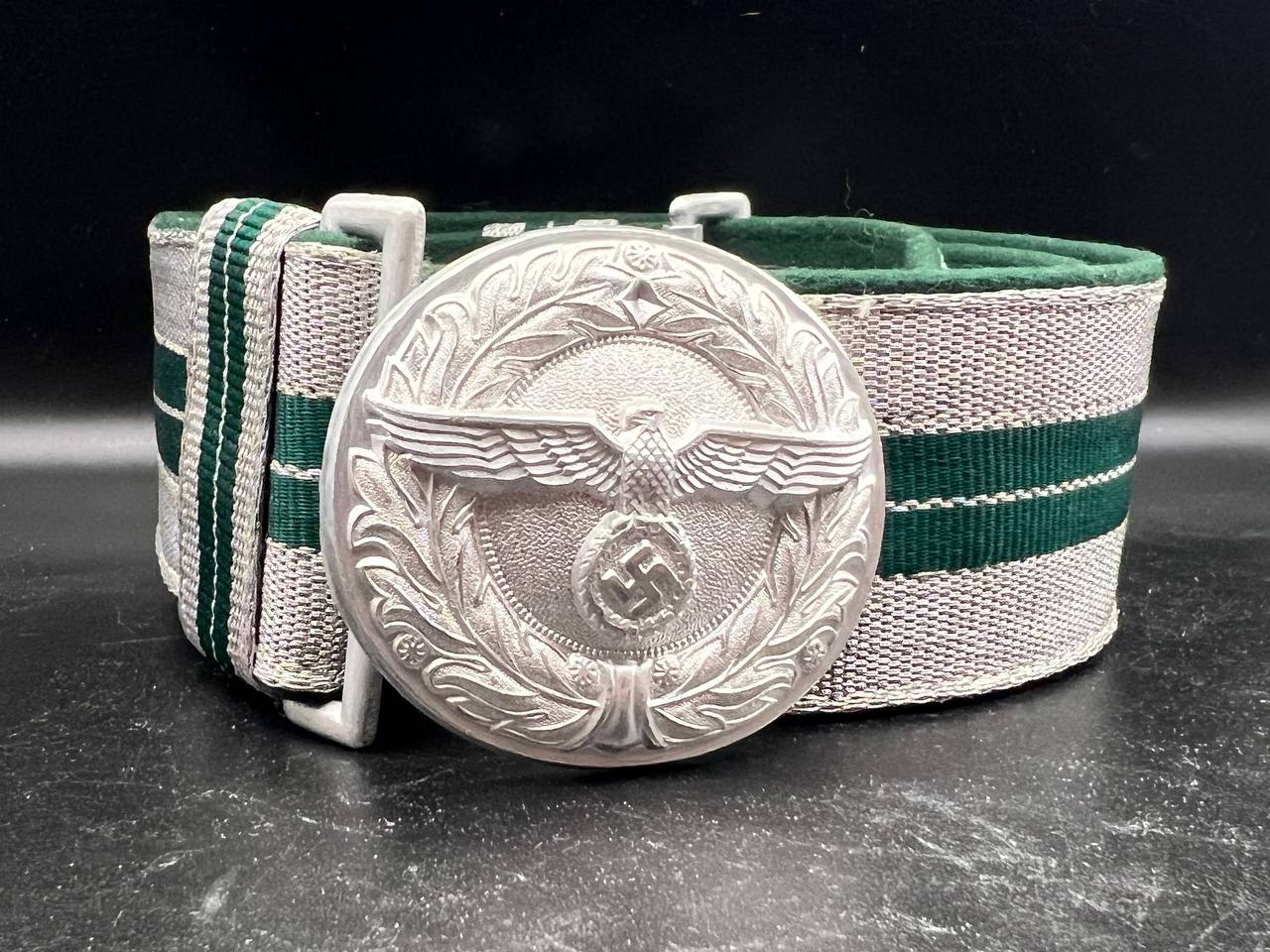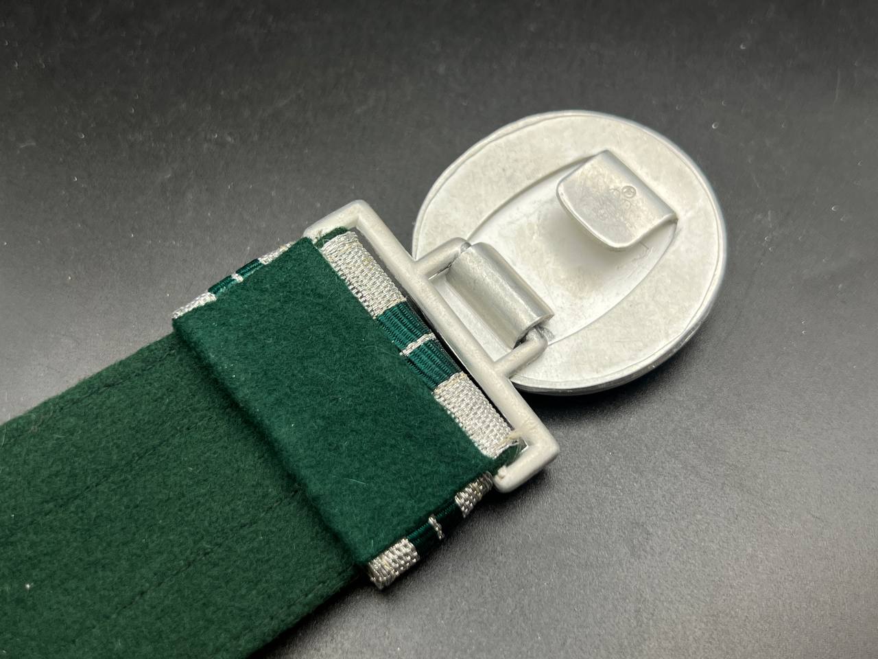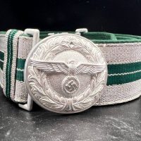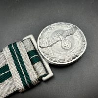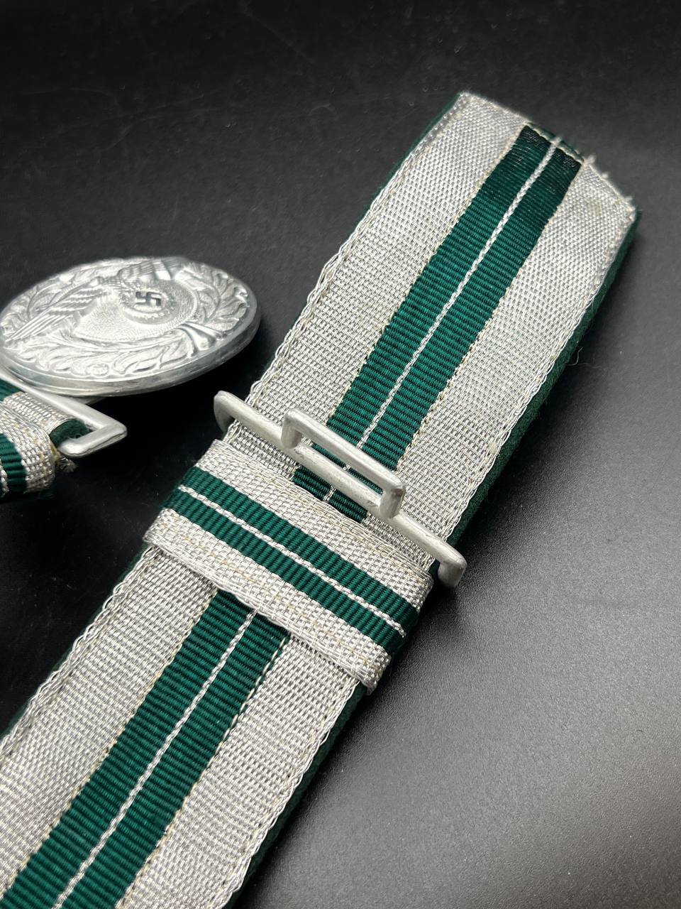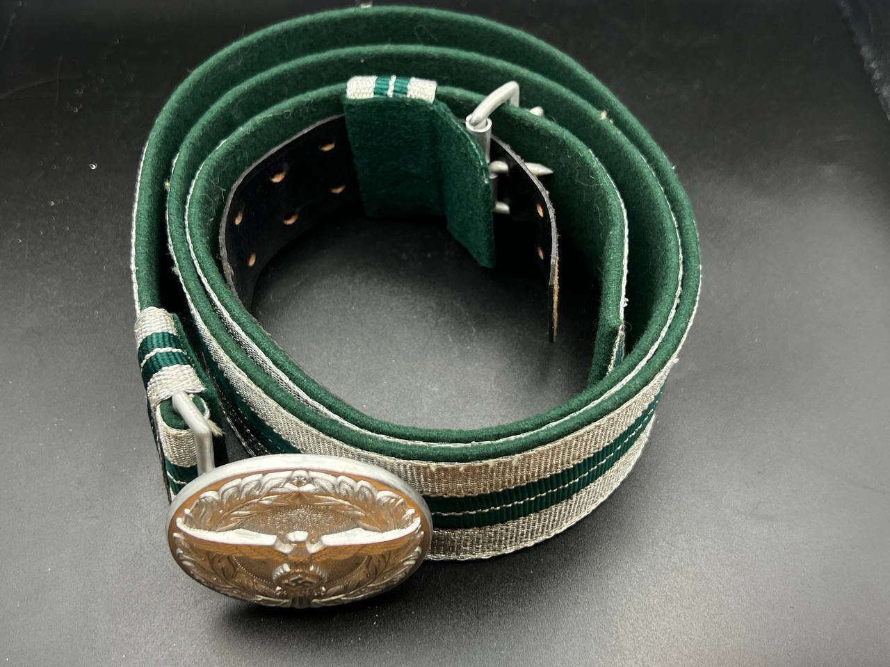 The dress belt buckle manufactured by Friedrich Linden of Lüdenscheid, stamped aluminum, hollow construction with reverse catch, marked FLL ges.gesch 38. On the distinctive dress belt with 2 wide green center stripes, lined in green. Length approximately 105 cm.