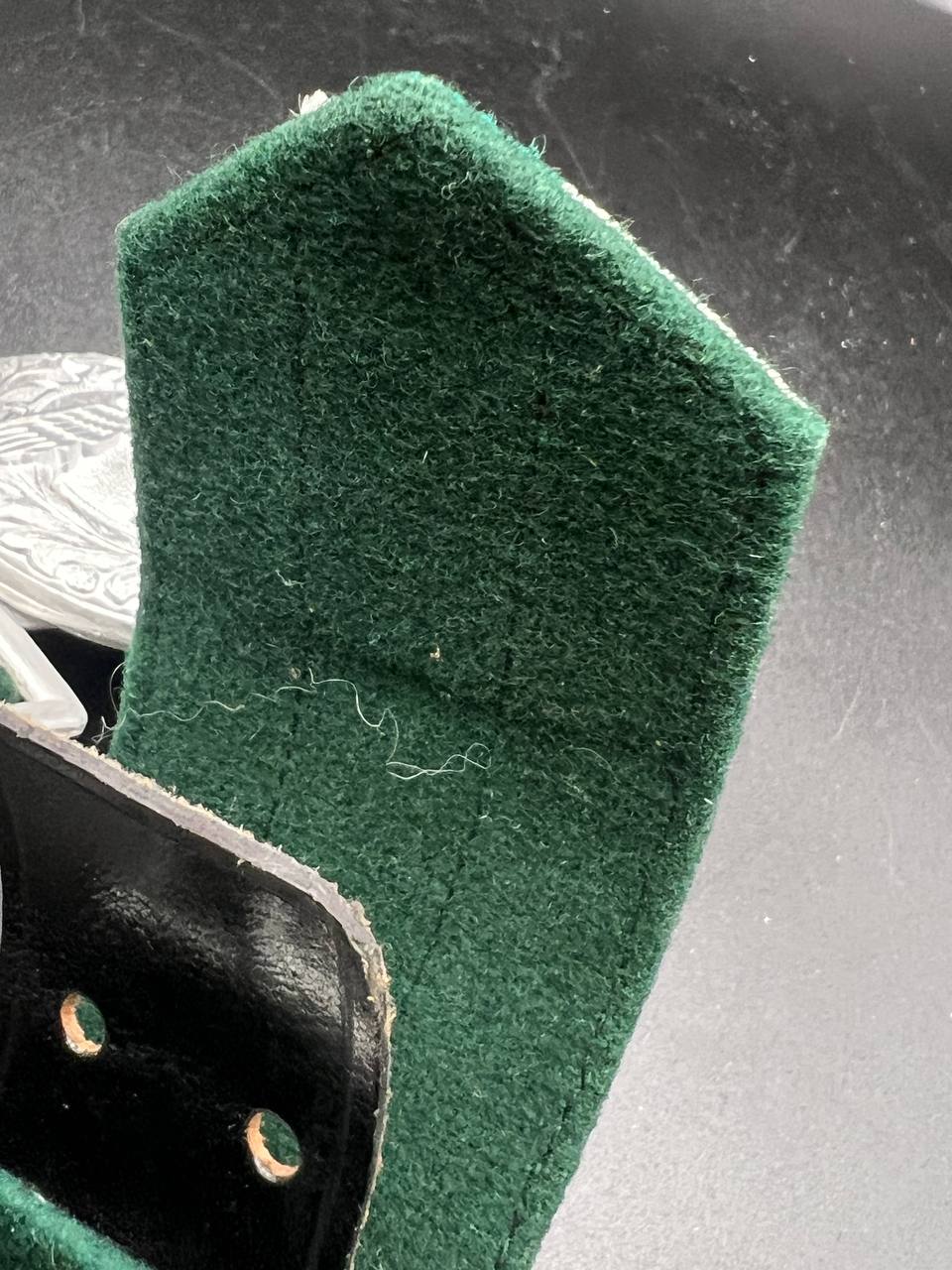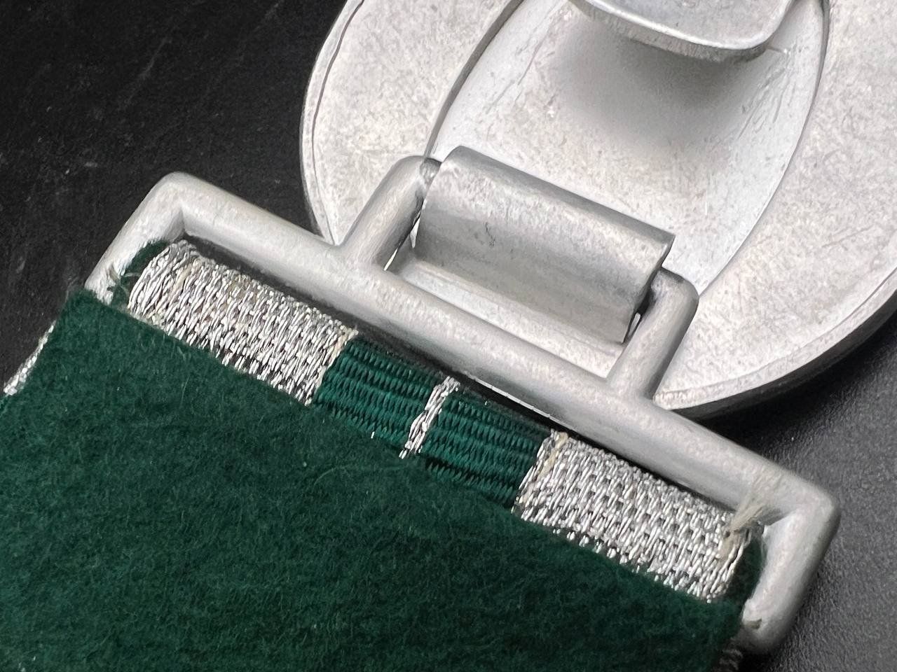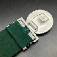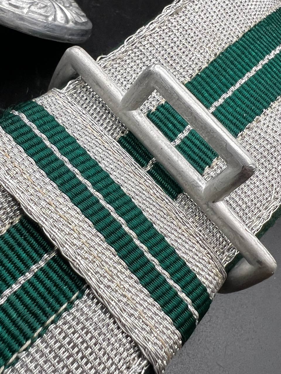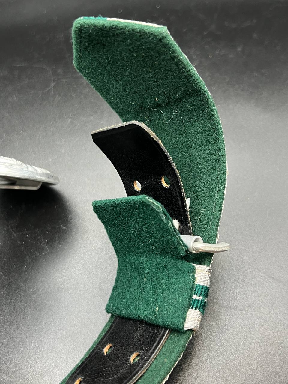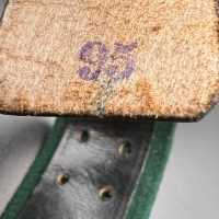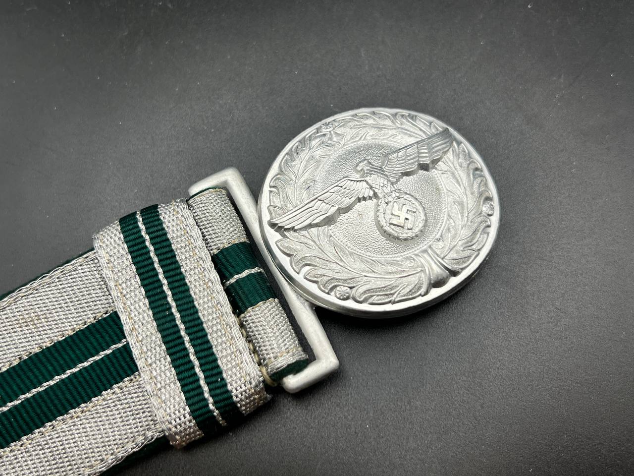 The dress belt buckle manufactured by Friedrich Linden of Lüdenscheid, stamped aluminum, hollow construction with reverse catch, marked FLL ges.gesch 38. On the distinctive dress belt with 2 wide green center stripes, lined in green. Length approximately 105 cm.