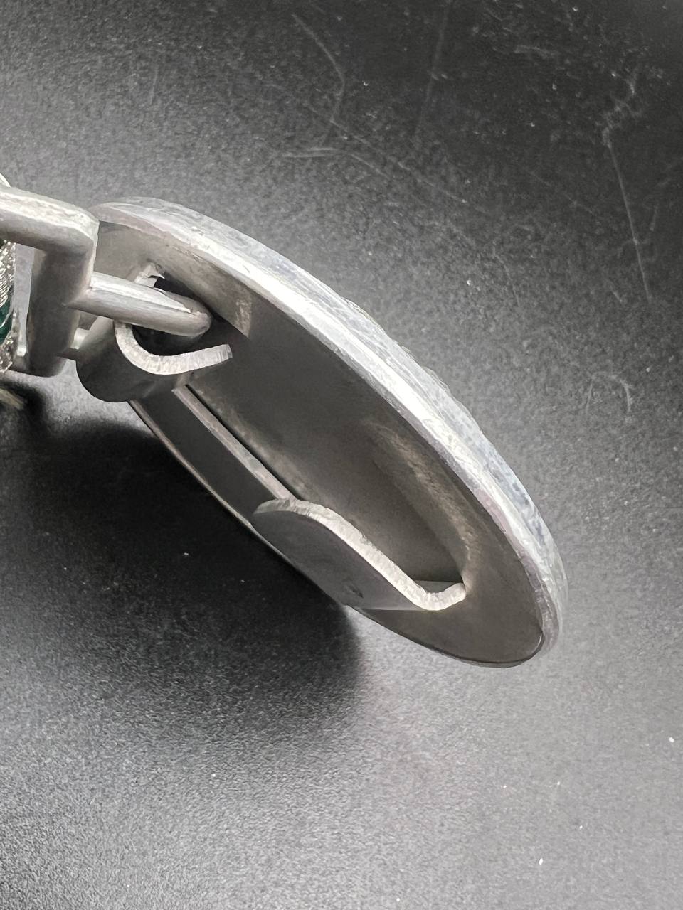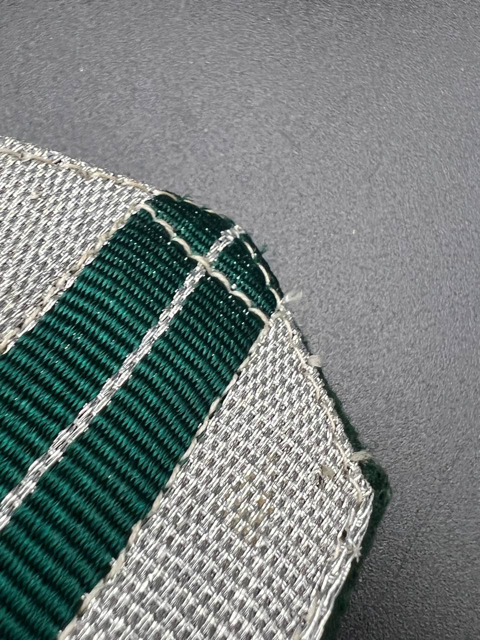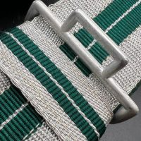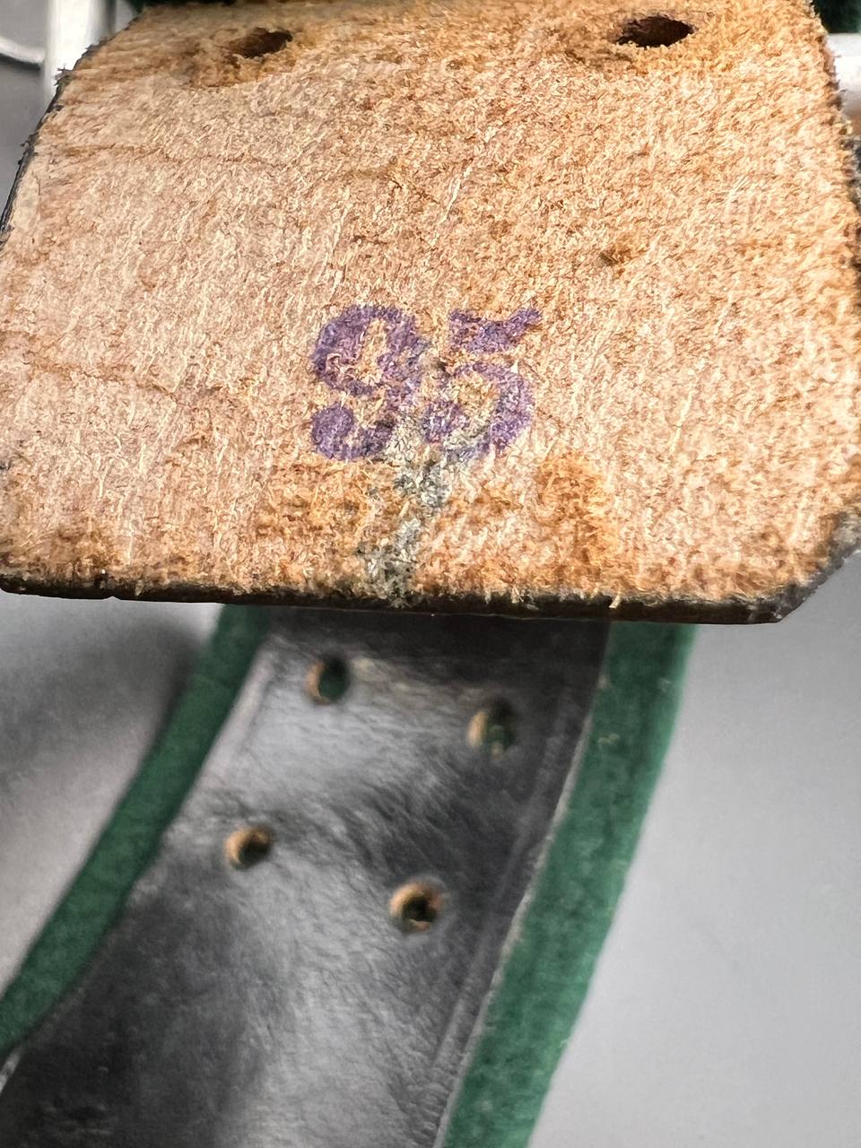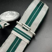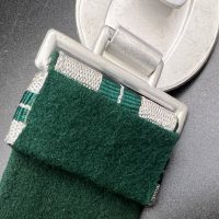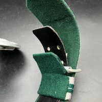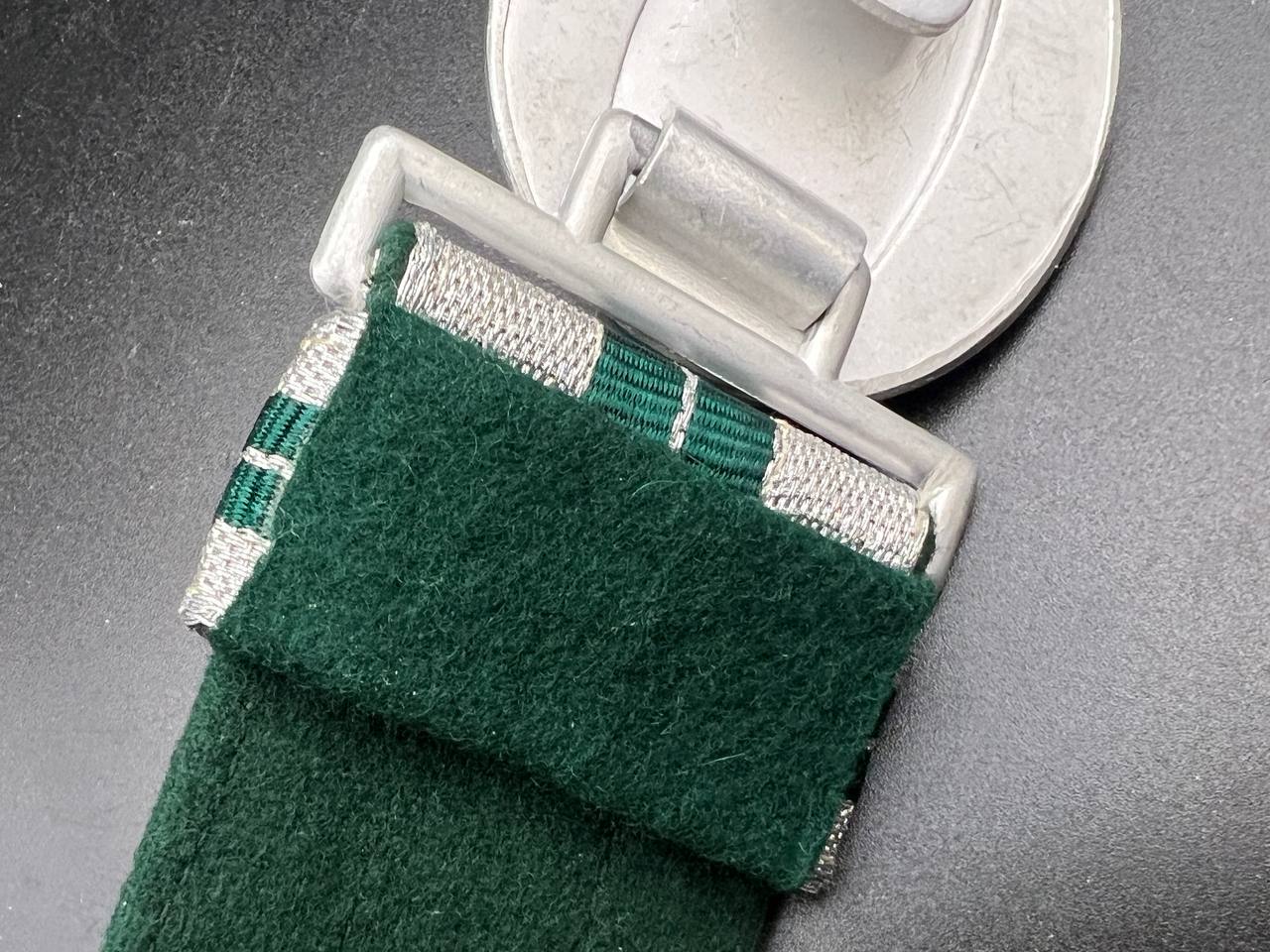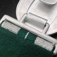 The dress belt buckle manufactured by Friedrich Linden of Lüdenscheid, stamped aluminum, hollow construction with reverse catch, marked FLL ges.gesch 38. On the distinctive dress belt with 2 wide green center stripes, lined in green. Length approximately 105 cm.