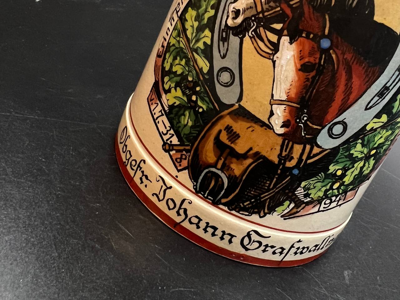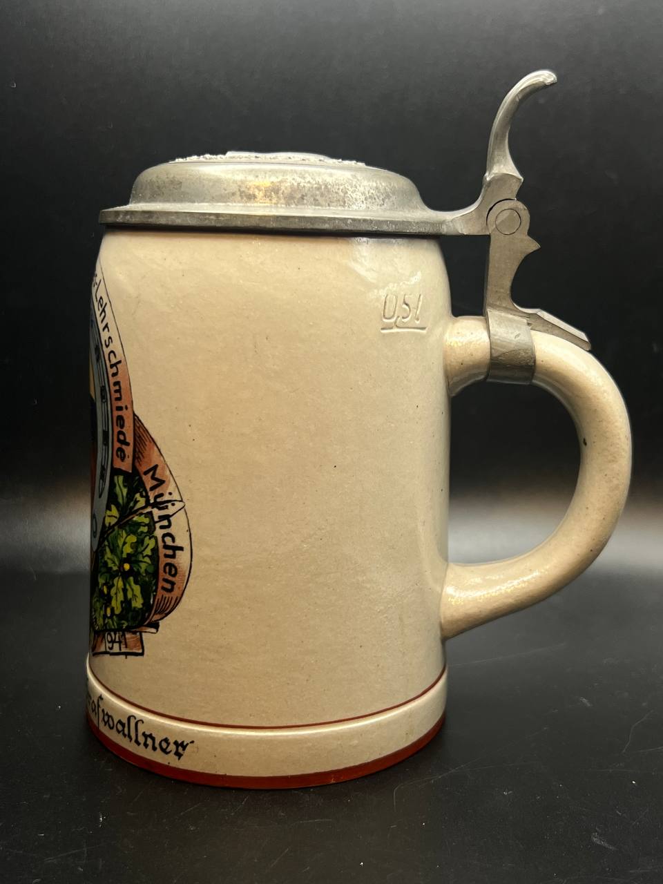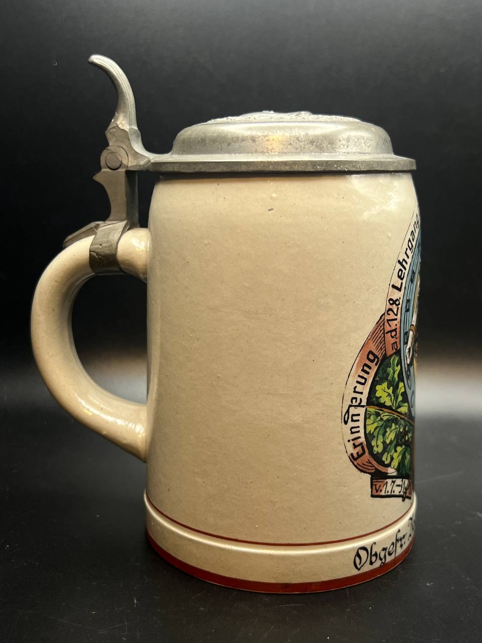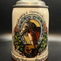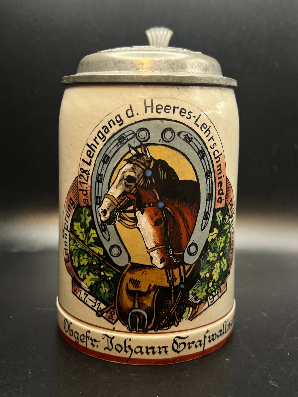 Original German commemorative beer stein from the First World War period. Dedicated to the Lehrgang der Heeres-Lehrschmiede (Army Training Blacksmith Course). The body features multicolor hand-painted decoration with a horse’s head inside a horseshoe, dated 1917–1918. Pewter lid with embossed M16 helmet surrounded by an oak wreath. Named at the base: Gefr. Johann Grafwallner. Good collectible condition, no cracks, complete with original lid.