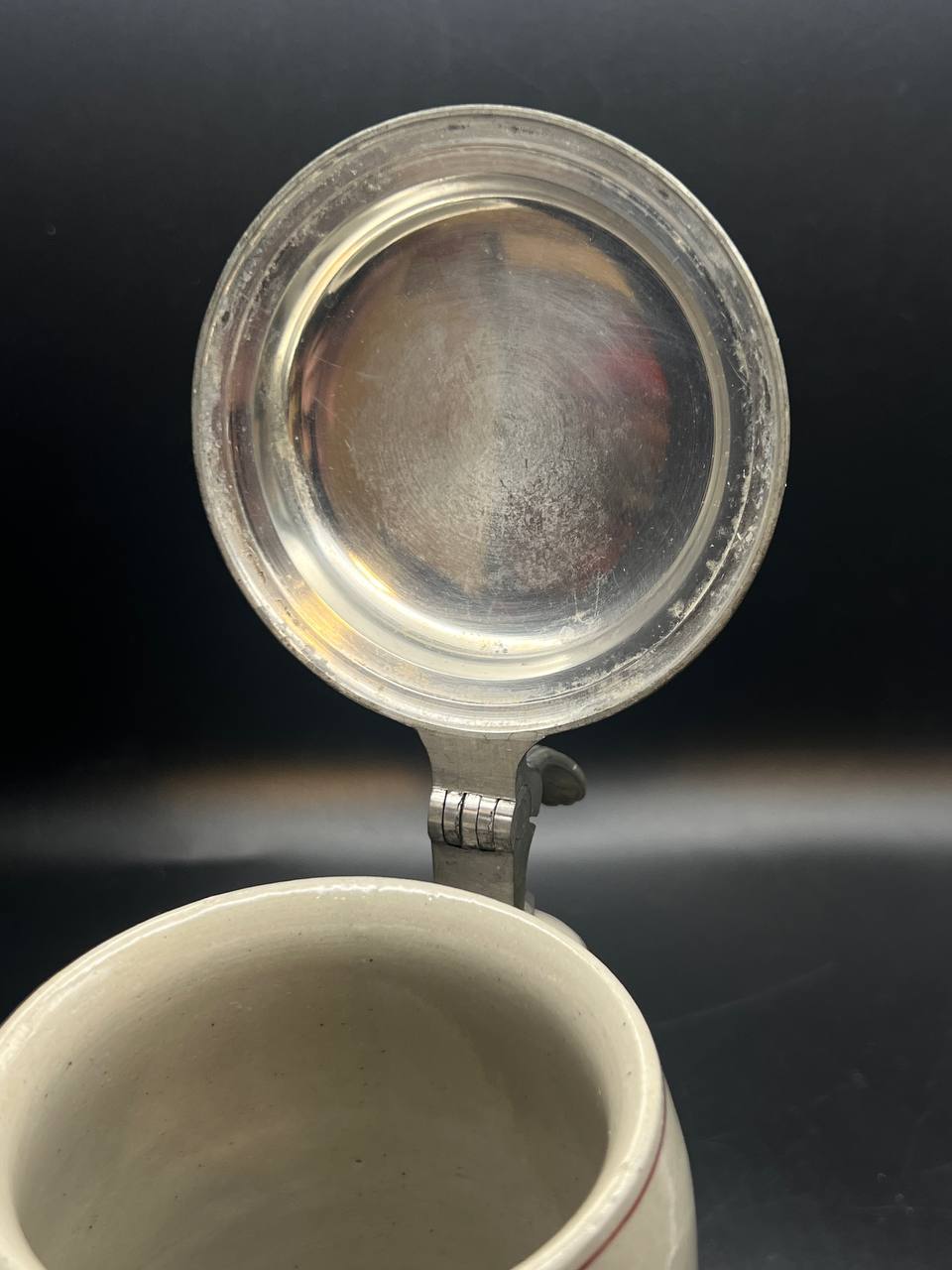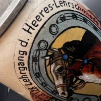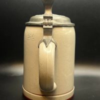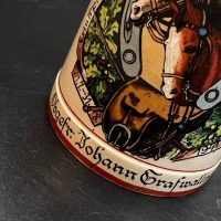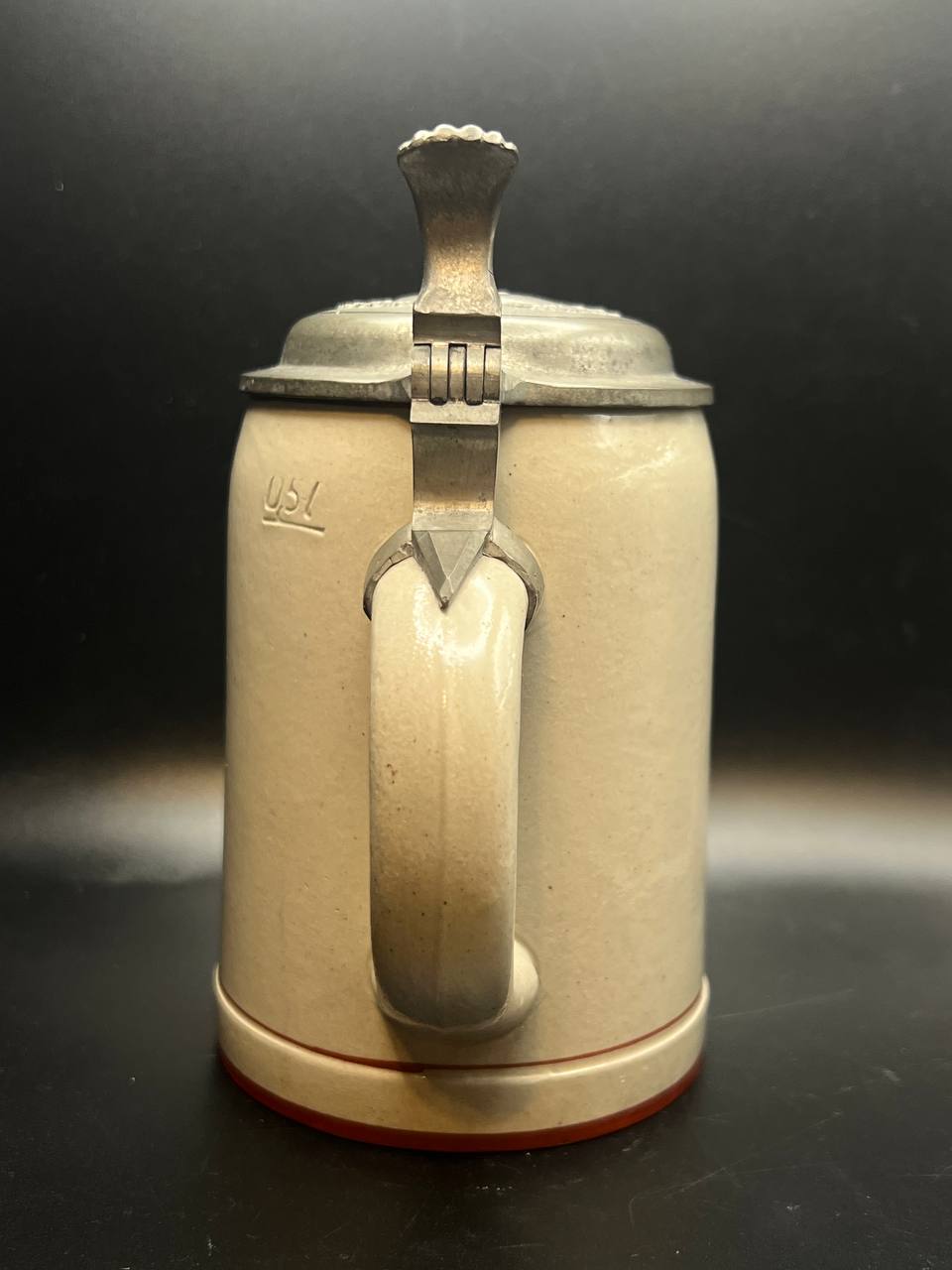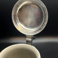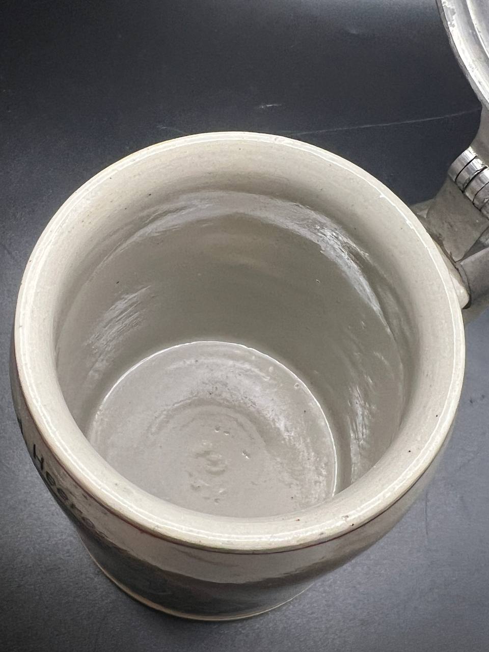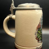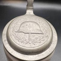 Original German commemorative beer stein from the First World War period. Dedicated to the Lehrgang der Heeres-Lehrschmiede (Army Training Blacksmith Course). The body features multicolor hand-painted decoration with a horse’s head inside a horseshoe, dated 1917–1918. Pewter lid with embossed M16 helmet surrounded by an oak wreath. Named at the base: Gefr. Johann Grafwallner. Good collectible condition, no cracks, complete with original lid.