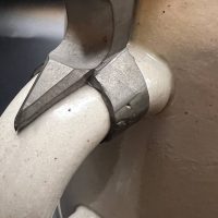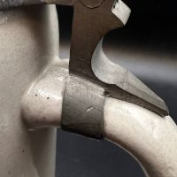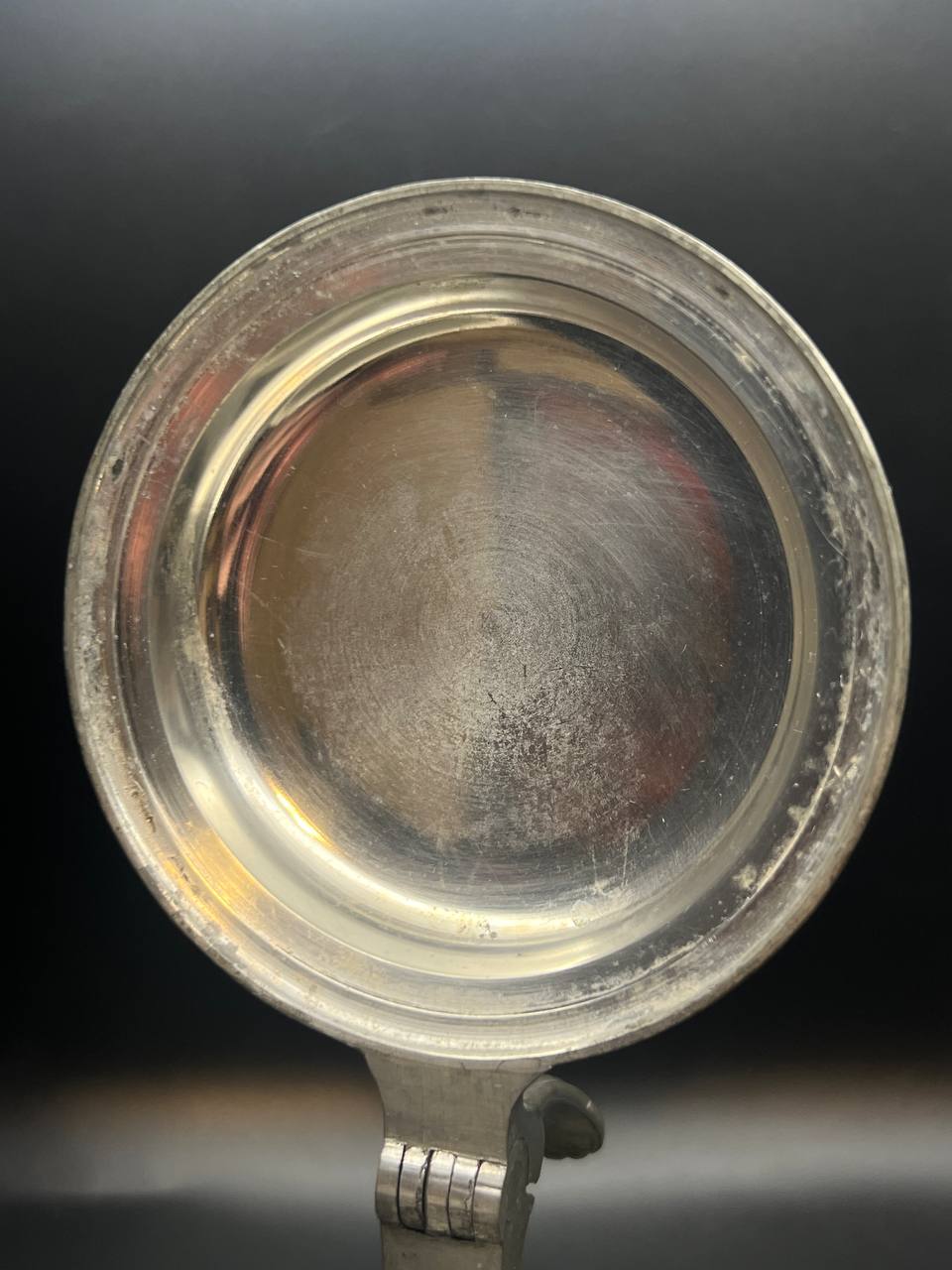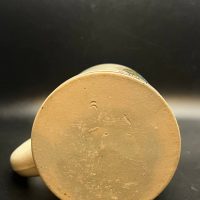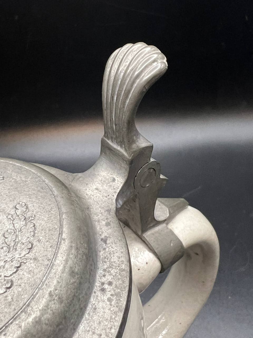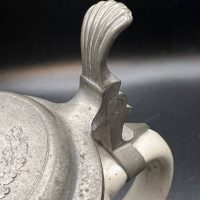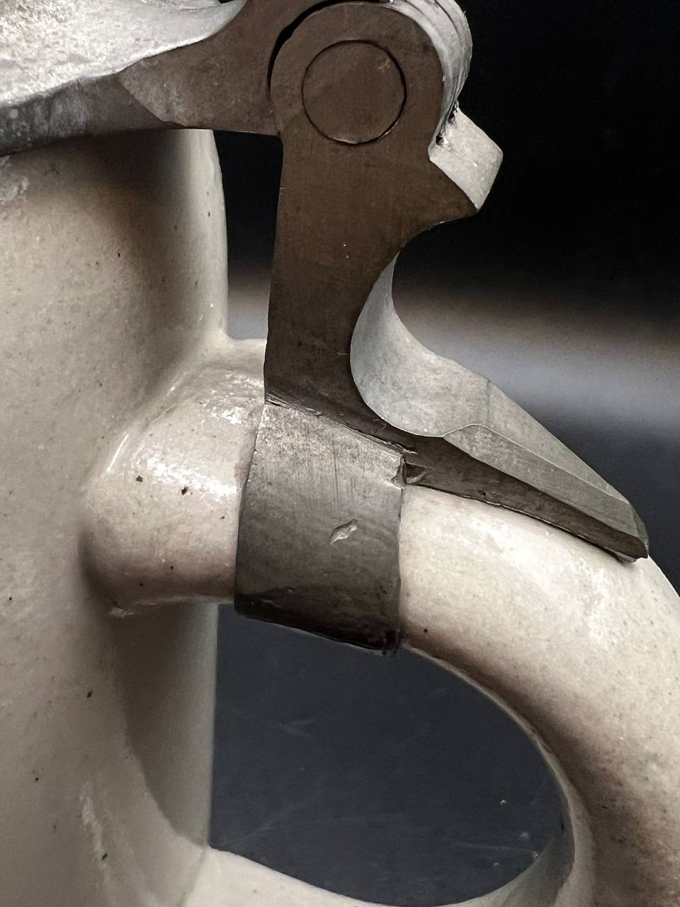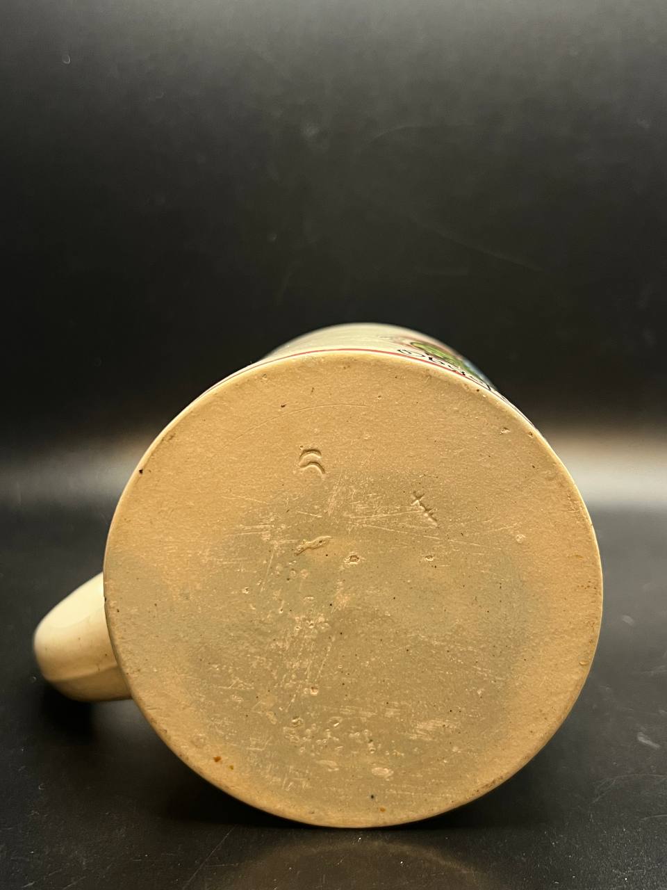 Original German commemorative beer stein from the First World War period. Dedicated to the Lehrgang der Heeres-Lehrschmiede (Army Training Blacksmith Course). The body features multicolor hand-painted decoration with a horse’s head inside a horseshoe, dated 1917–1918. Pewter lid with embossed M16 helmet surrounded by an oak wreath. Named at the base: Gefr. Johann Grafwallner. Good collectible condition, no cracks, complete with original lid.