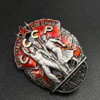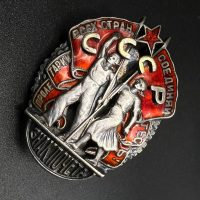 In excellent condition, nearly unheard of for the “Small” Type 1 Badge of Honor. The enamel in particular is exceptionally well-preserved: it is completely free of any wear visible to the naked eye, shows a magnificent luster, and has only a few microscopic contact marks and flakes that are invisible without magnification. The letters “CCCP” are original, have much of their original gilt still present, and are tightly attached by the original pins. The raised details of the male and female workers are nicely preserved and crisp, nearly pristine.