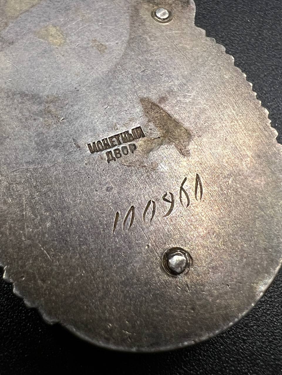 Silver gilt, enamels; measures 50.4 mm in height (incl. eyelet), 33.0 mm in width; weighs 36.9 g not incl. the suspension and connecting link. Features riveted construction with flat reverse and very small mint mark. According to the Mondvor.narod.ru classification, this is Type 3 Var. 4 found in two serial number ranges, 96730 – 126557 and 185869 – 187509.