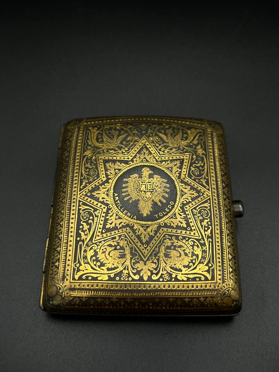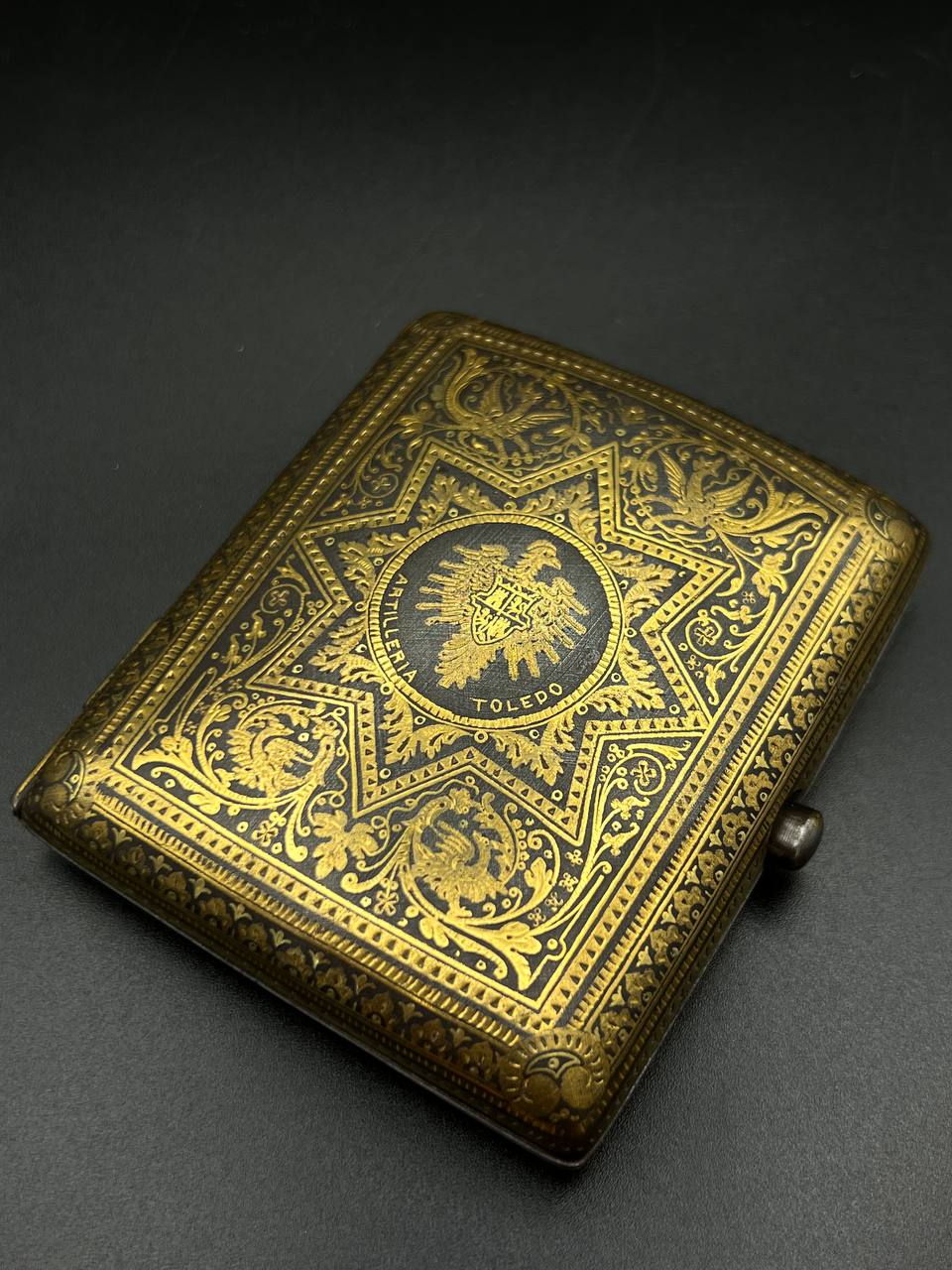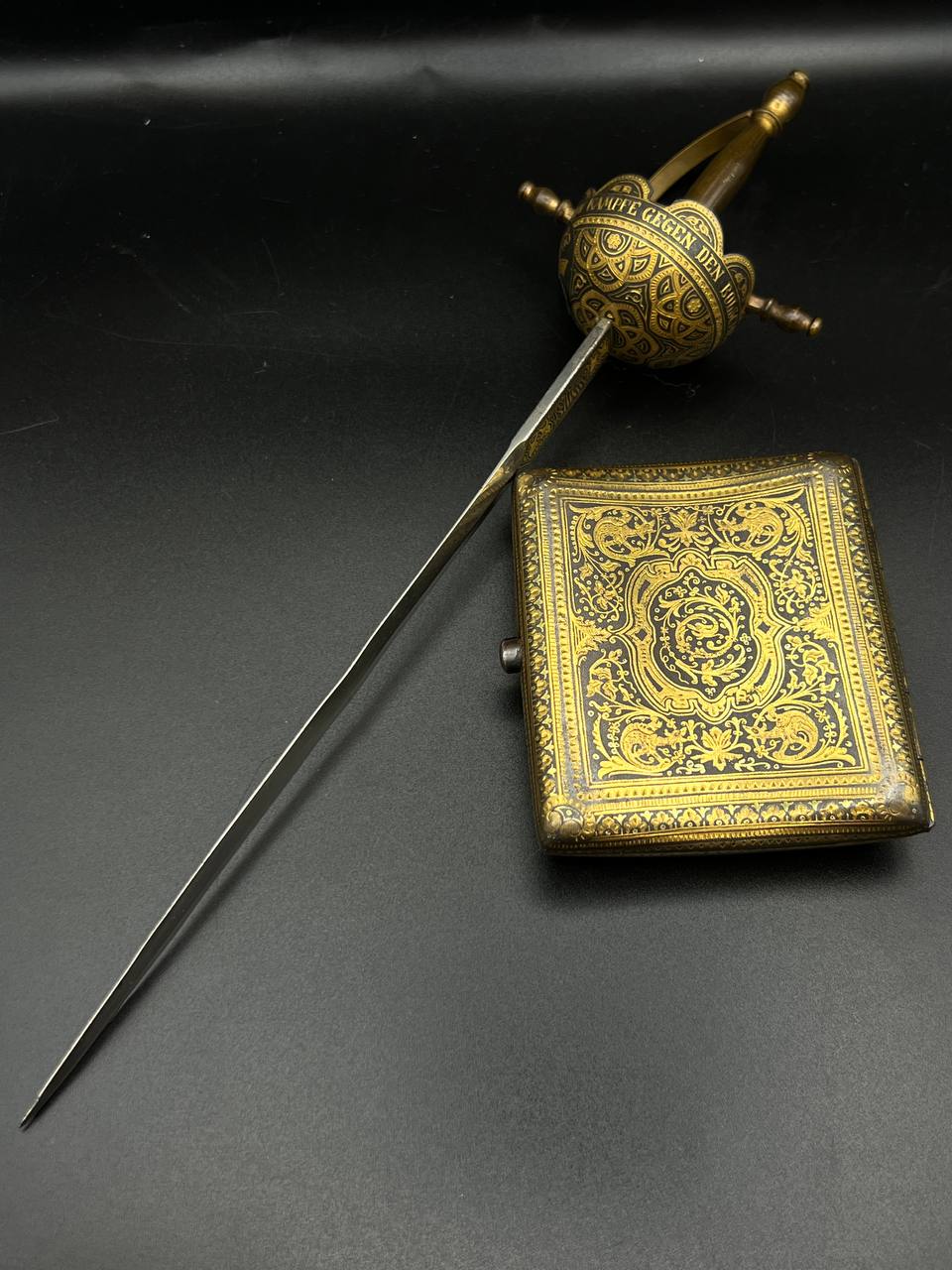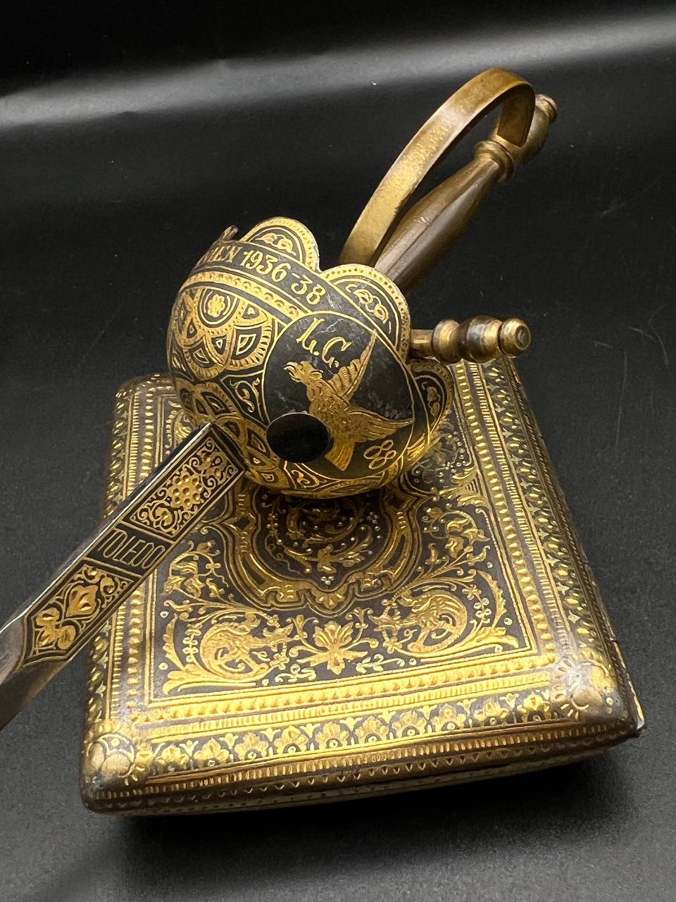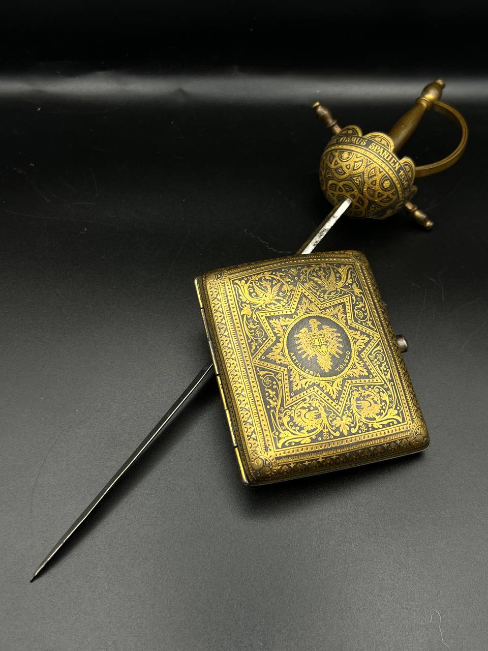 Spanish Toledo damascene set, comprising a decorative dagger letter opener and matching cigarette case. Richly decorated in traditional gold inlay (damascene) technique with intricate floral and geometric motifs.