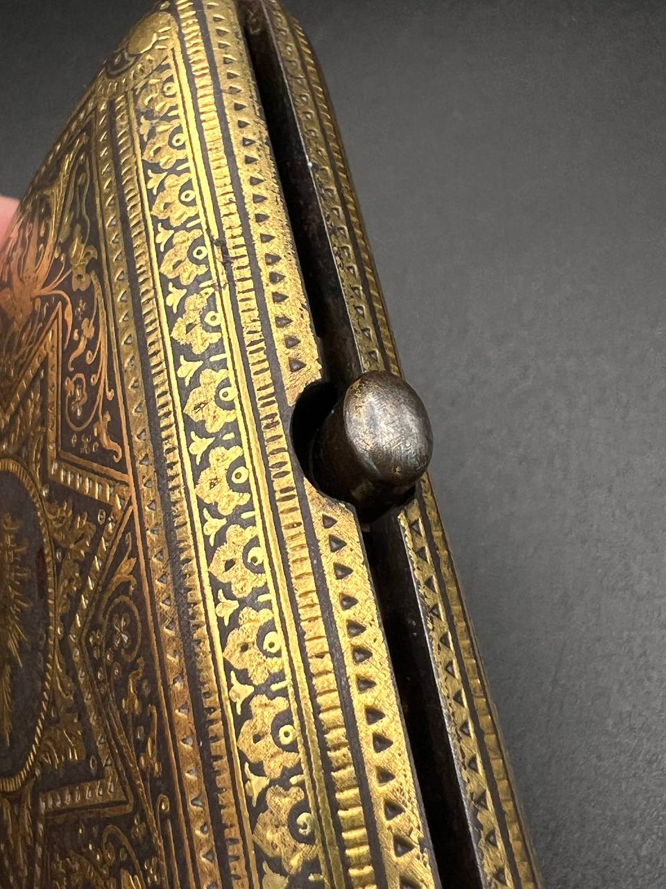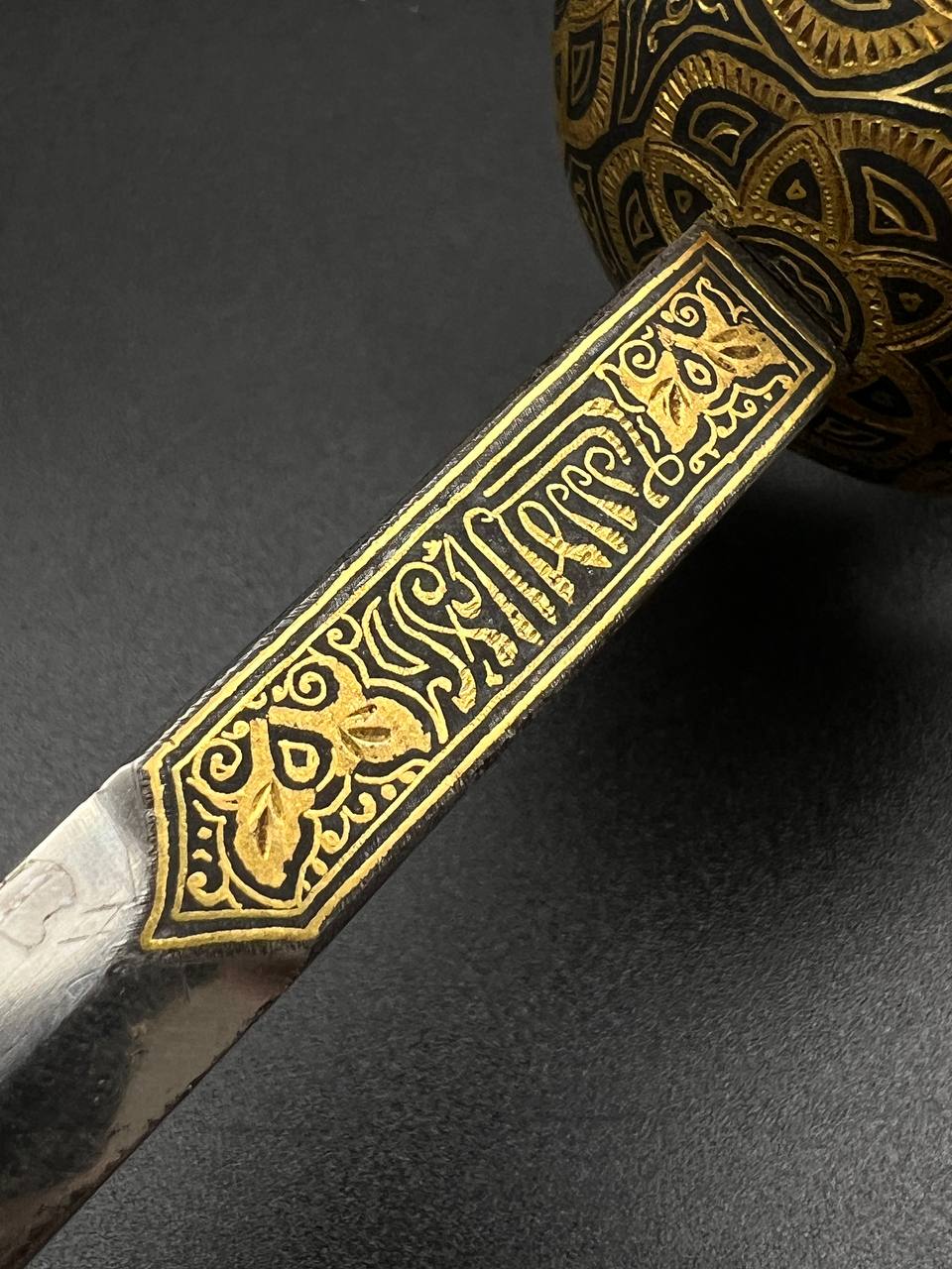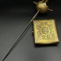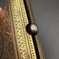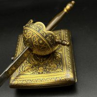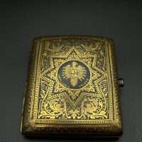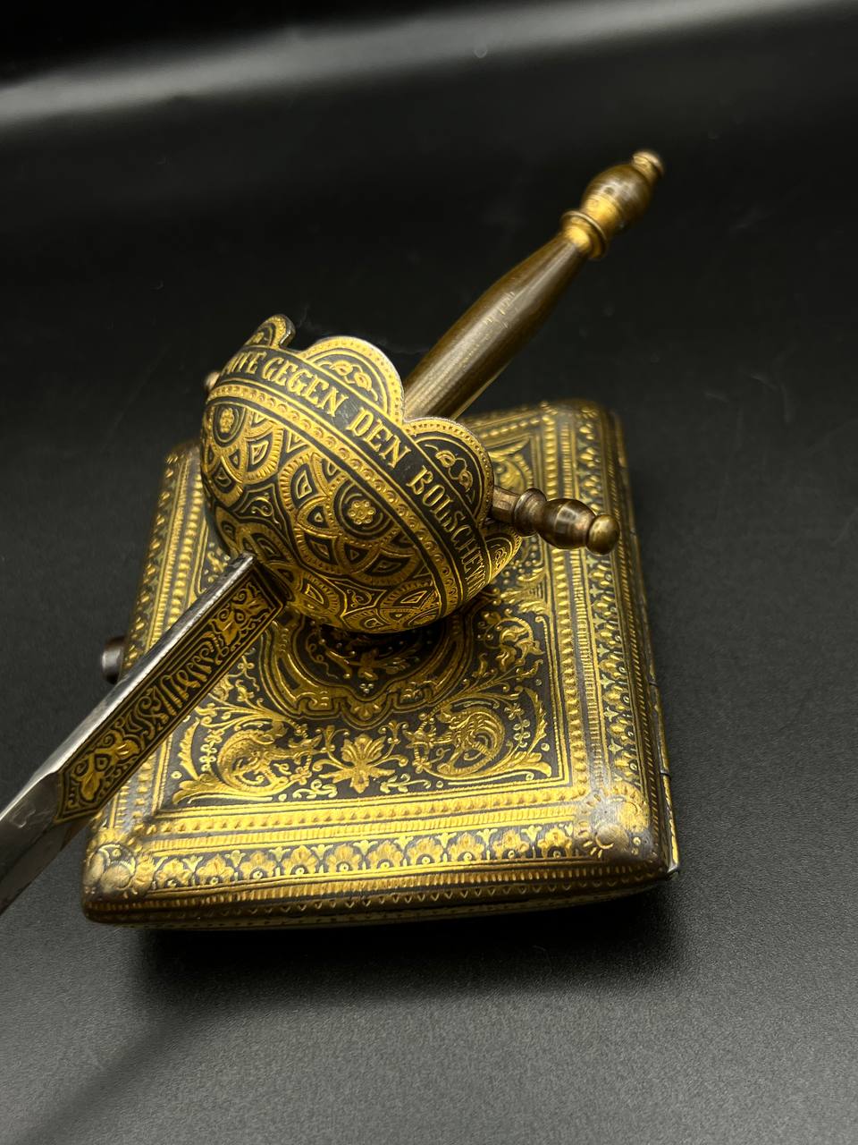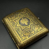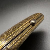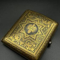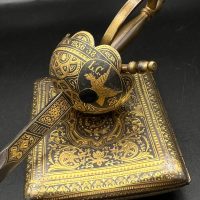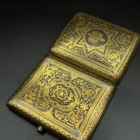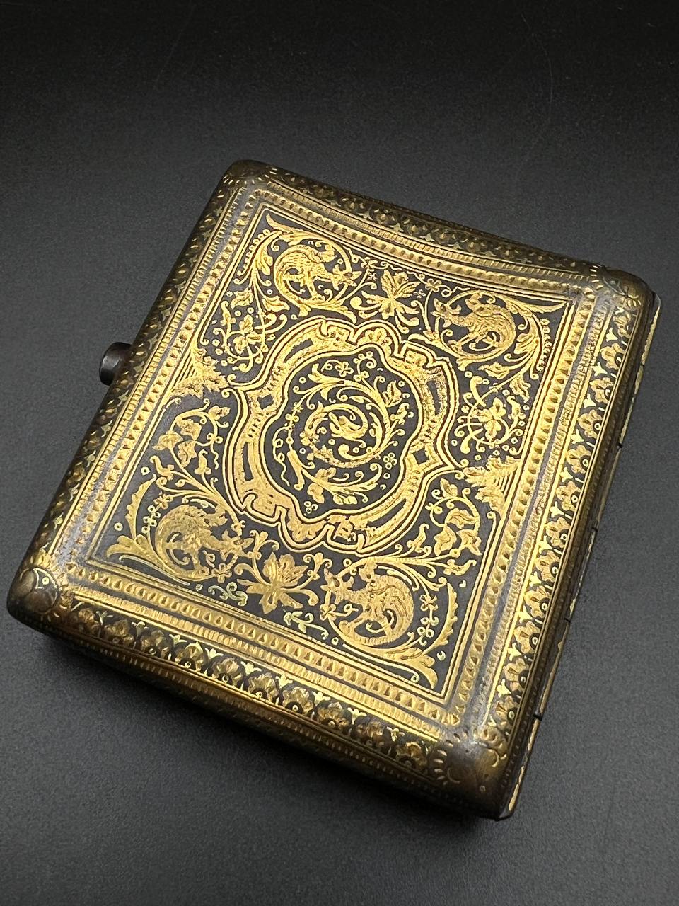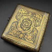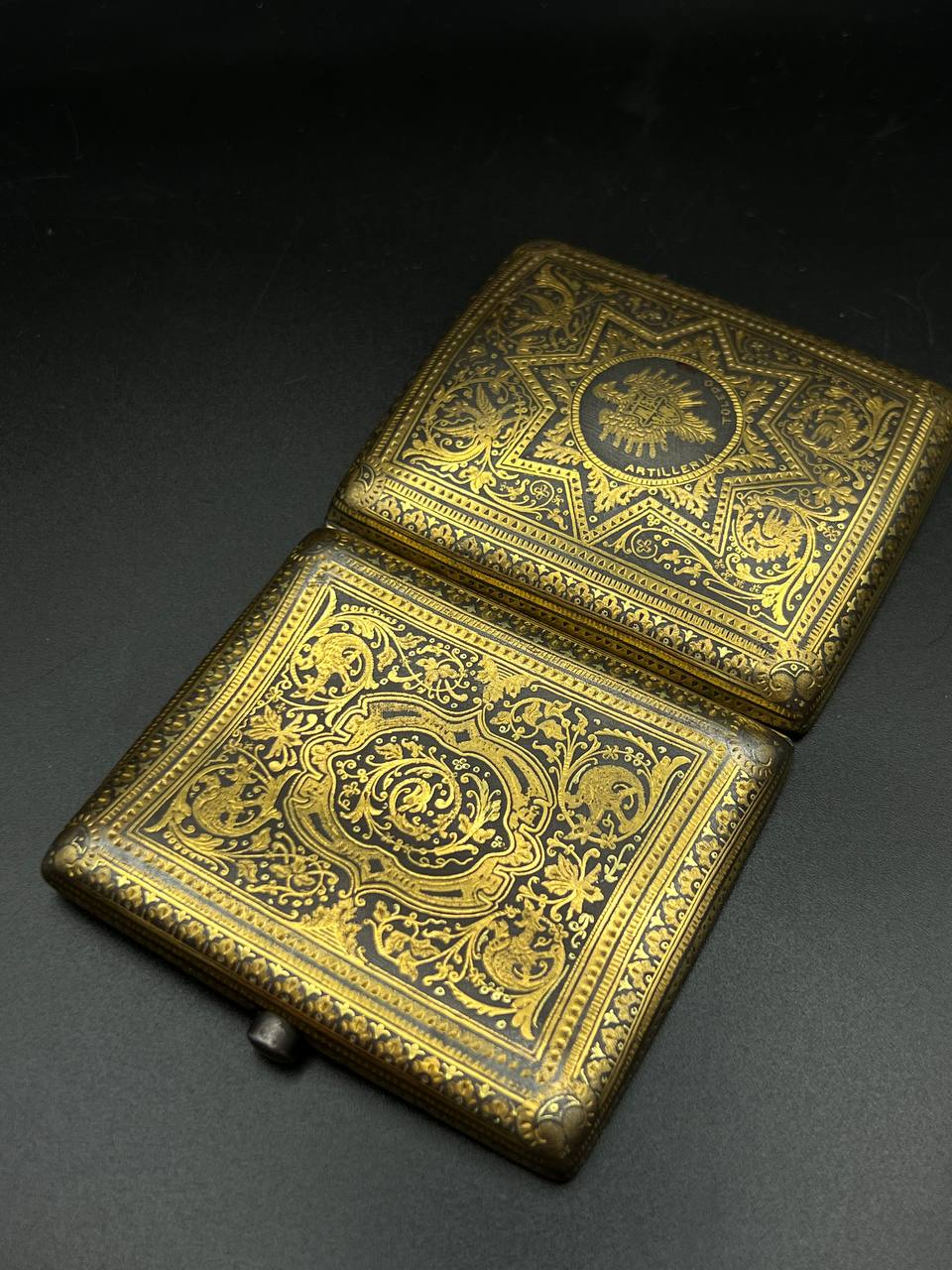 Spanish Toledo damascene set, comprising a decorative dagger letter opener and matching cigarette case. Richly decorated in traditional gold inlay (damascene) technique with intricate floral and geometric motifs.