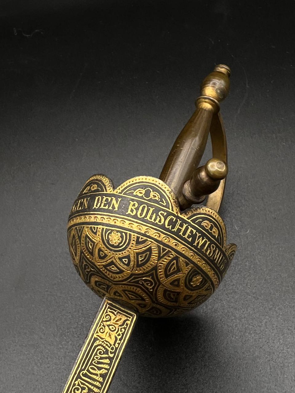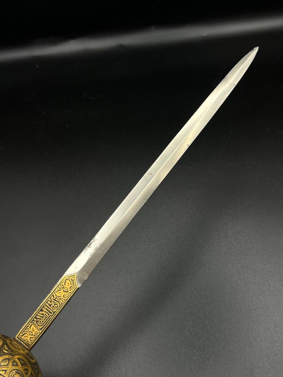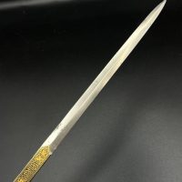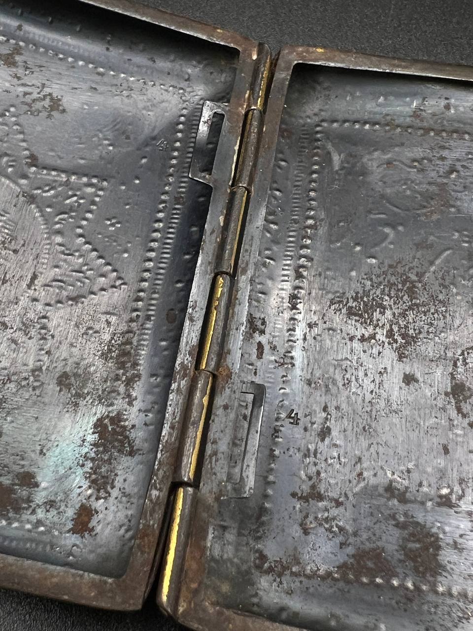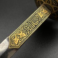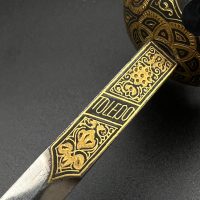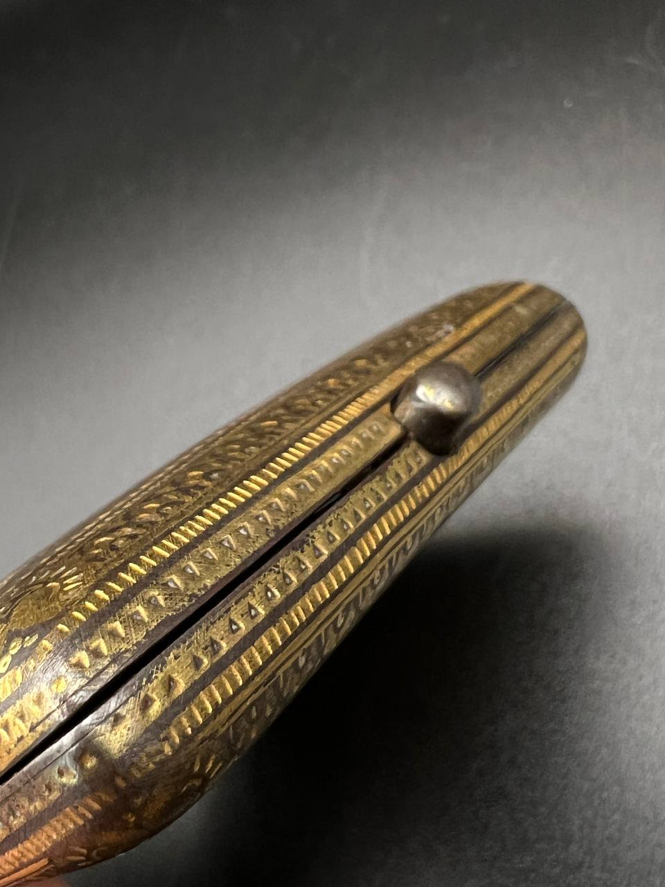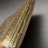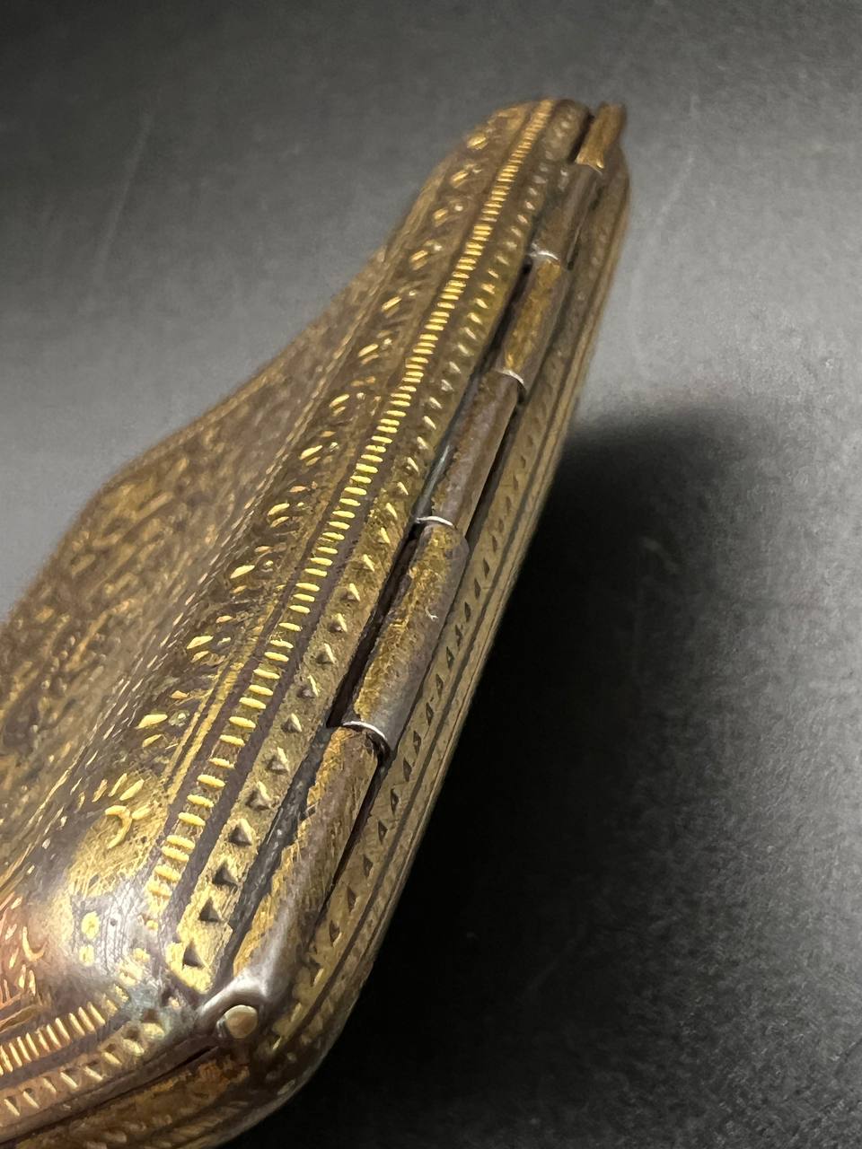 Spanish Toledo damascene set, comprising a decorative dagger letter opener and matching cigarette case. Richly decorated in traditional gold inlay (damascene) technique with intricate floral and geometric motifs.