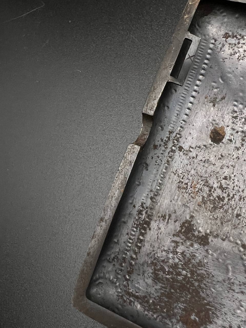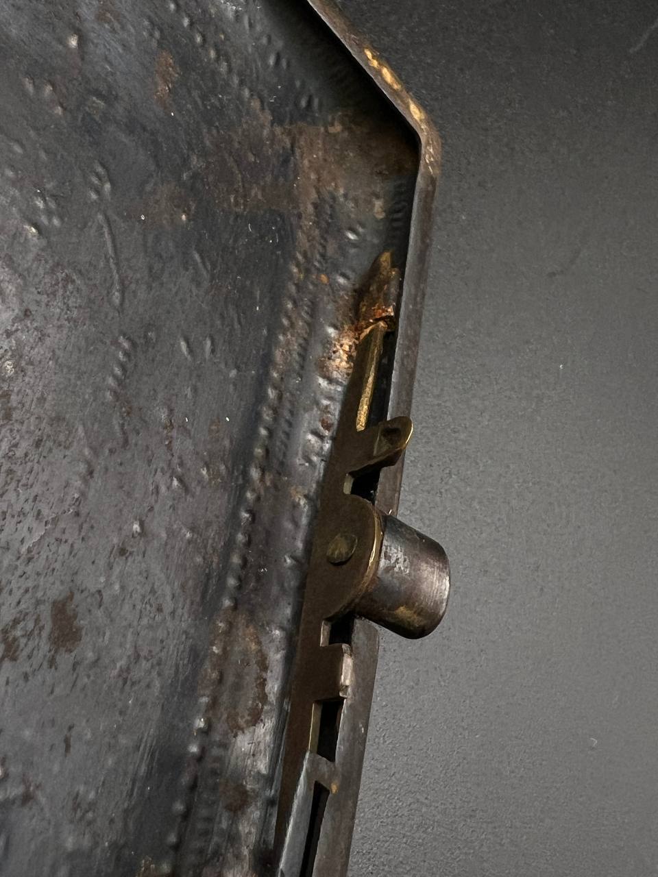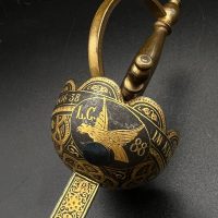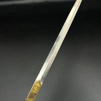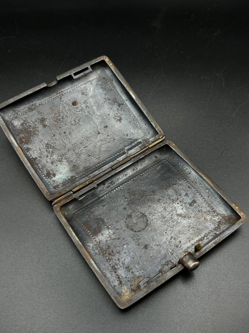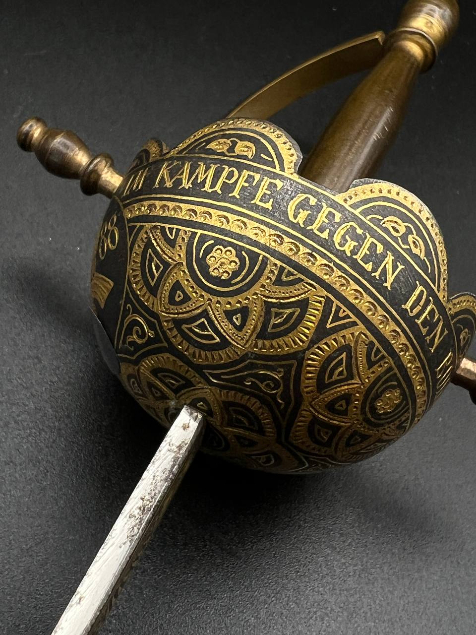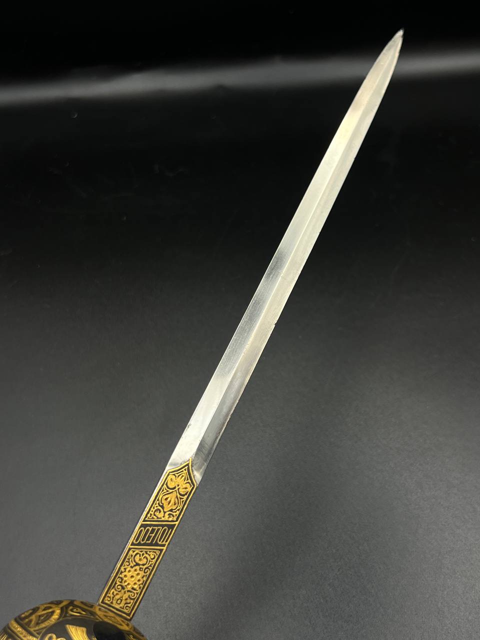 Spanish Toledo damascene set, comprising a decorative dagger letter opener and matching cigarette case. Richly decorated in traditional gold inlay (damascene) technique with intricate floral and geometric motifs.