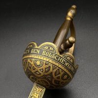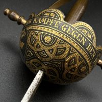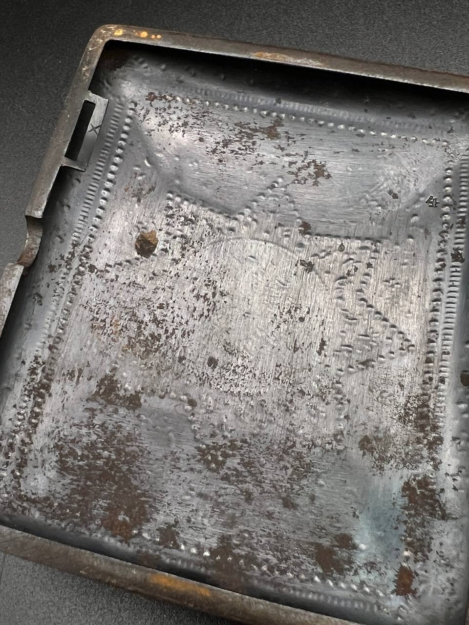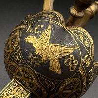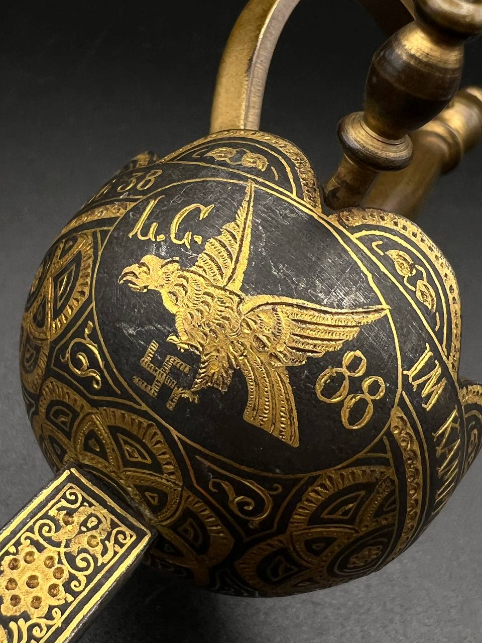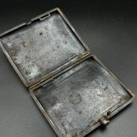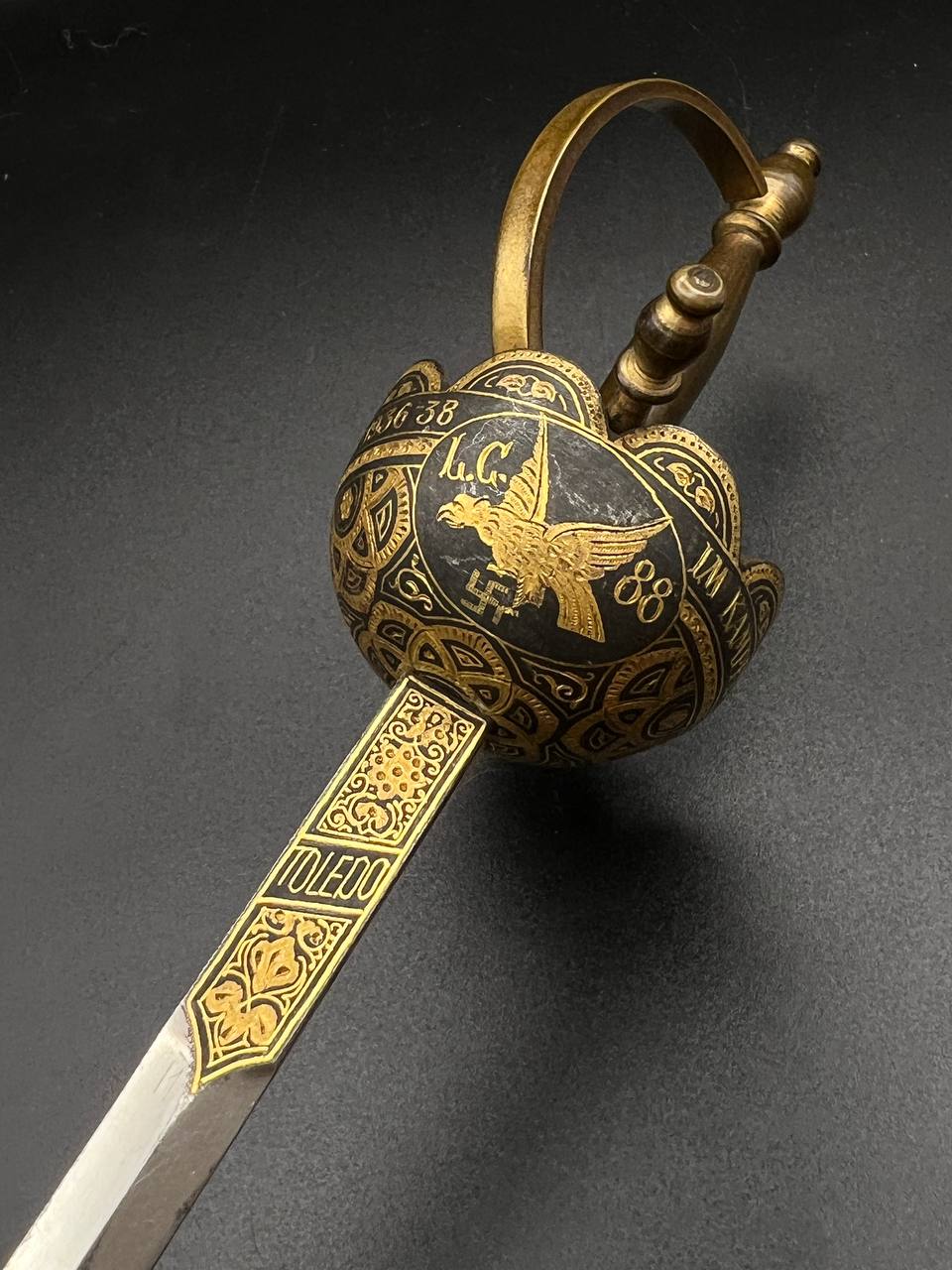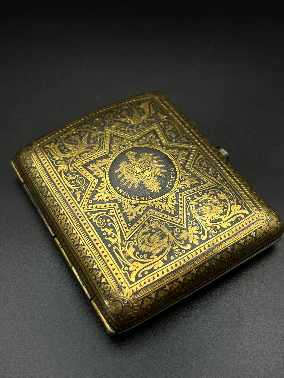 Both pieces feature Luftwaffe-style eagle with swastika, along with inscriptions “Toledo” and “Artilleria,” typical for Toledo workshop production. The dagger has an ornate spherical hilt and finely etched blade, while the cigarette case is fully covered with detailed damascene work.