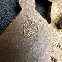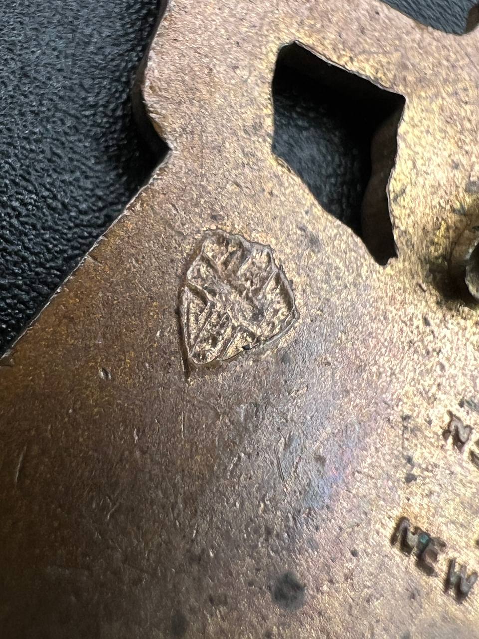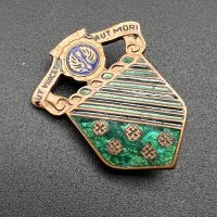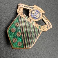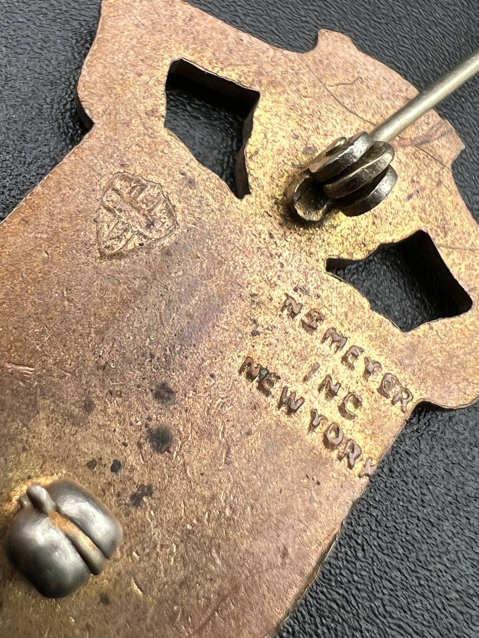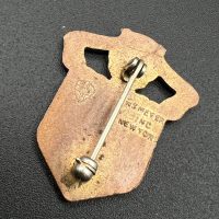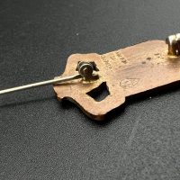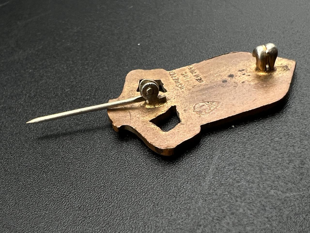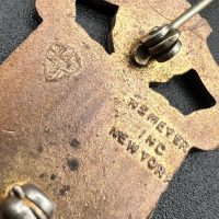 Made of bronze with colored enamel, pin-back fastening, and the maker’s hallmark on the reverse.