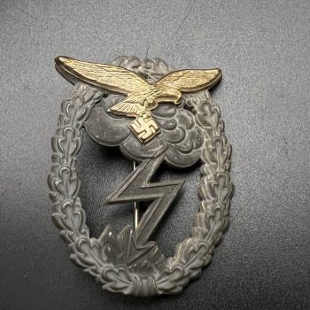$ 900 fee: 22.5%An early Luftwaffe Air Gunner Badge manufactured by Wilhelm Deumer, Lüdenscheid. The oval wreath is struck in a silvered alloy, while the eagle is produced in dark oxidized zinc with the crisp detailing typical for Deumer—distinct beak, sharply cut wings, and well-defined talons. The reverse bears the clear maker’s mark “W. DEUMER LÜDENSCHEID.”
