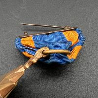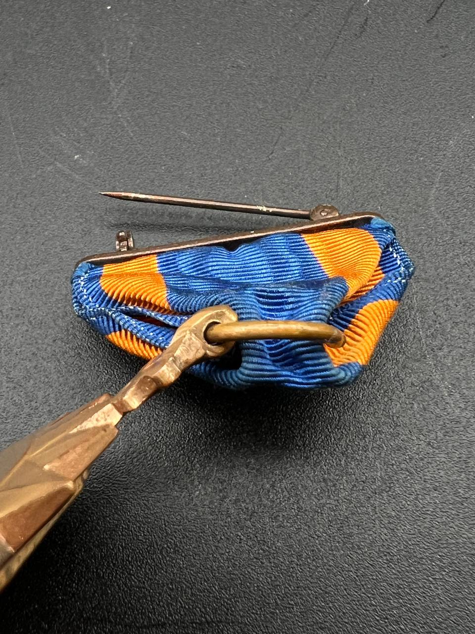 The obverse depicts an eagle in flight clutching lightning bolts against a radiant sun — a symbol of the speed and power of aviation. The reverse is plain, without inscriptions. The ribbon is blue with orange central and edge stripes, mounted on its original pinback.