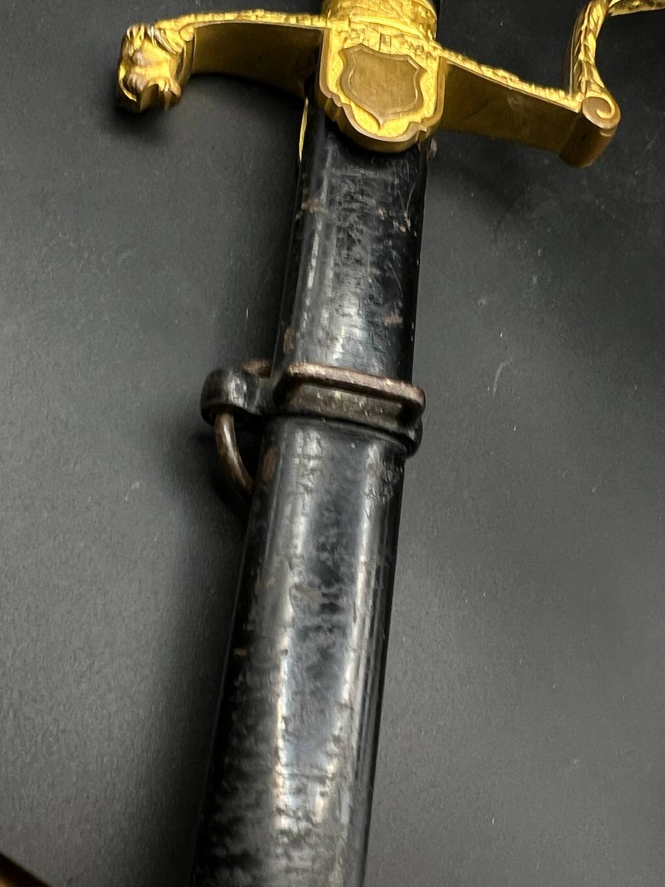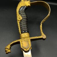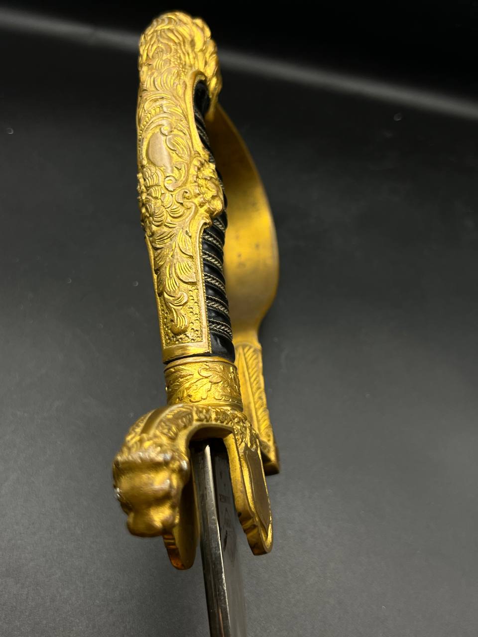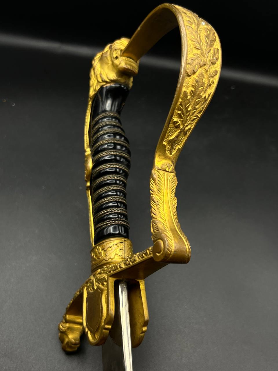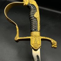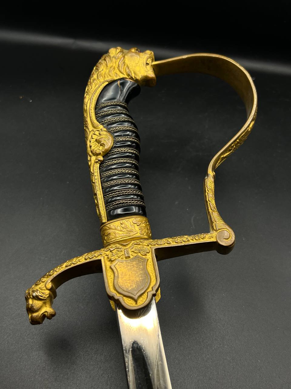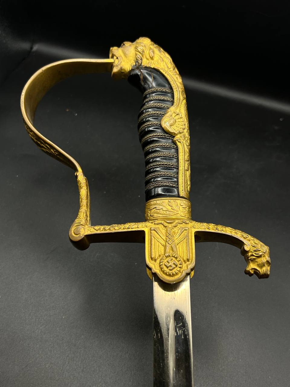 Heer officer’s Lionhead saber by Puma, Solingen. Gilt fittings, Heer eagle on the crossguard, black wired grip showing surface cracks. Chrome-plated etched blade, original steel scabbard with period wear.