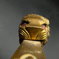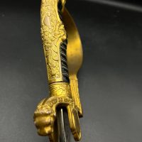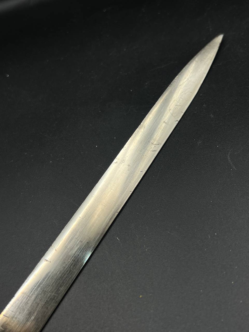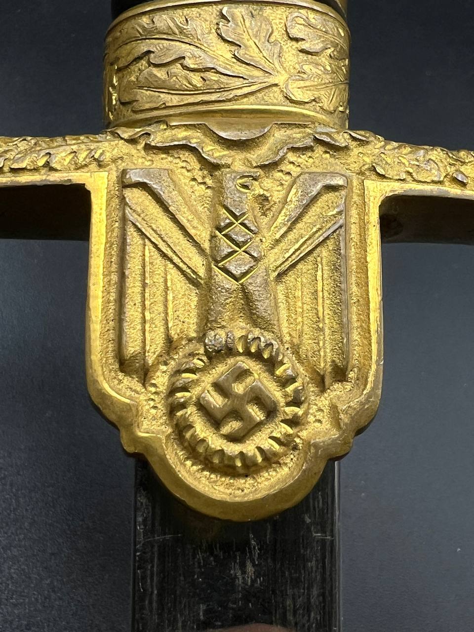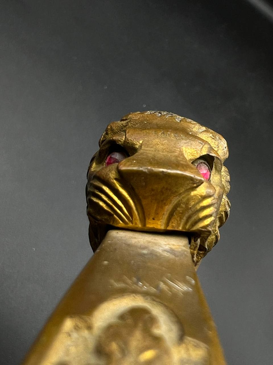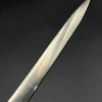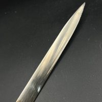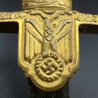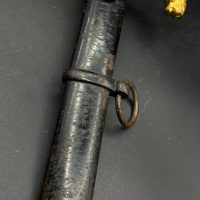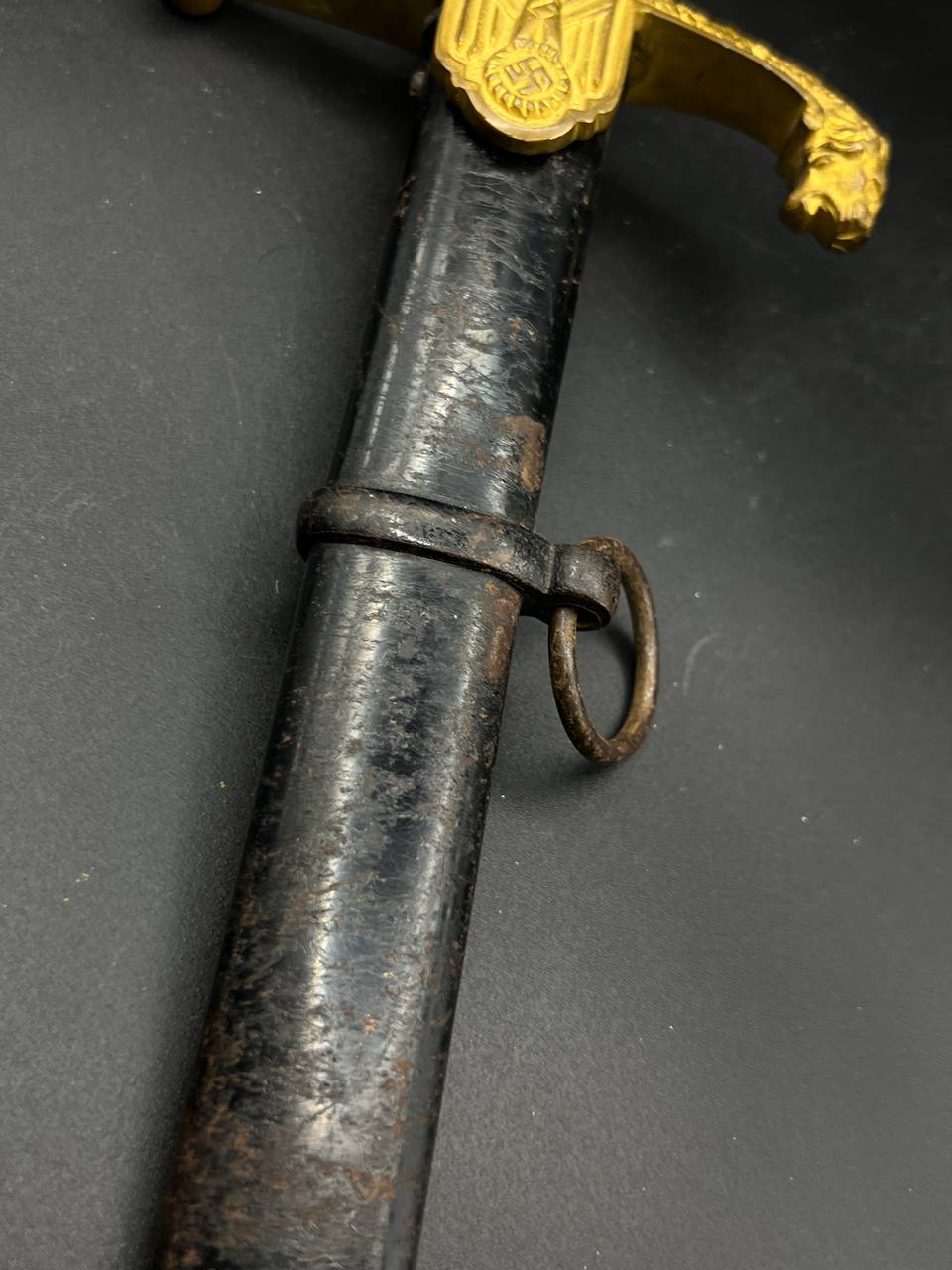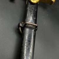 Heer officer’s Lionhead saber by Puma, Solingen. Gilt fittings, Heer eagle on the crossguard, black wired grip showing surface cracks. Chrome-plated etched blade, original steel scabbard with period wear.