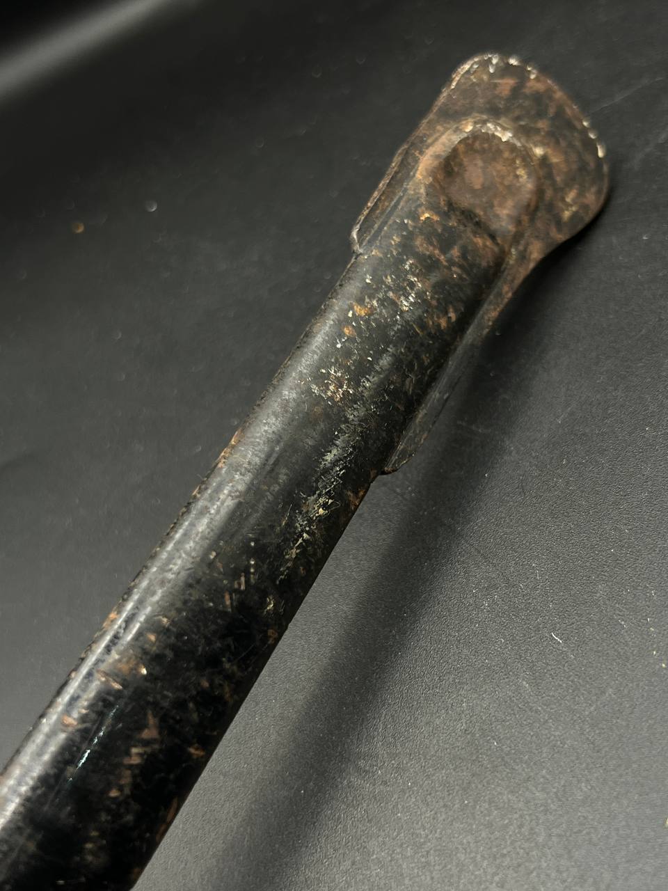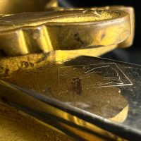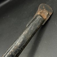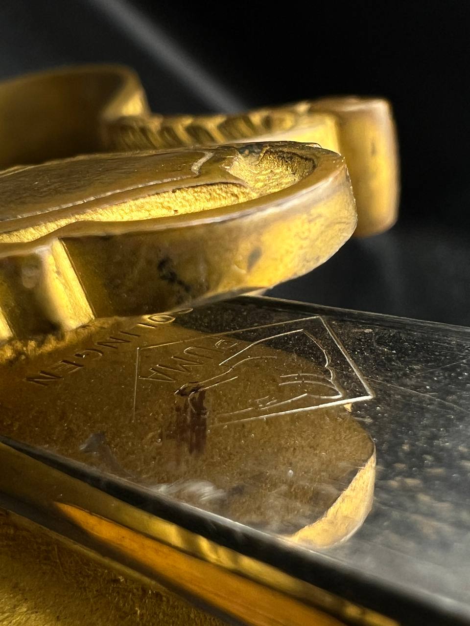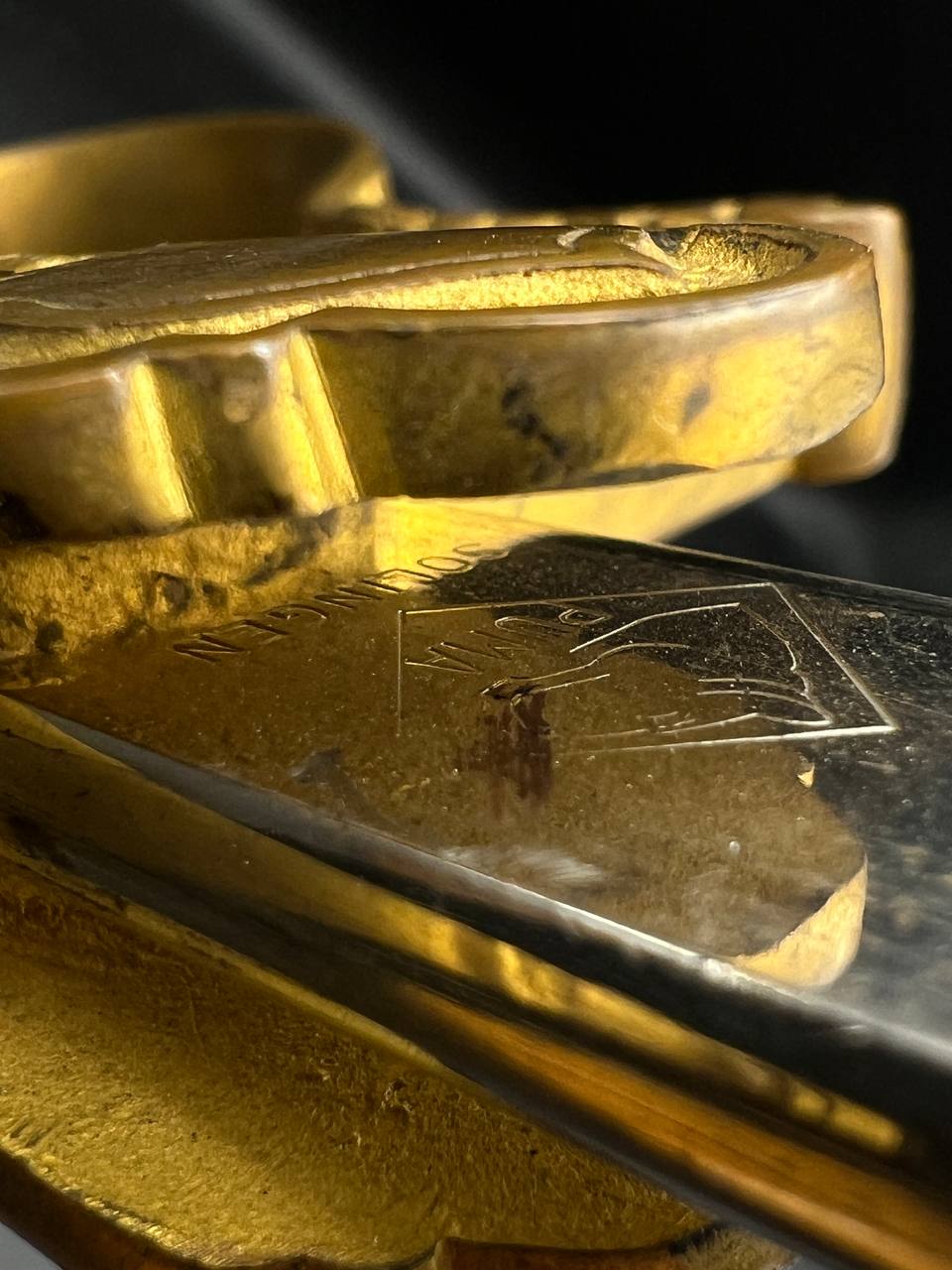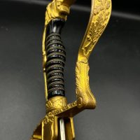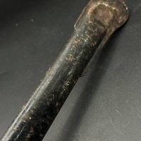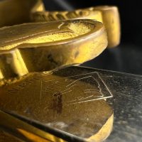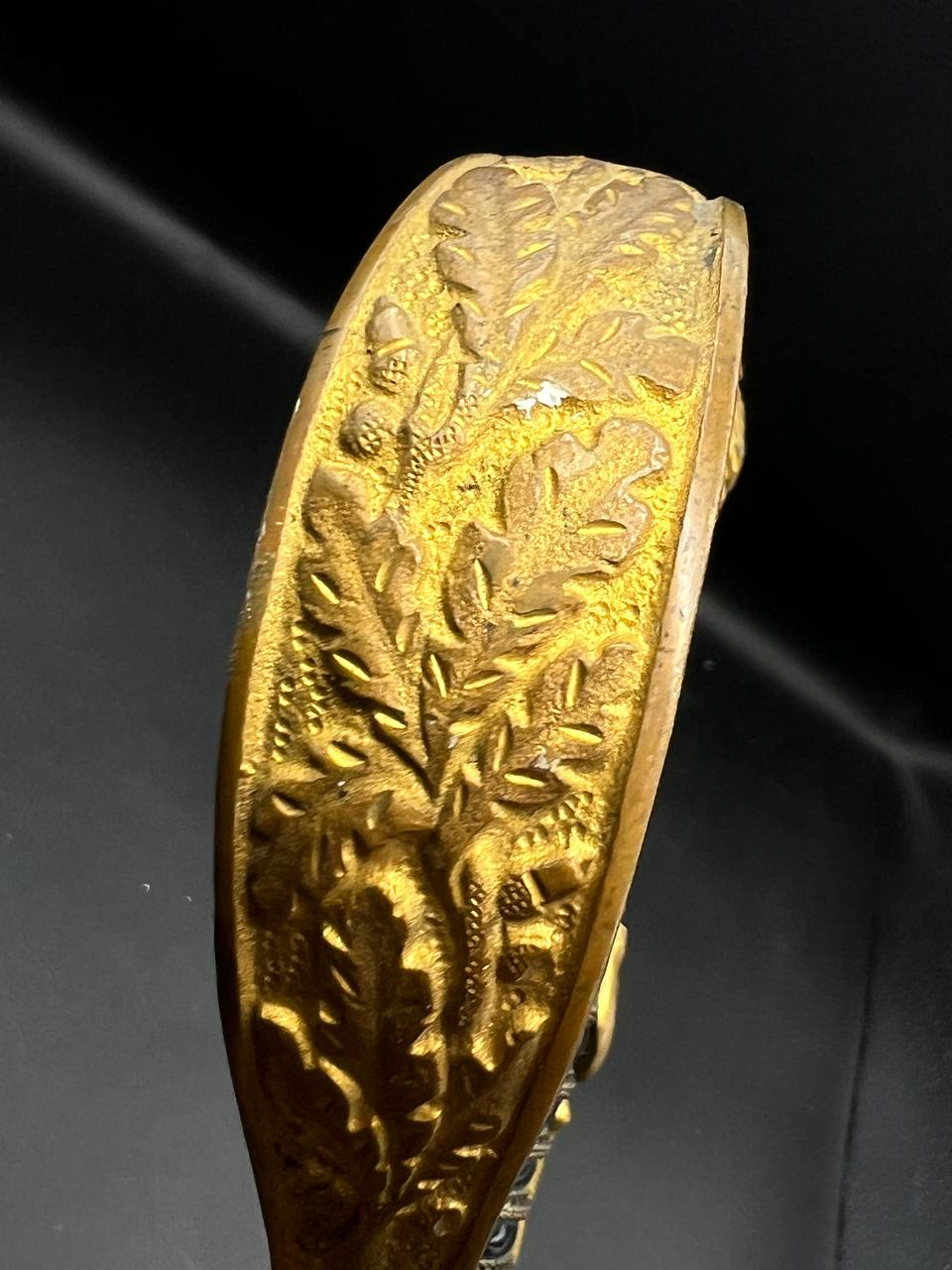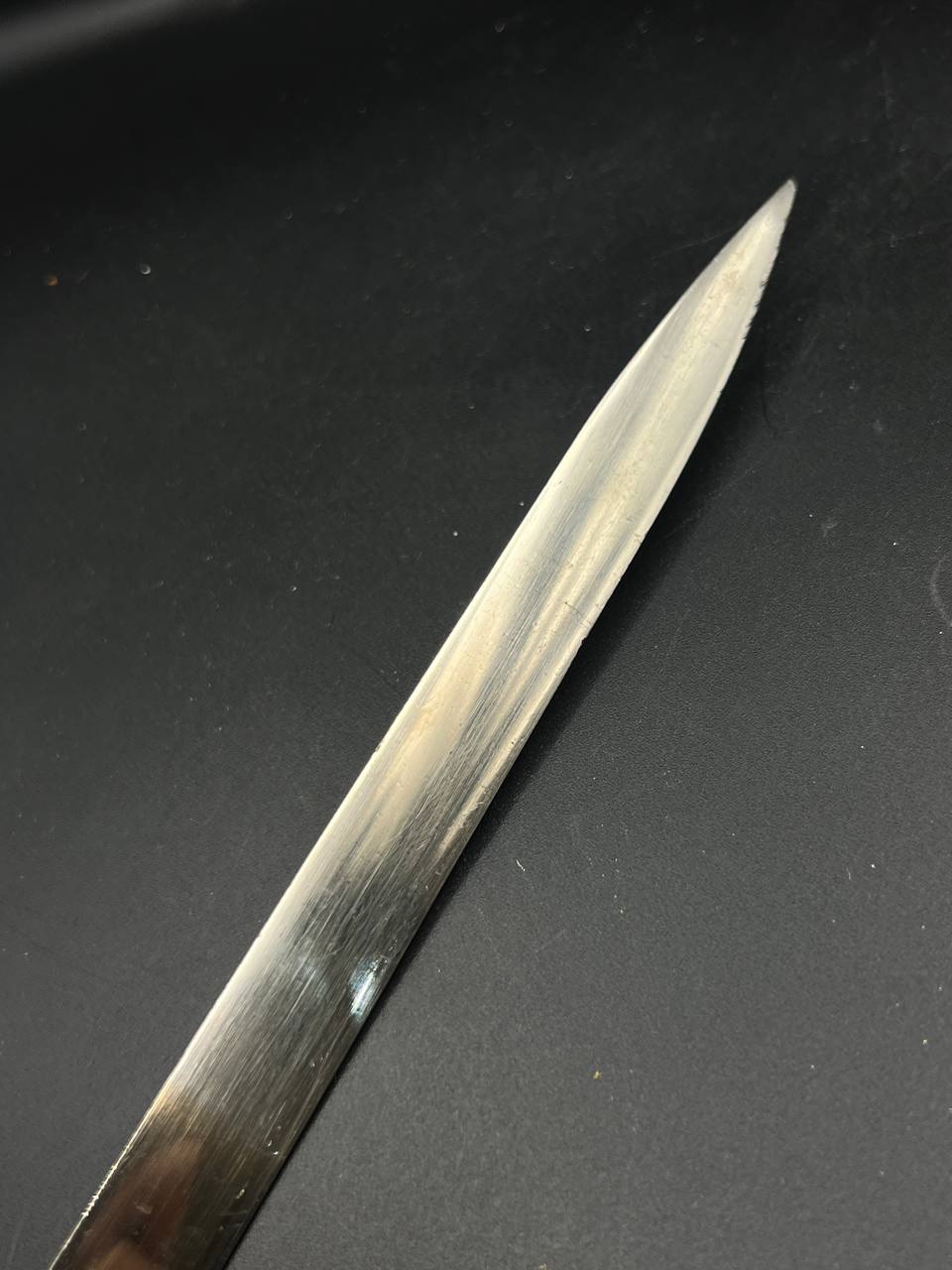 Heer officer’s Lionhead saber by Puma, Solingen. Gilt fittings, Heer eagle on the crossguard, black wired grip showing surface cracks. Chrome-plated etched blade, original steel scabbard with period wear.