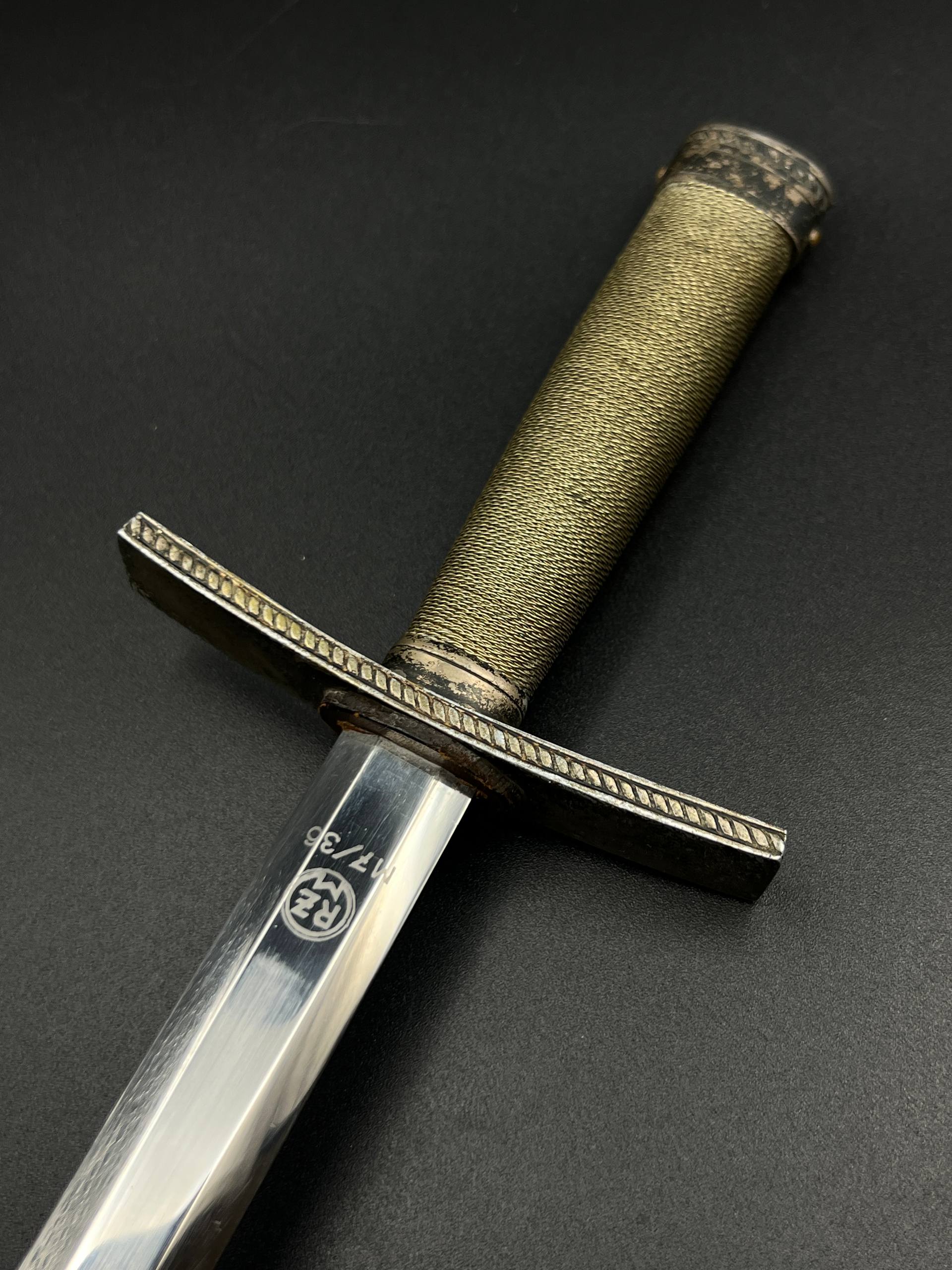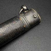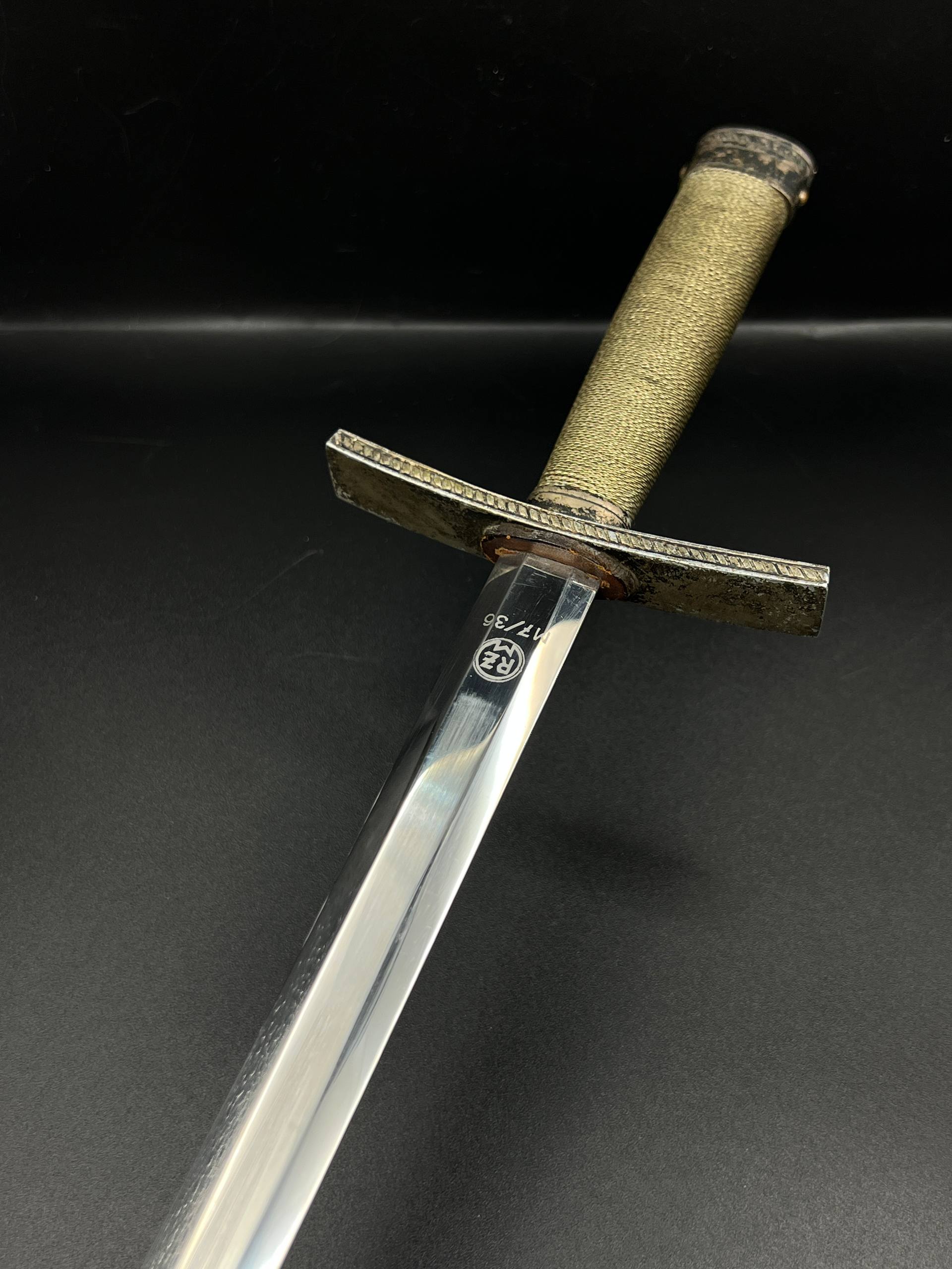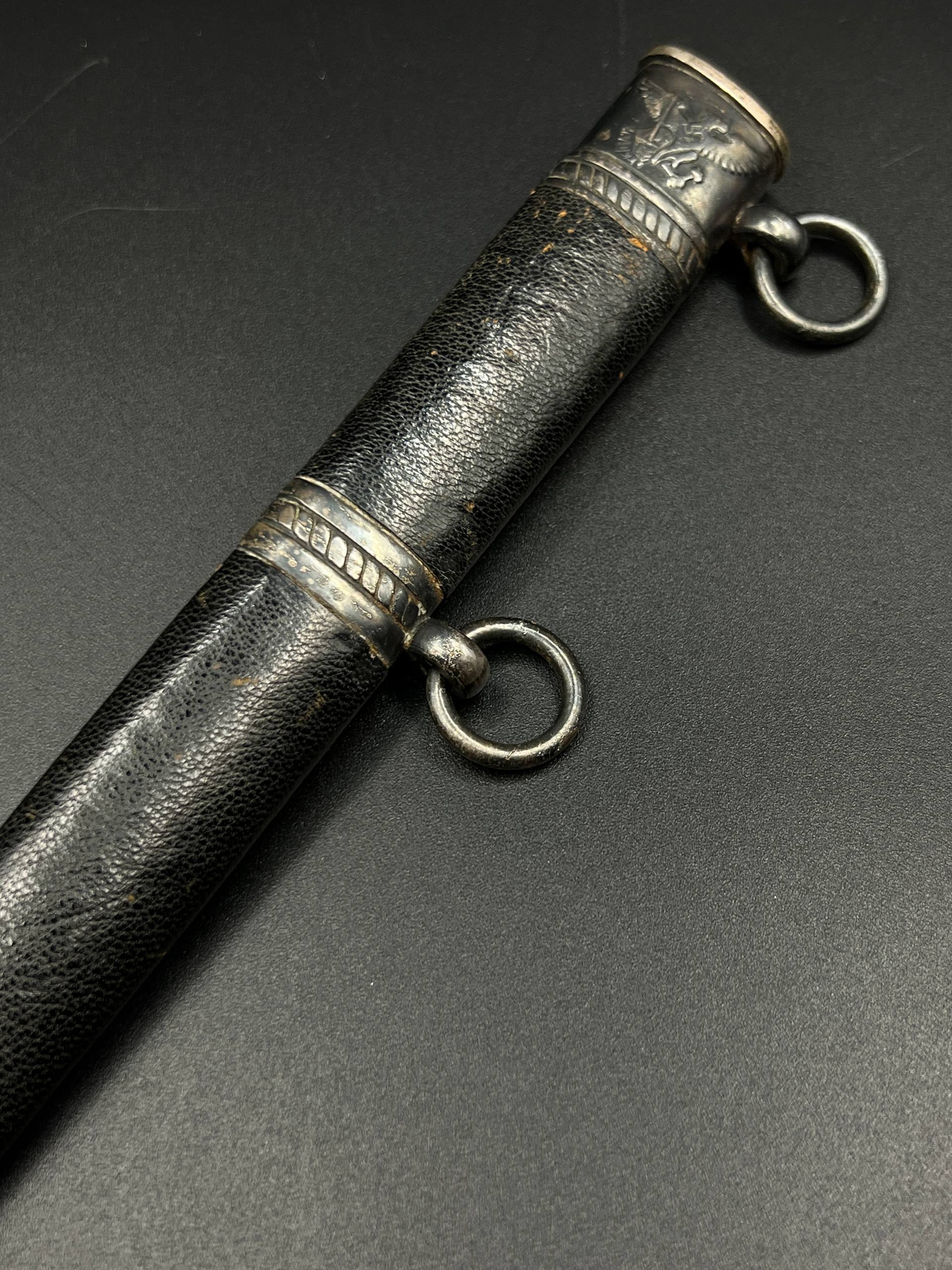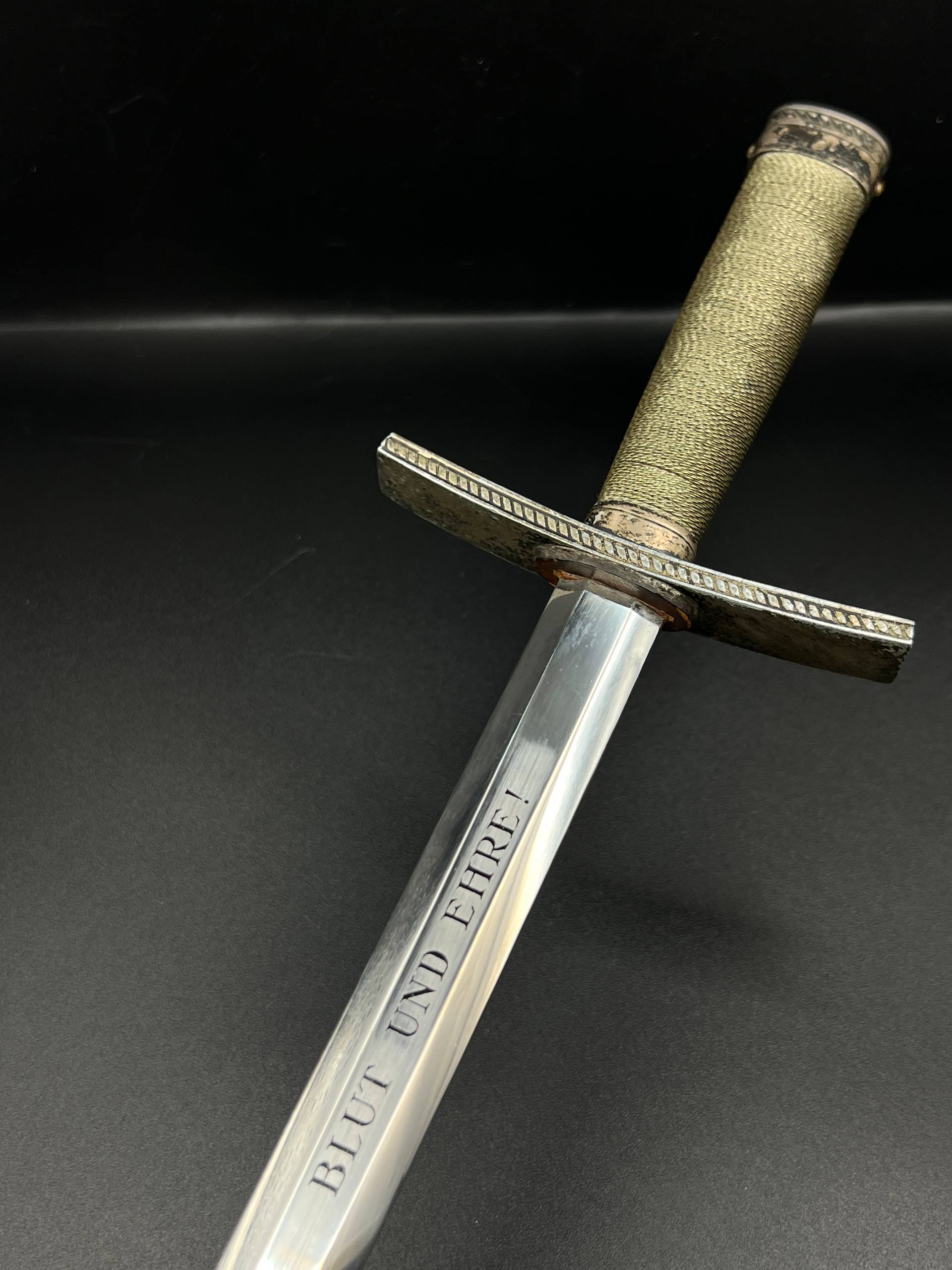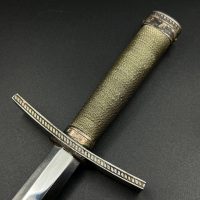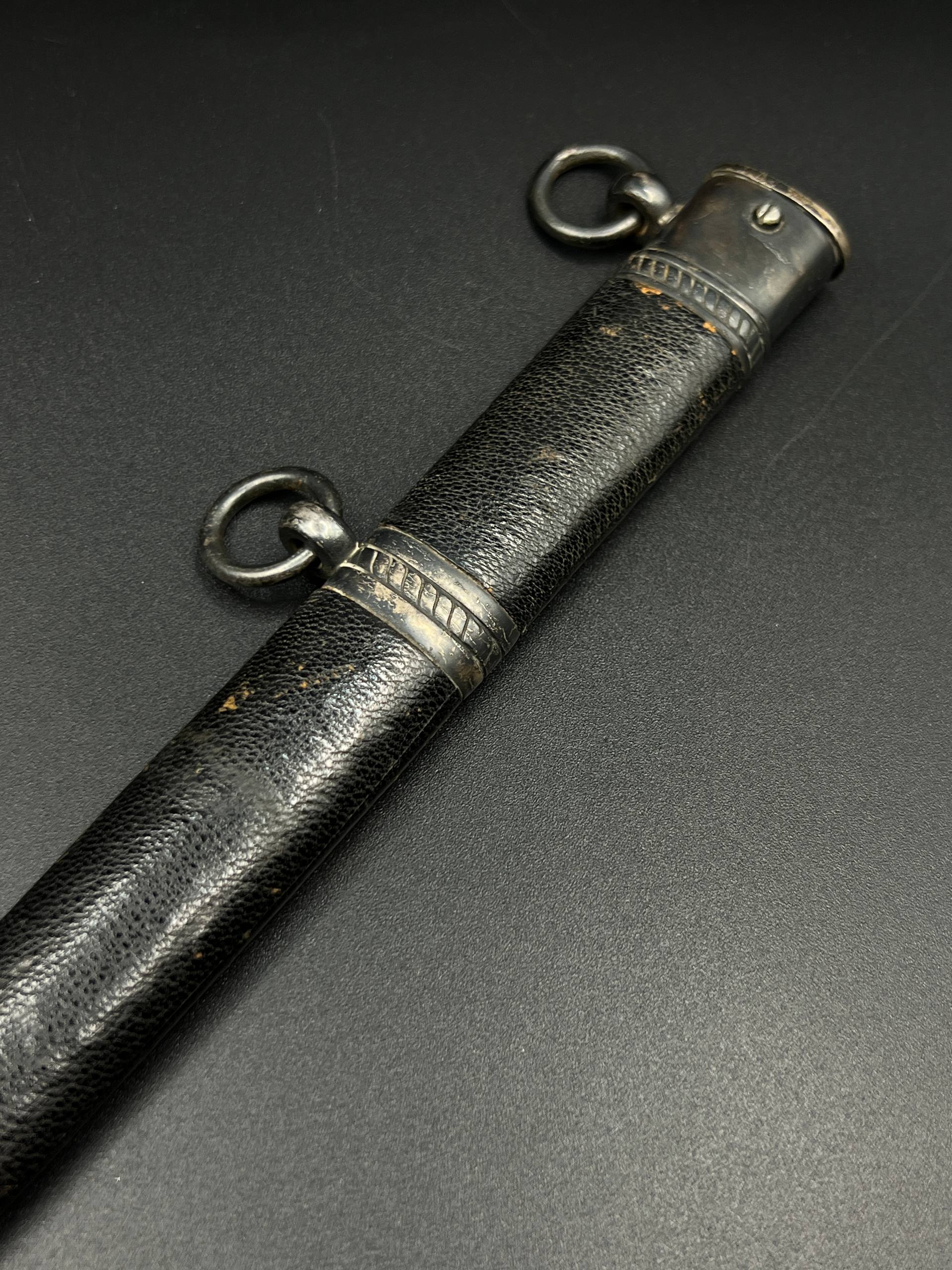 Outstanding example with a minty blade that shows a bright finish and a dark motto and maker mark of M7/36 for Horster. The grip is near perfect and the pommel cross guard and scabbard fittings all have a dark matching patina. The leather is solid, with very minimal bubbling and no scuffs or tears. Hard to find these model daggers these days especially clean ones.
