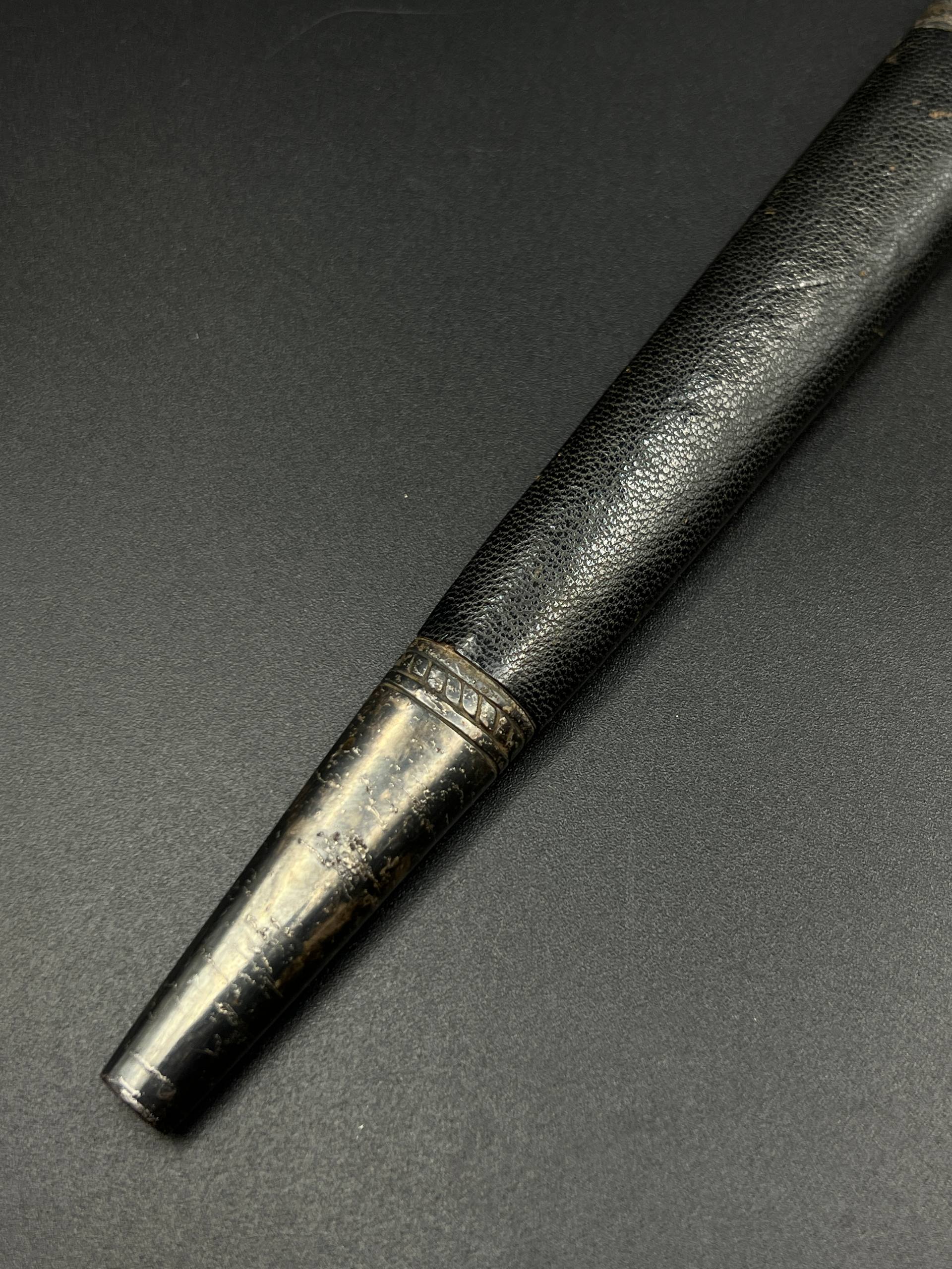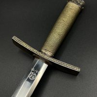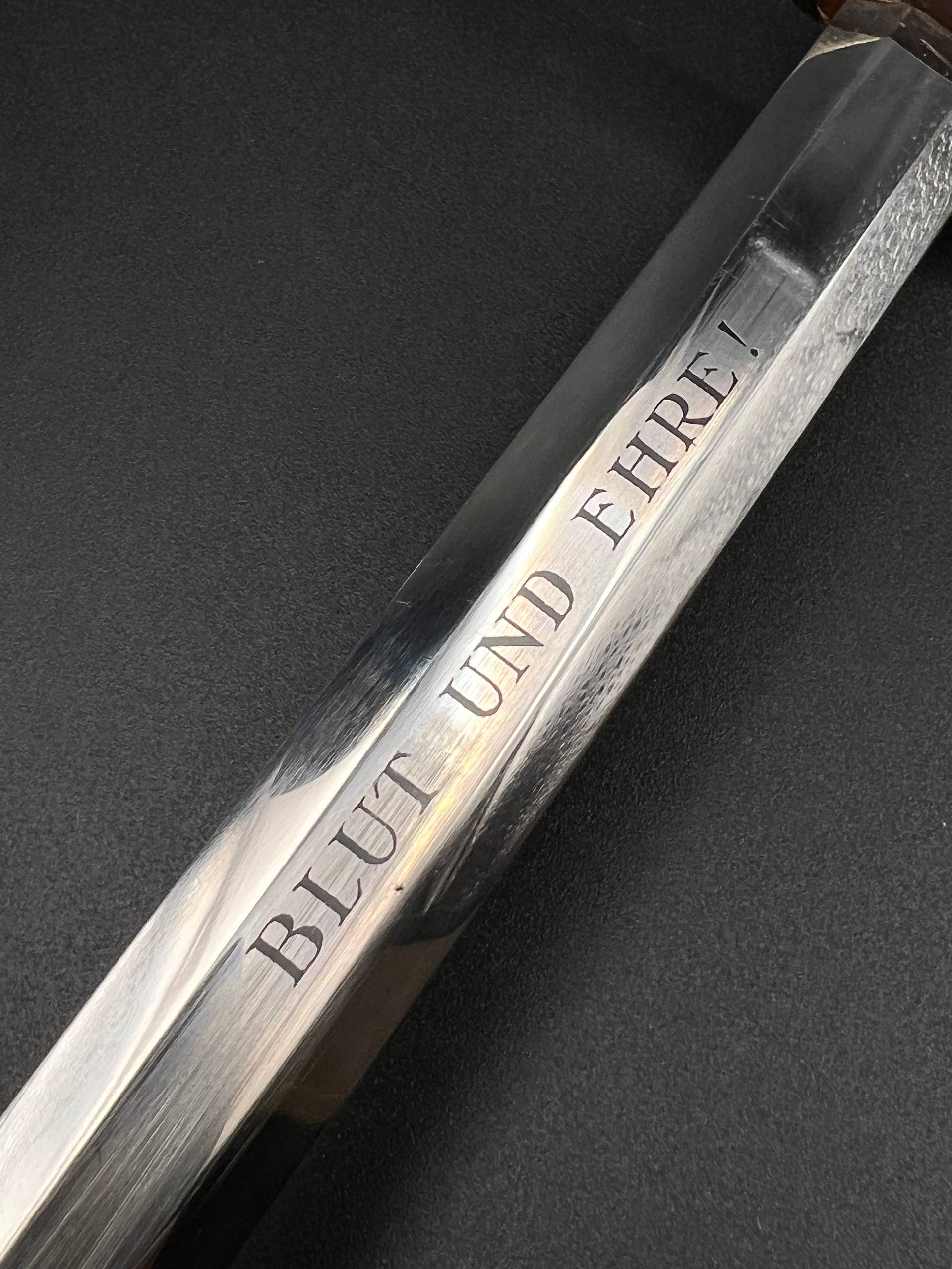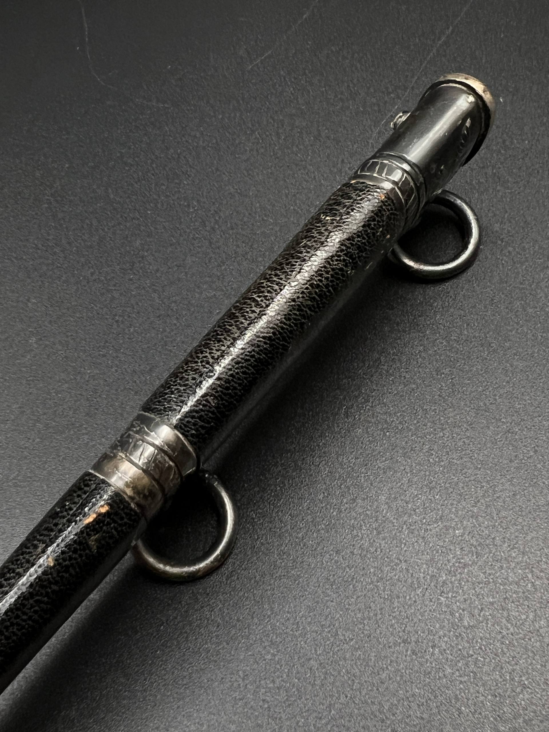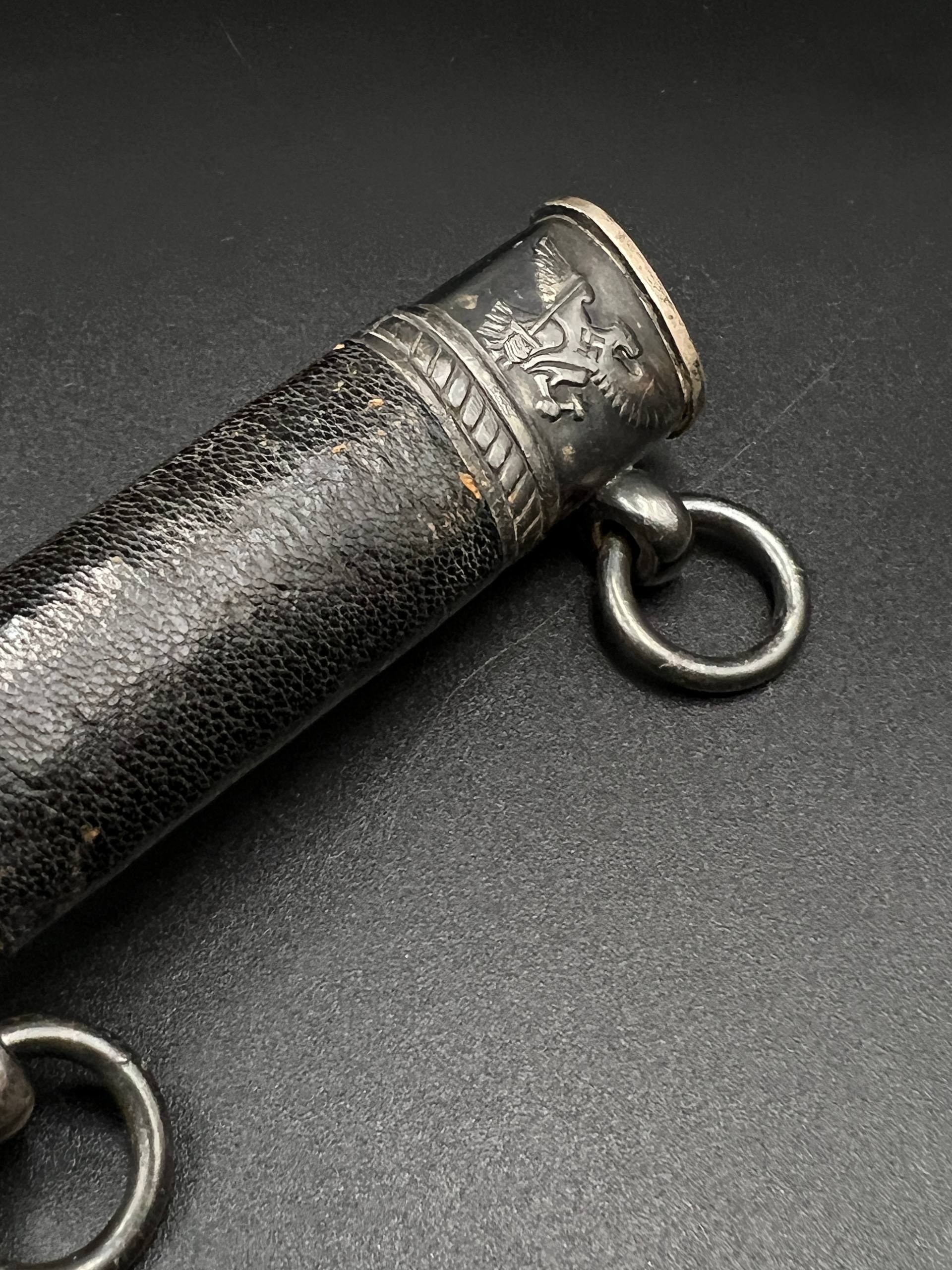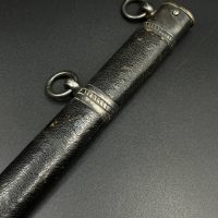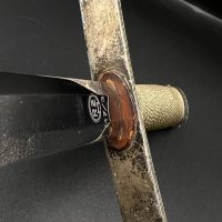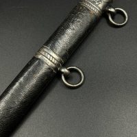 Outstanding example with a minty blade that shows a bright finish and a dark motto and maker mark of M7/36 for Horster. The grip is near perfect and the pommel cross guard and scabbard fittings all have a dark matching patina. The leather is solid, with very minimal bubbling and no scuffs or tears. Hard to find these model daggers these days especially clean ones.