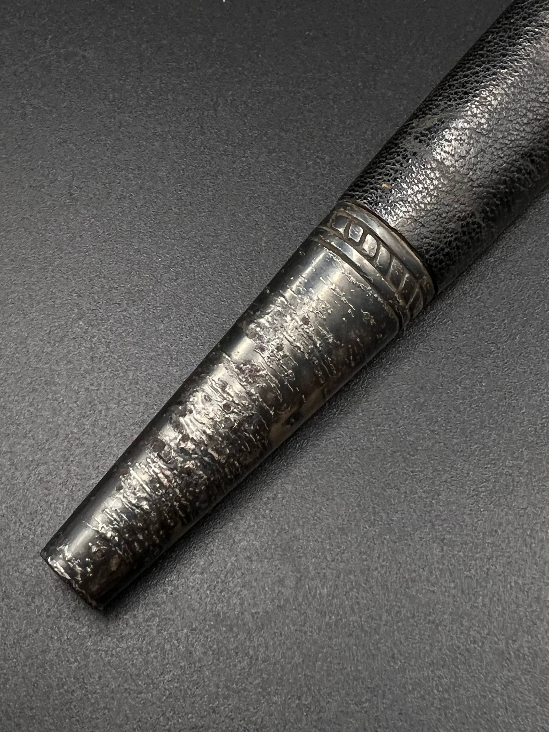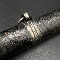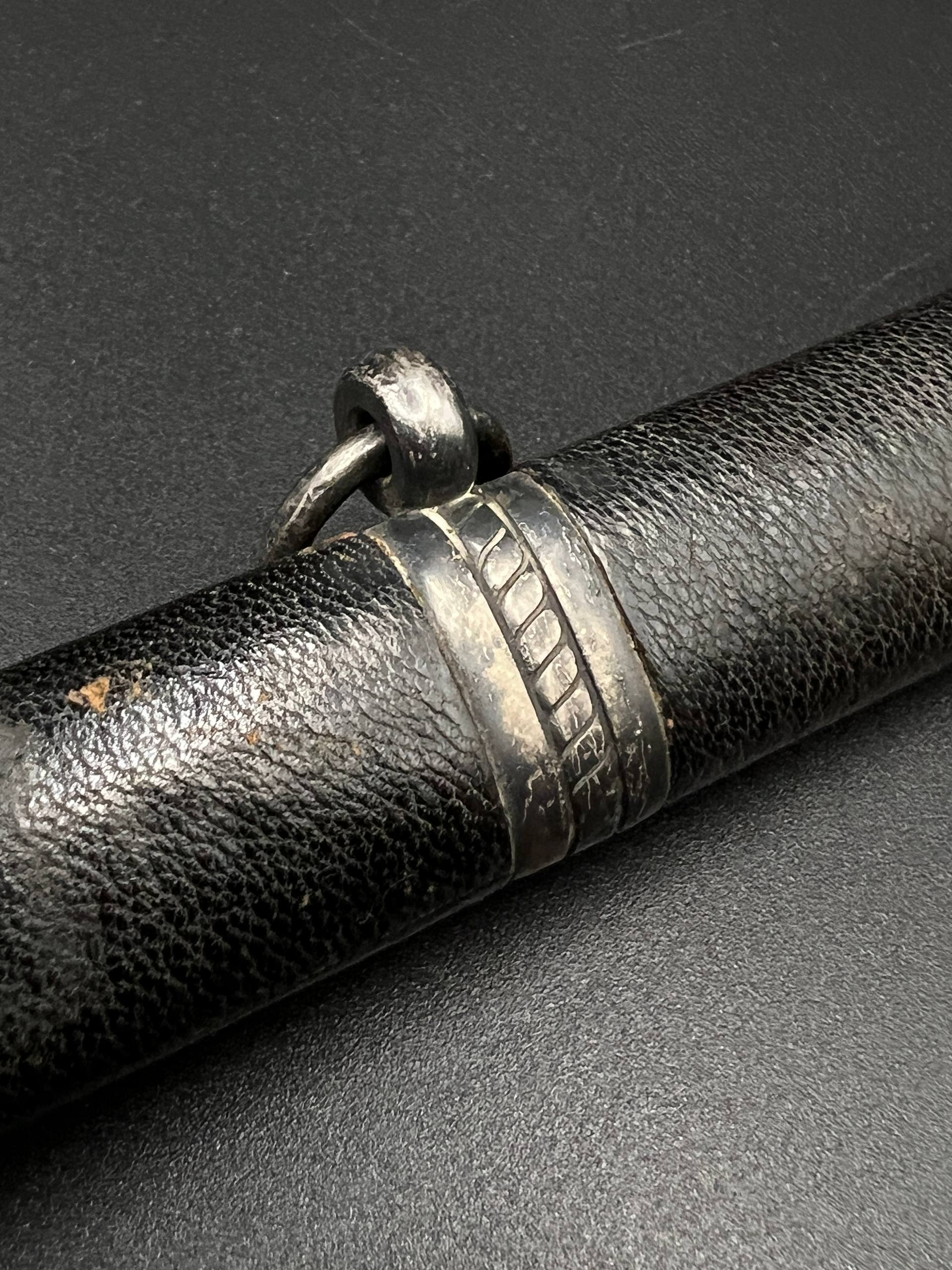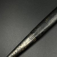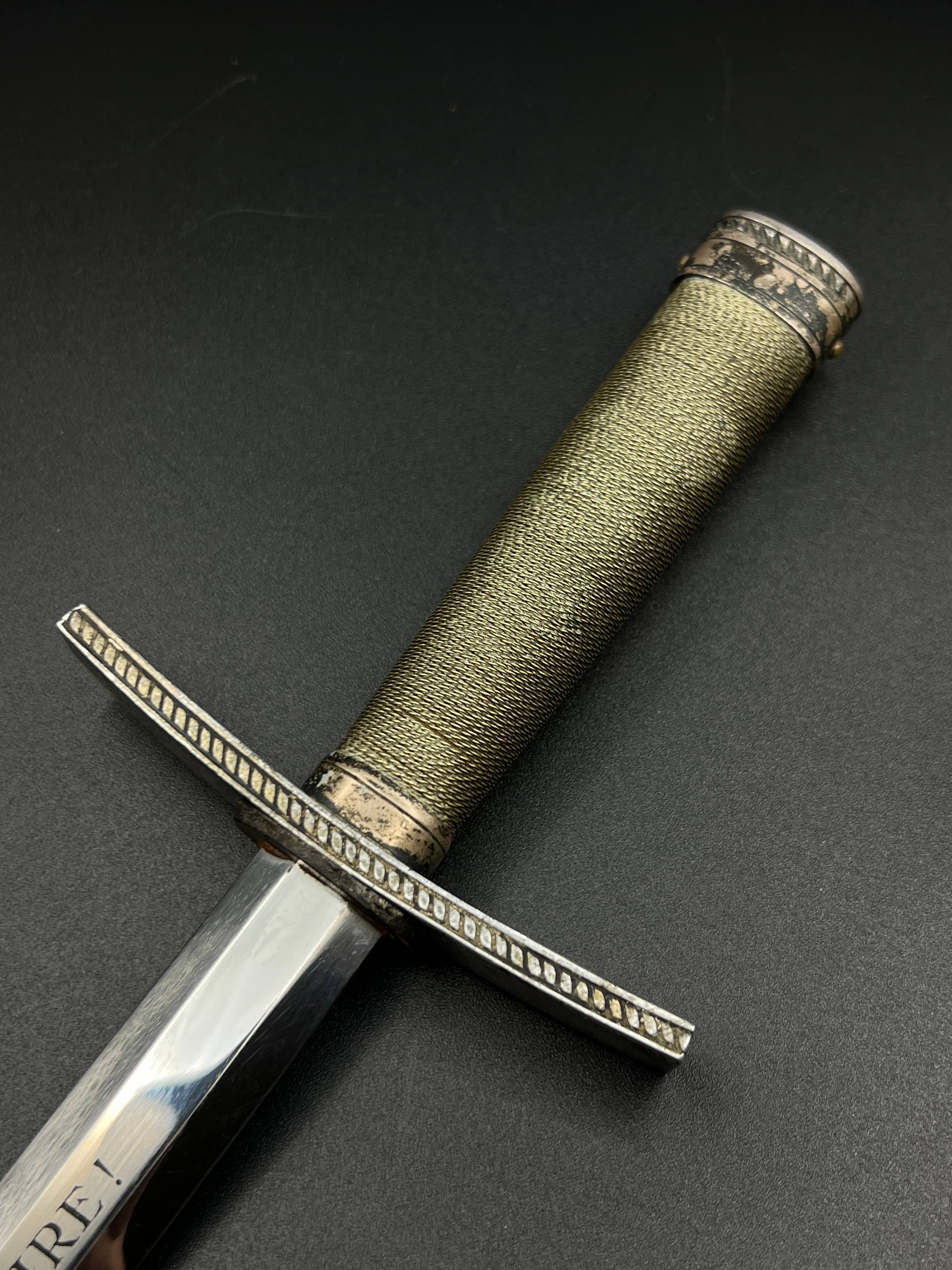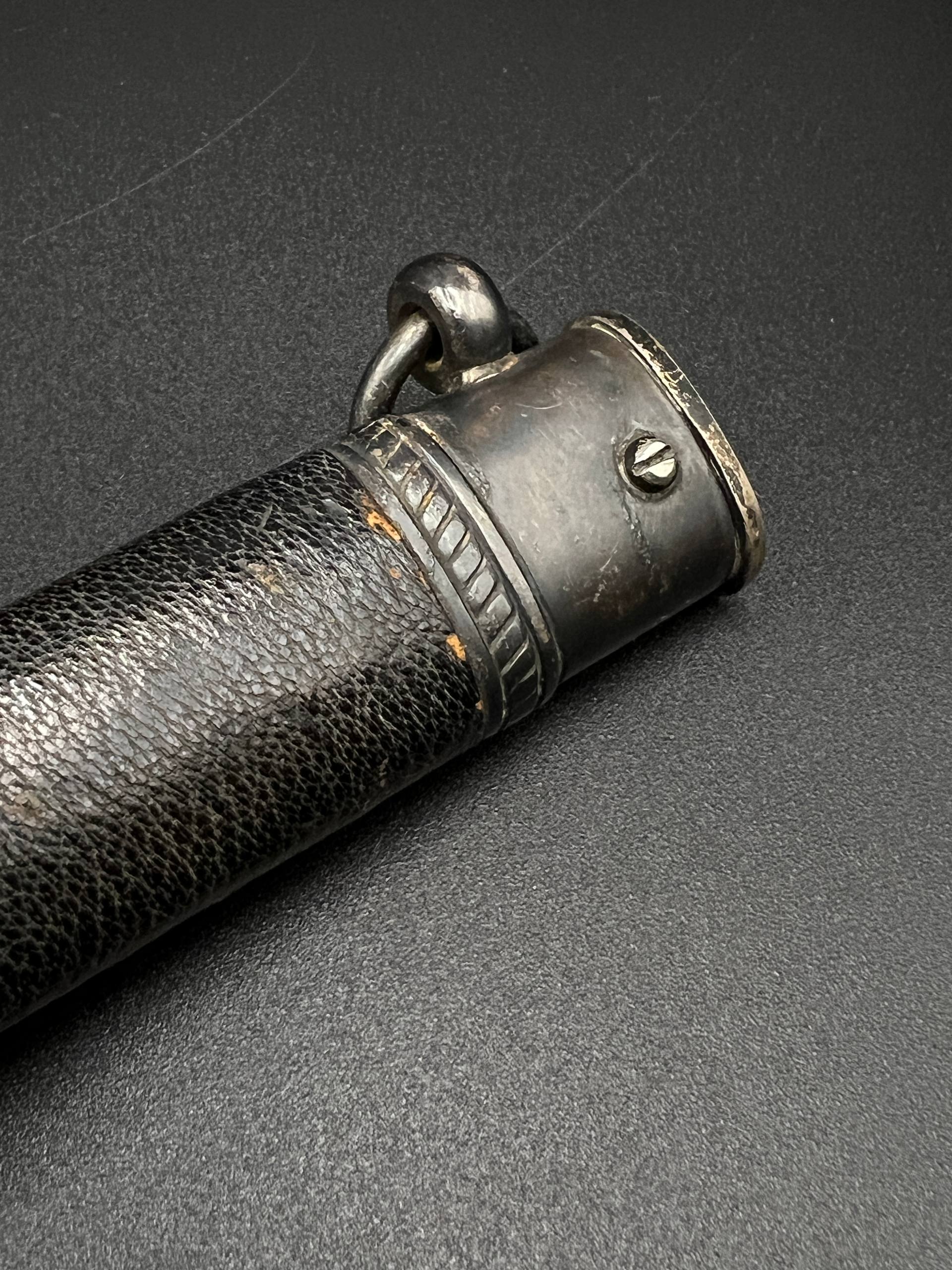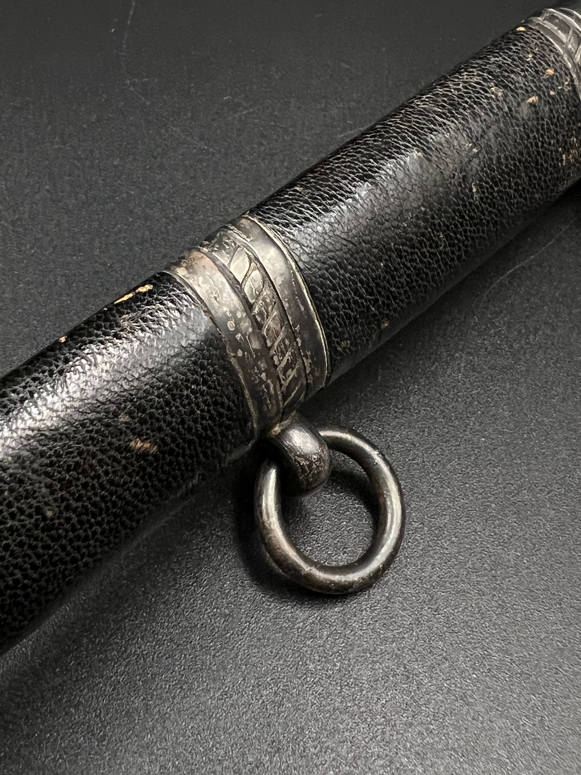Outstanding example with a minty blade that shows a bright finish and a dark motto and maker mark of M7/36 for Horster. The grip is near perfect and the pommel cross guard and scabbard fittings all have a dark matching patina. The leather is solid, with very minimal bubbling and no scuffs or tears. Hard to find these model daggers these days especially clean ones.