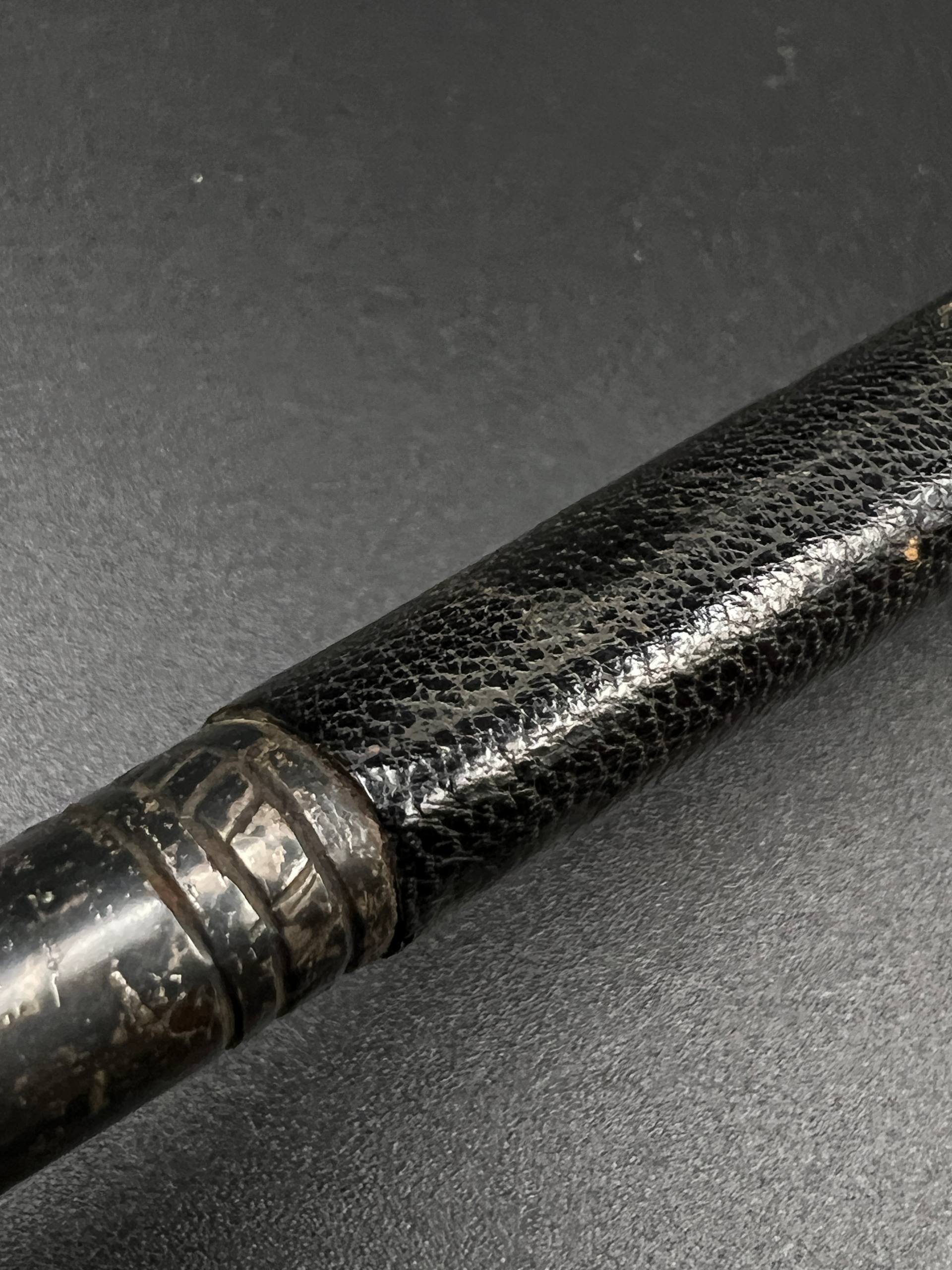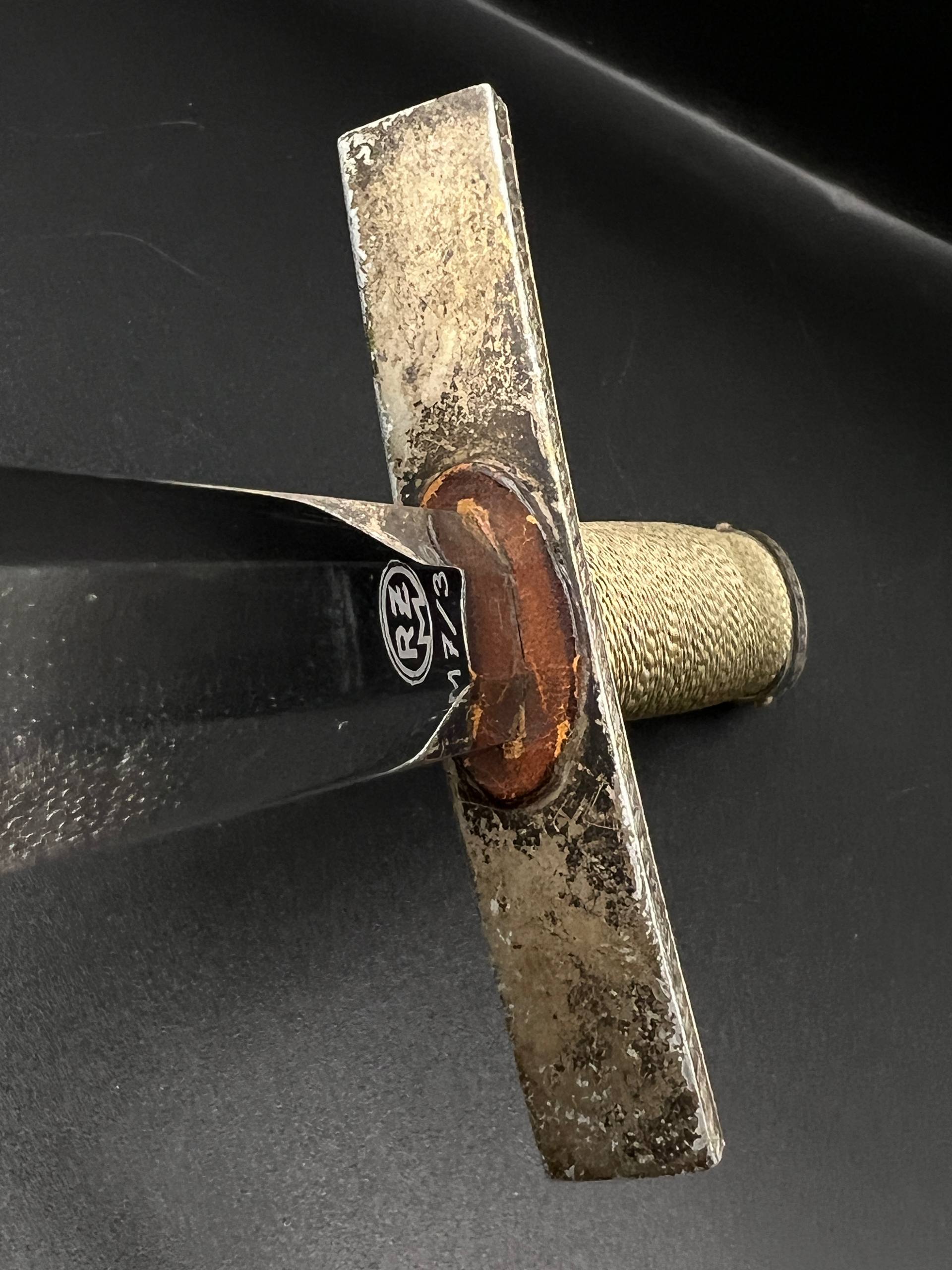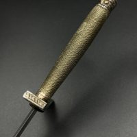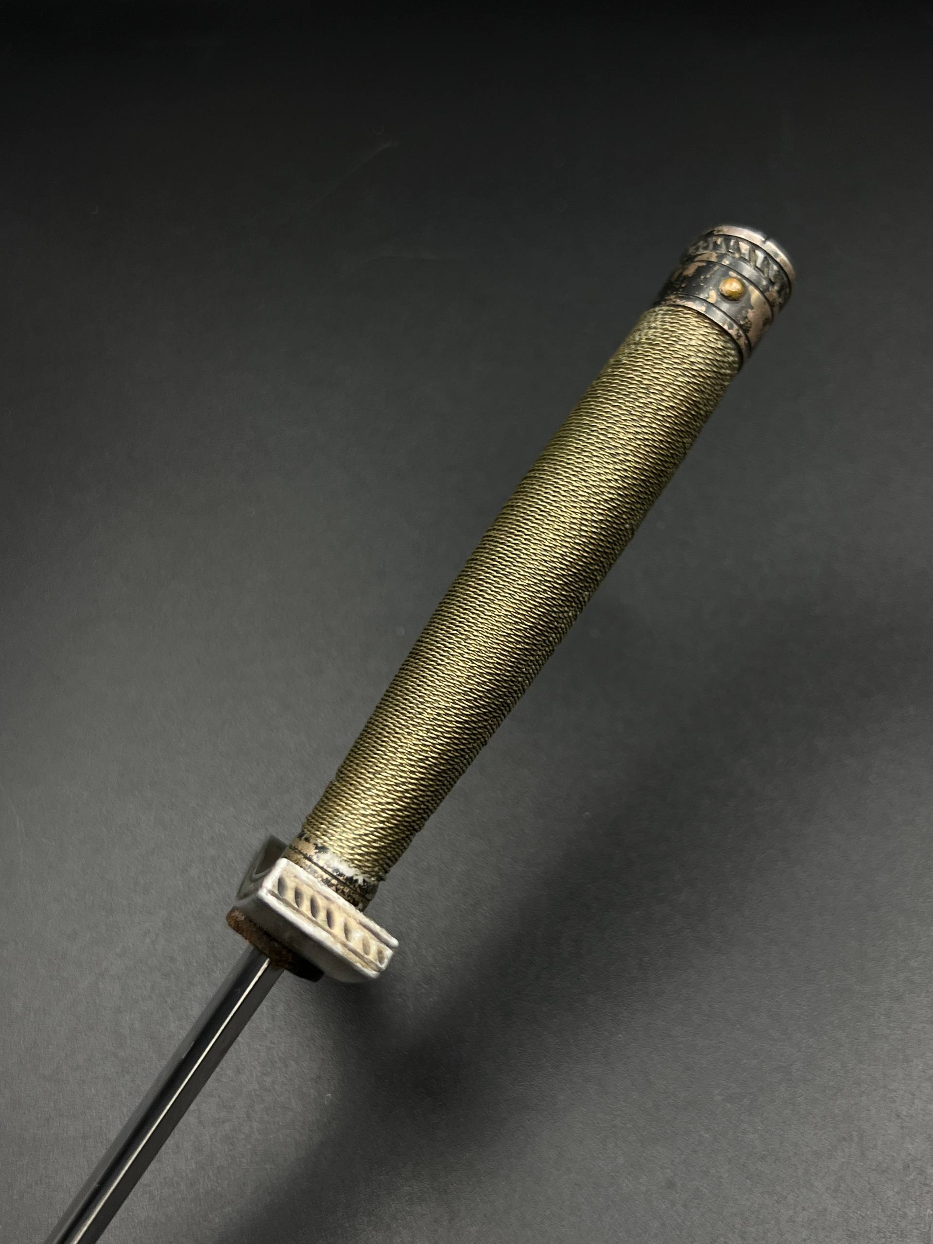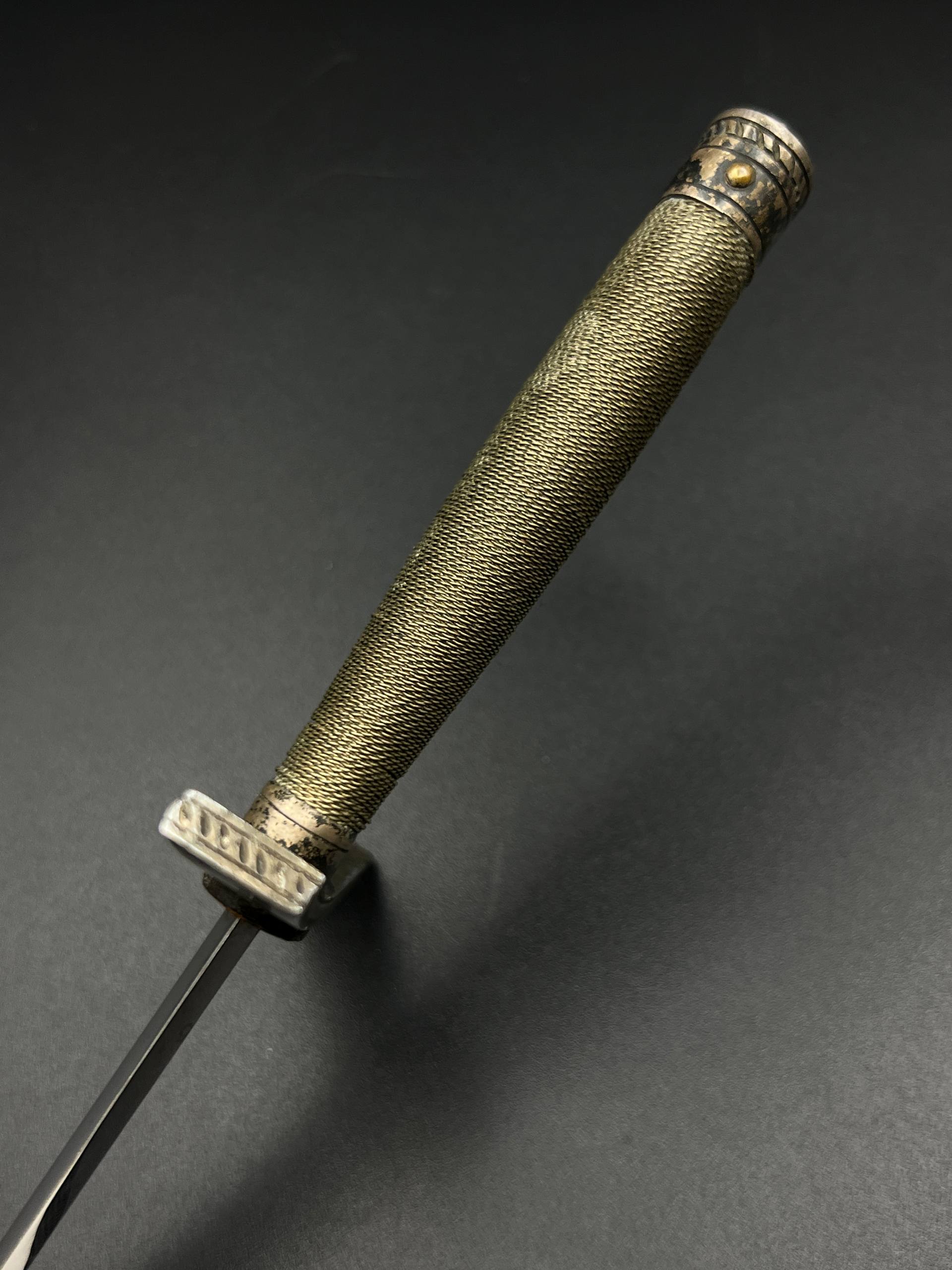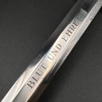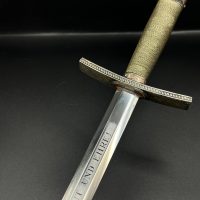 Outstanding example with a minty blade that shows a bright finish and a dark motto and maker mark of M7/36 for Horster. The grip is near perfect and the pommel cross guard and scabbard fittings all have a dark matching patina. The leather is solid, with very minimal bubbling and no scuffs or tears. Hard to find these model daggers these days especially clean ones.