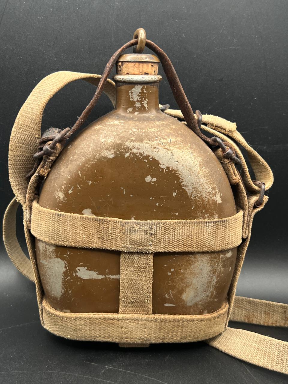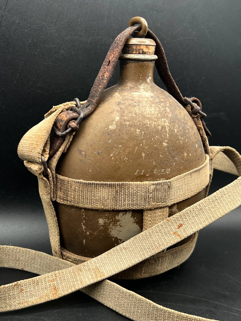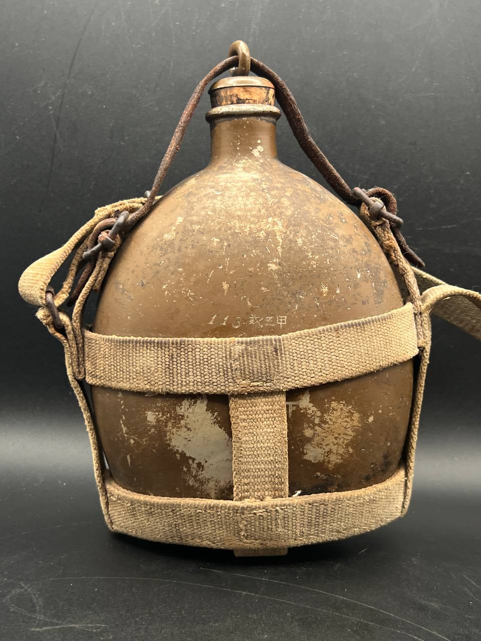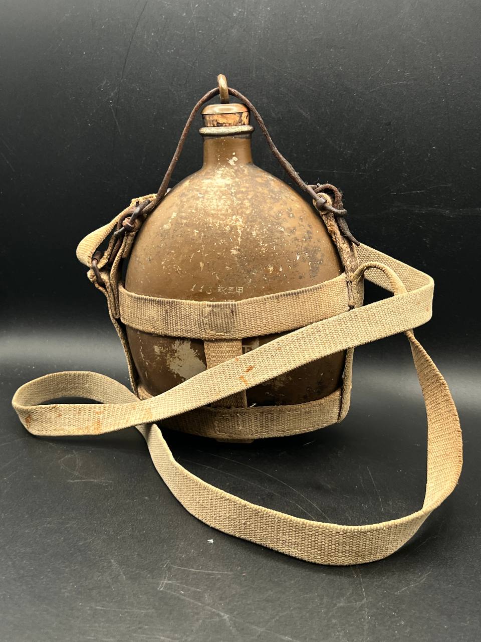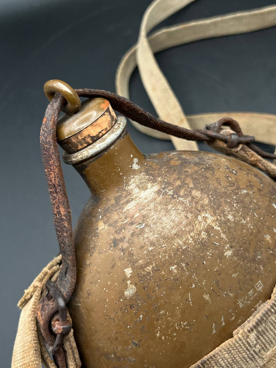 These canteens were standard issue for Japanese infantry across all Pacific war fronts. This example remains in authentic field-used condition, complete with its original straps and fittings.