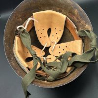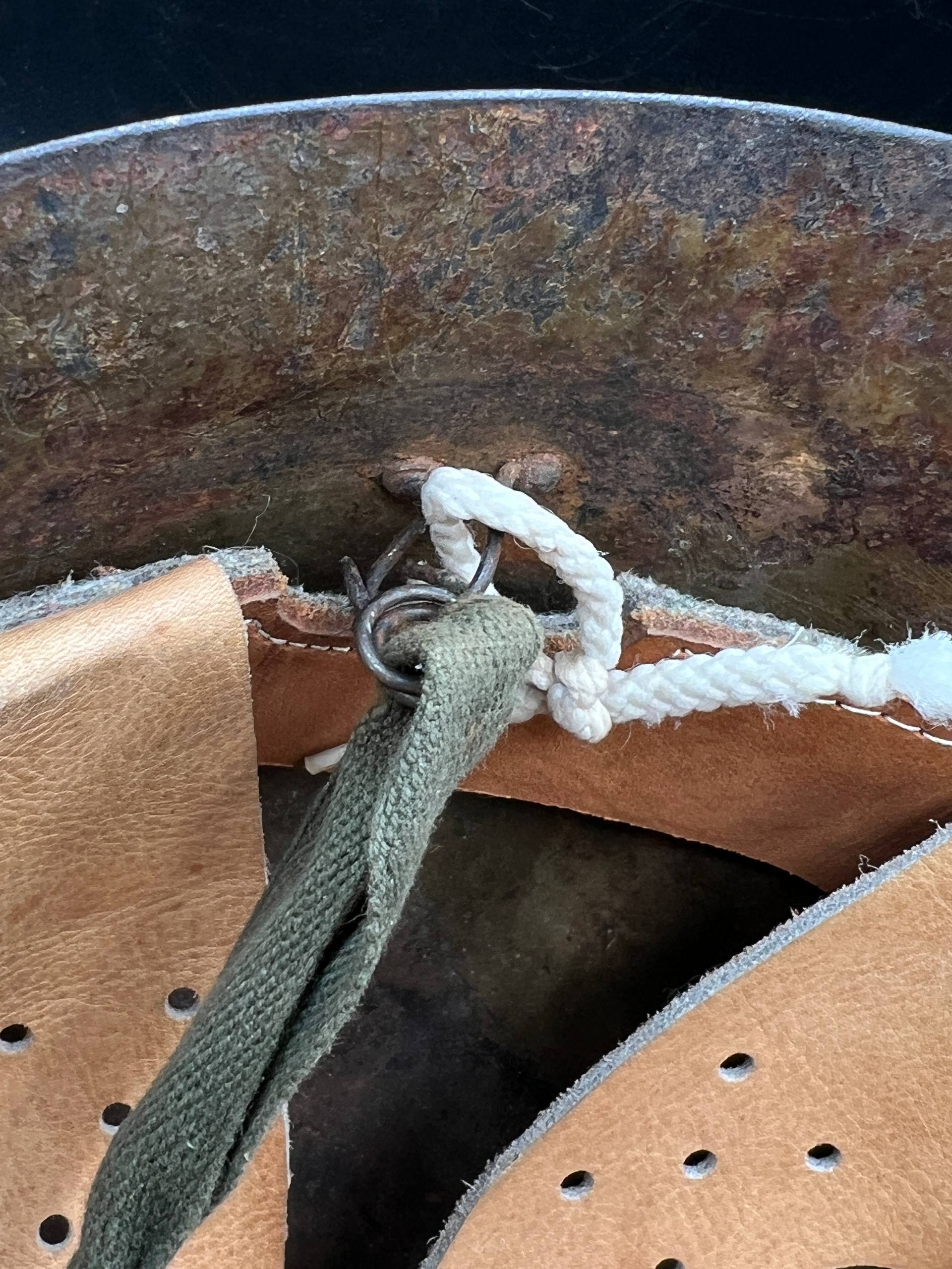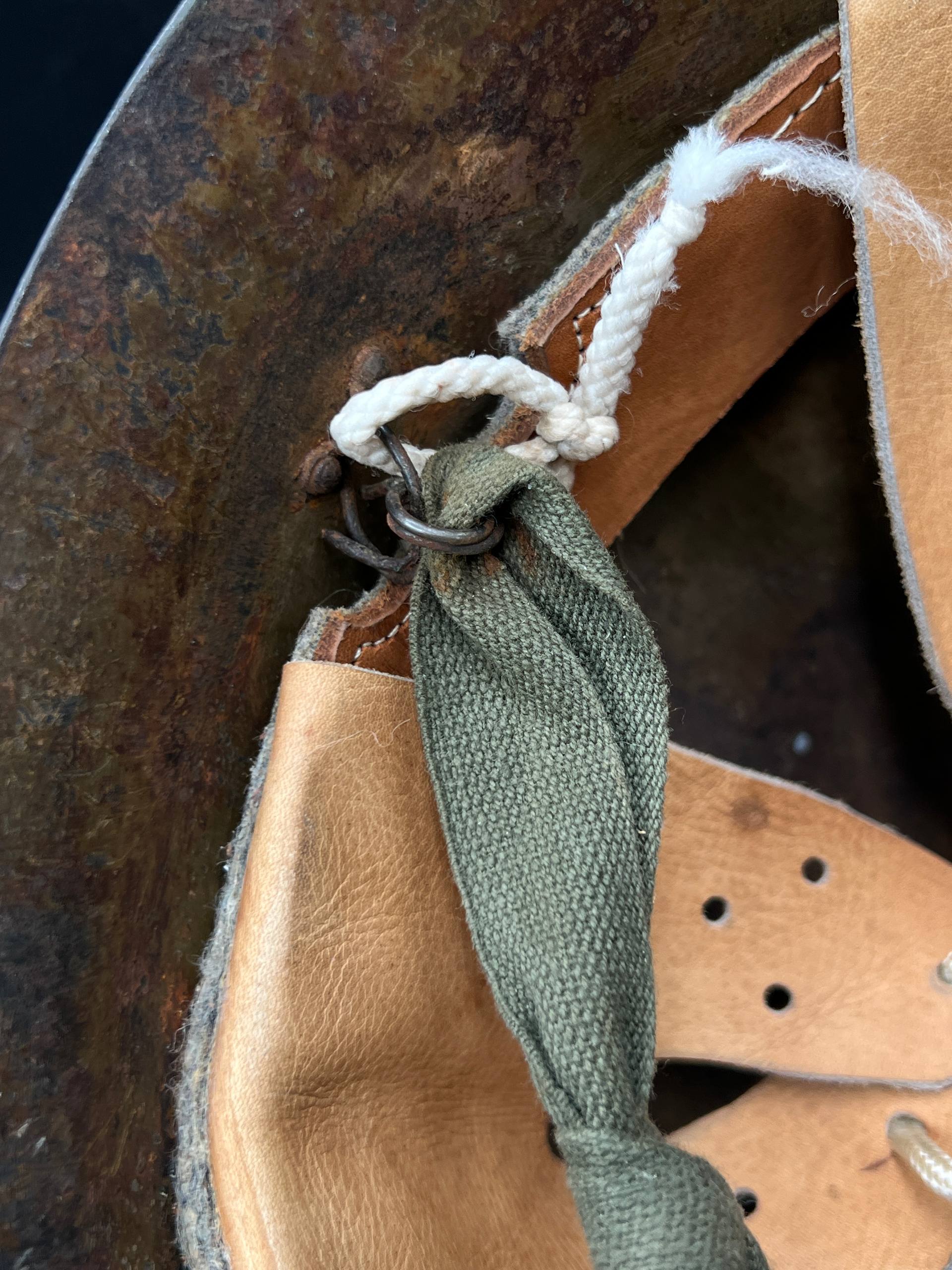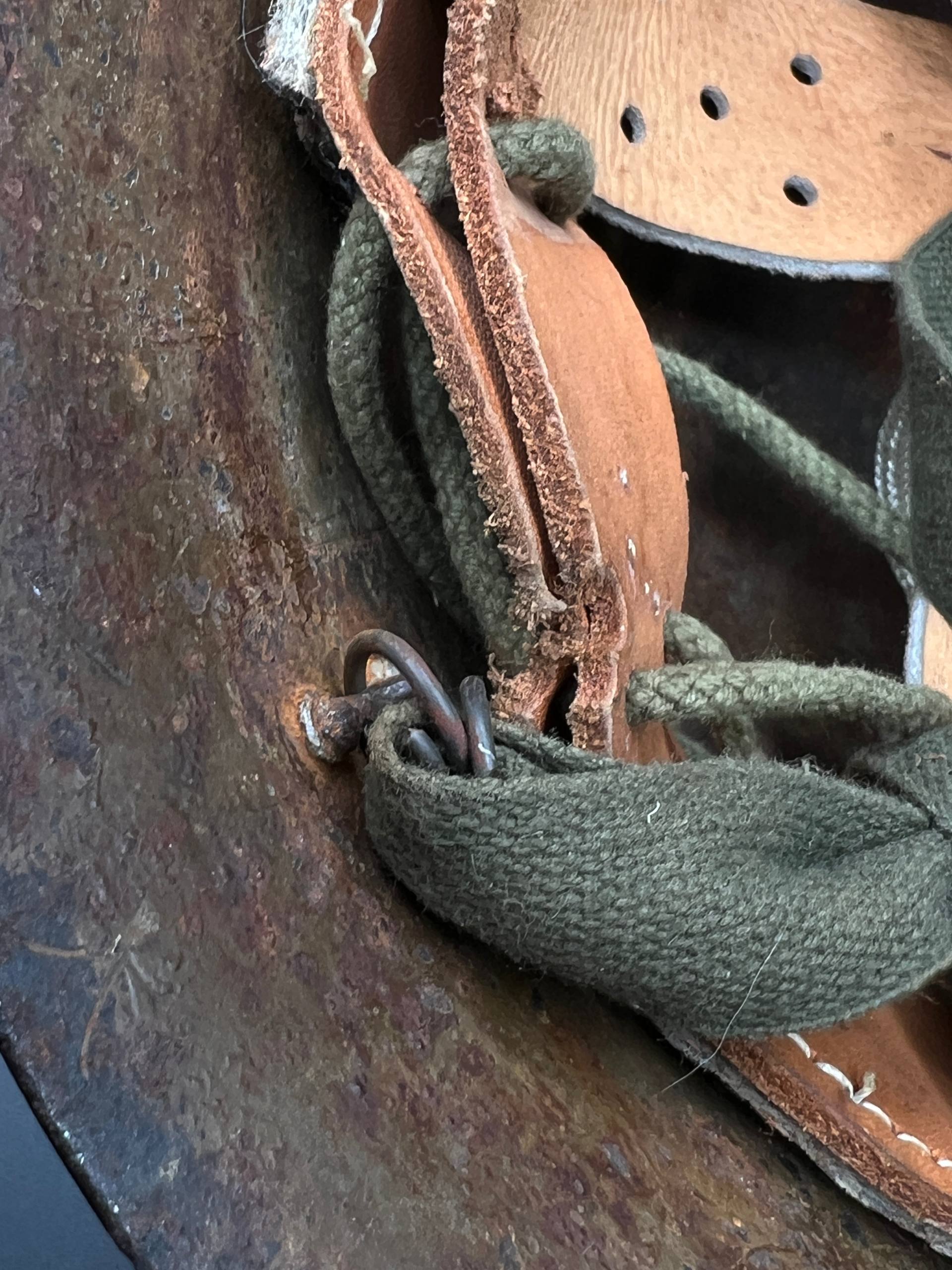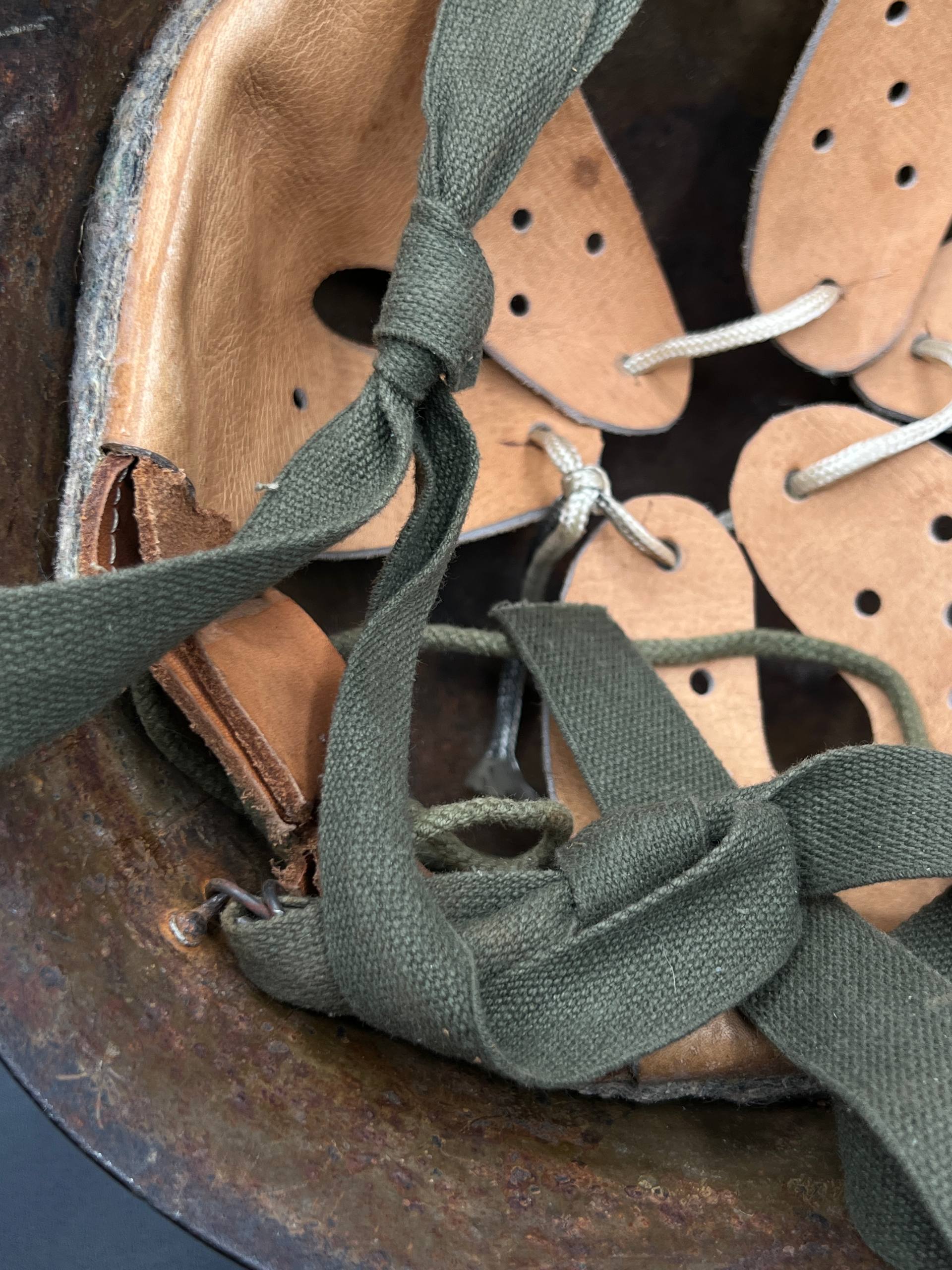 The interior is fitted with a modern reproduction leather liner and chinstrap. The liner is clean and functional, but not period-original.