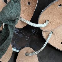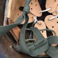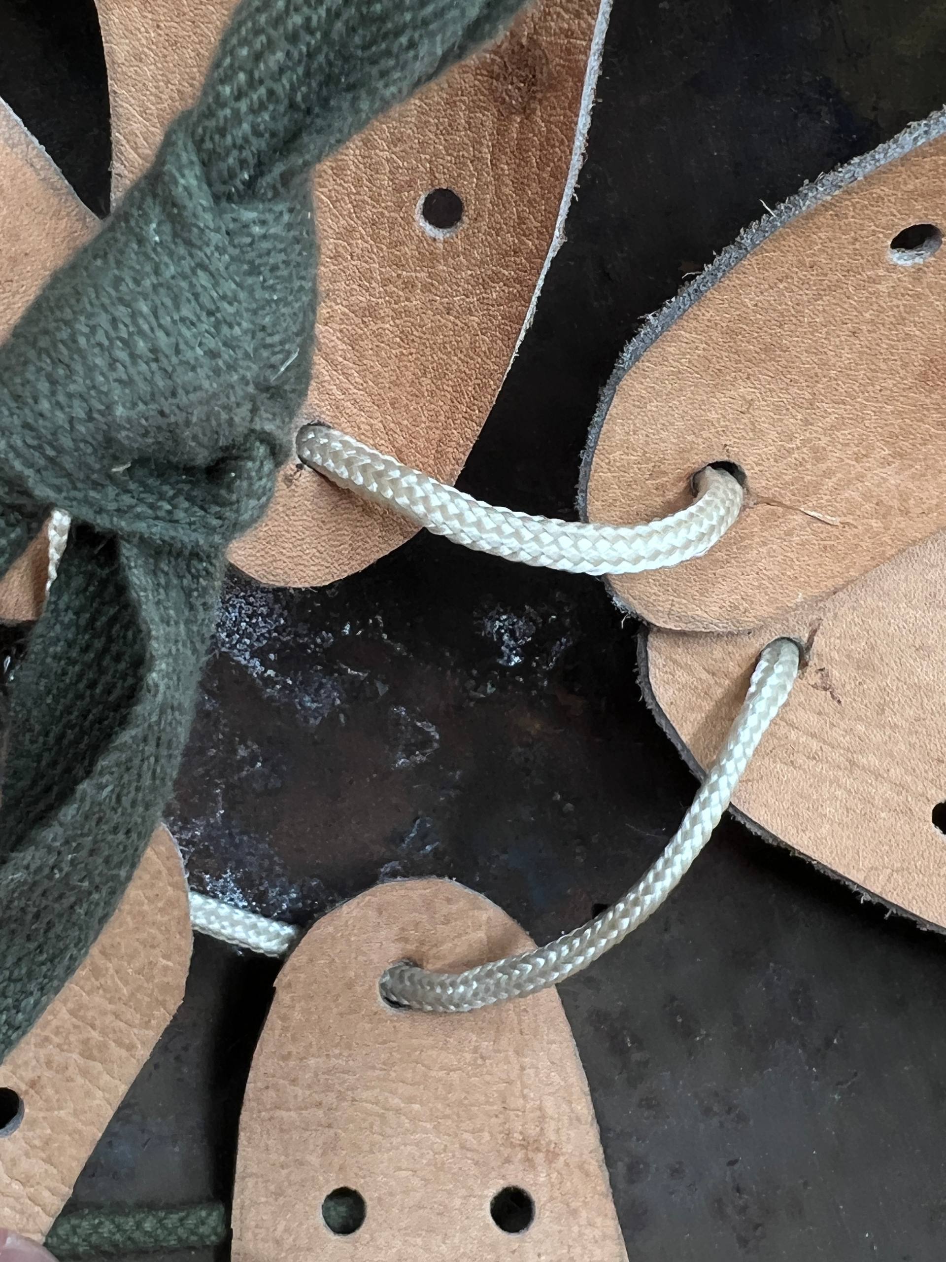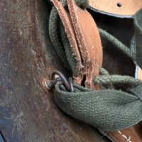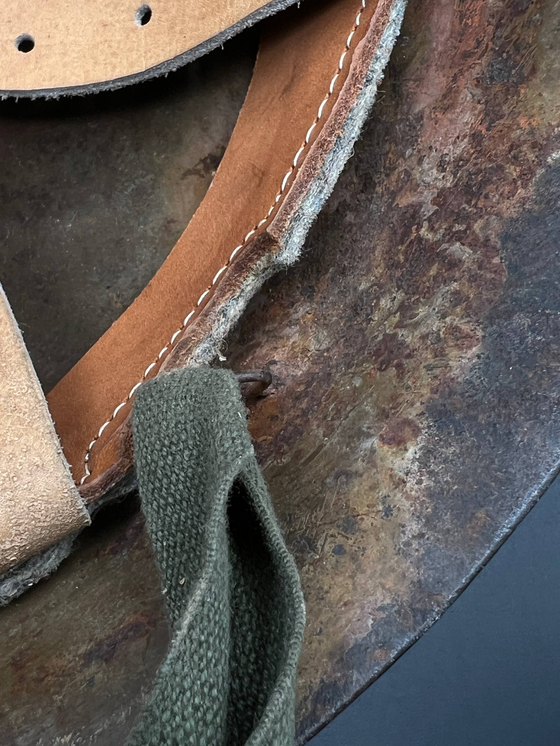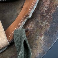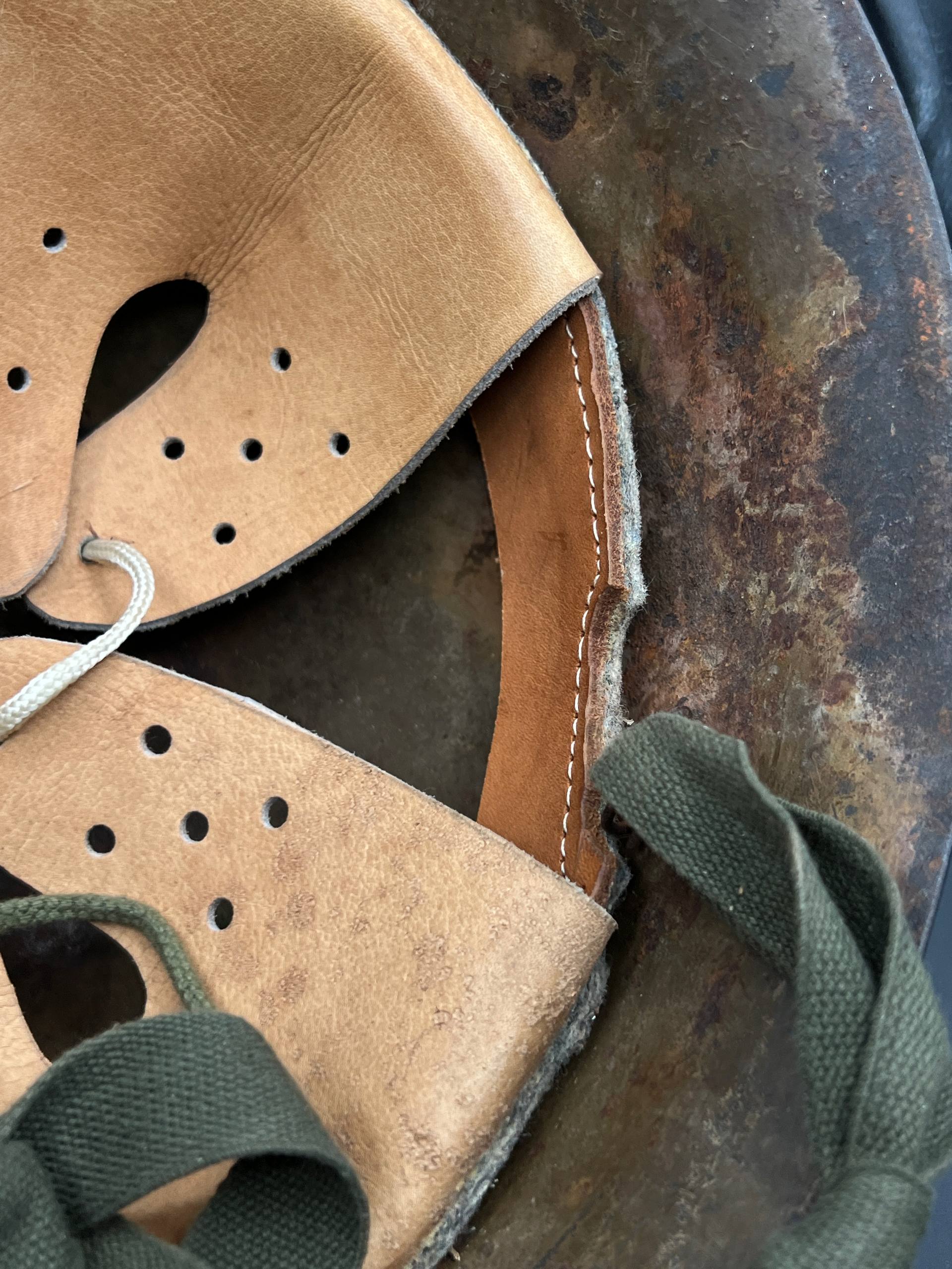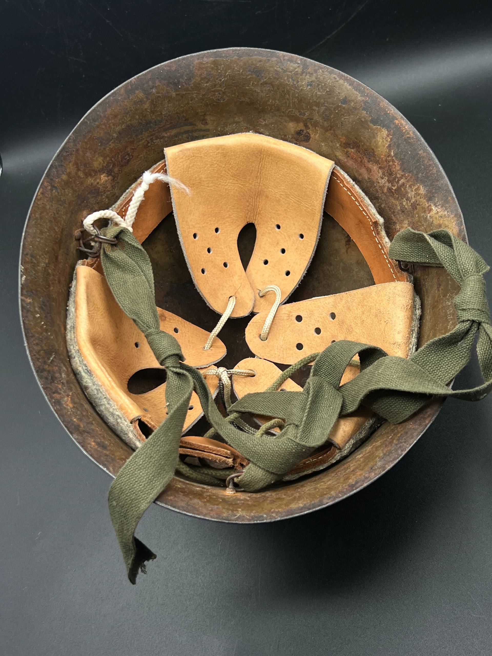 The interior is fitted with a modern reproduction leather liner and chinstrap. The liner is clean and functional, but not period-original.