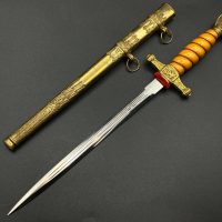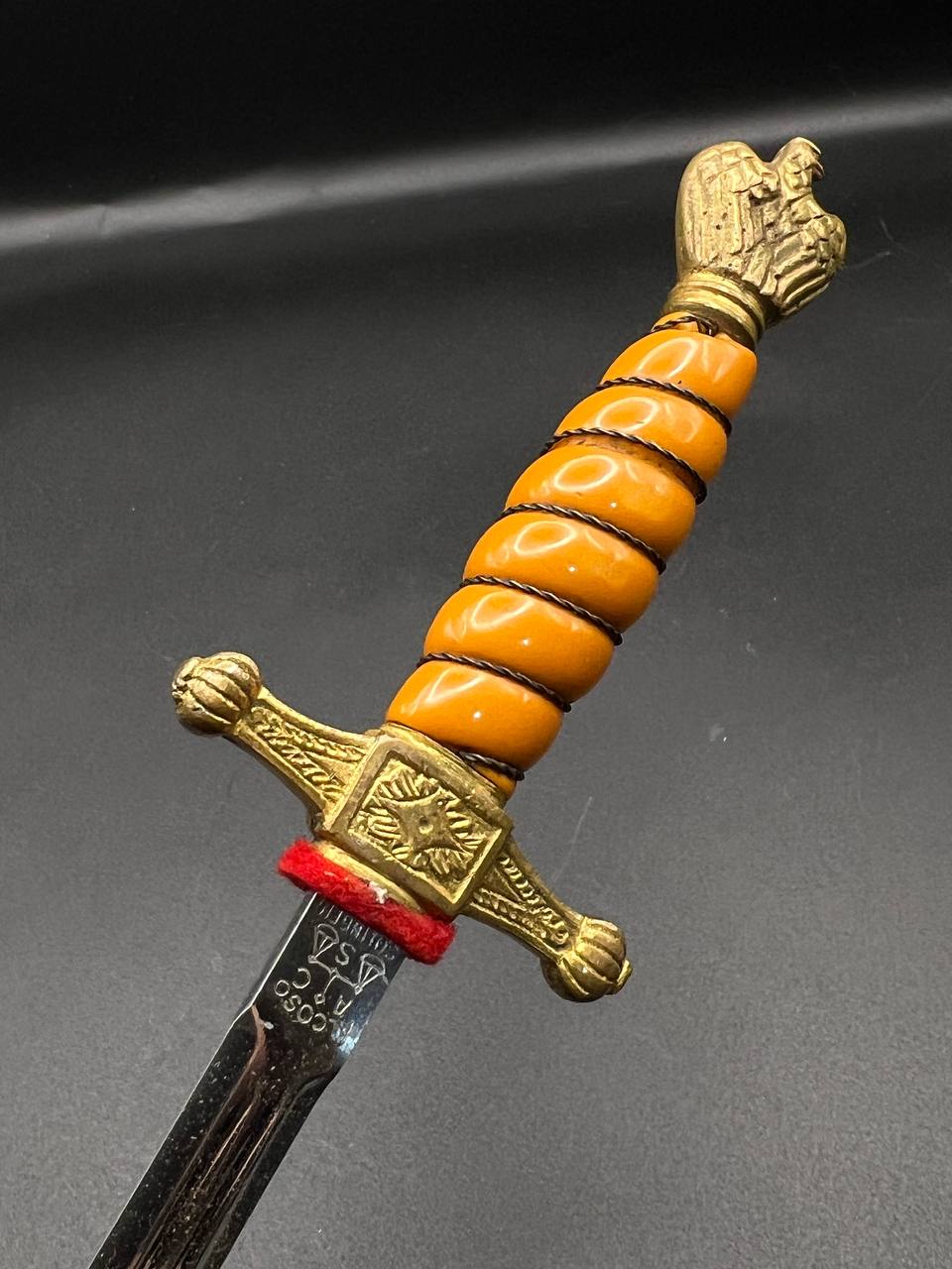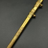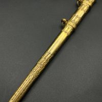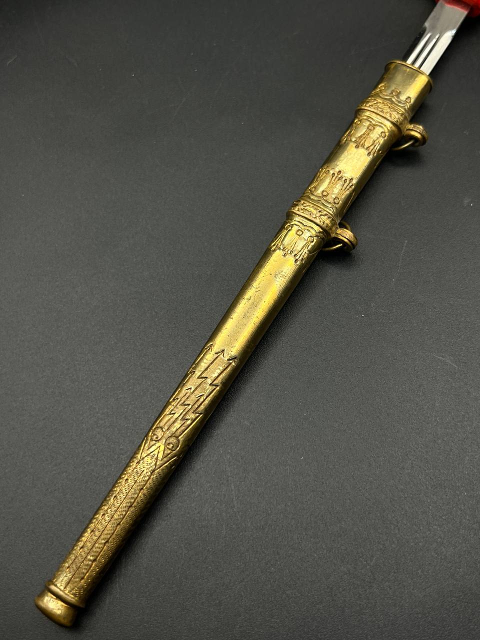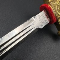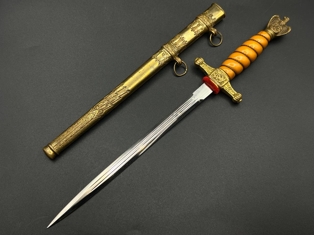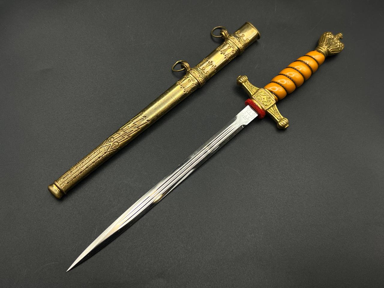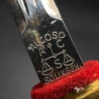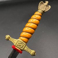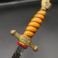 Miniature Kriegsmarine dagger by Alcoso (A•C•S) Solingen. Gilt brass fittings with naval motifs, bright orange contoured grip, and a blade with long fullers and the classic Alcoso scales logo. Complete with original decorated brass scabbard. A fine representative example of a naval officer’s miniature dagger.