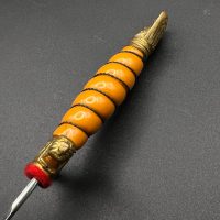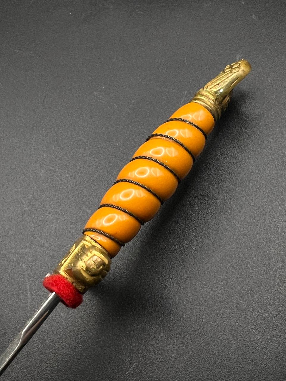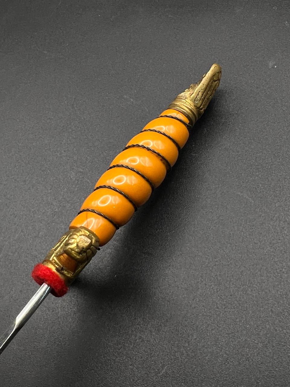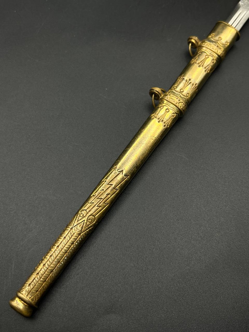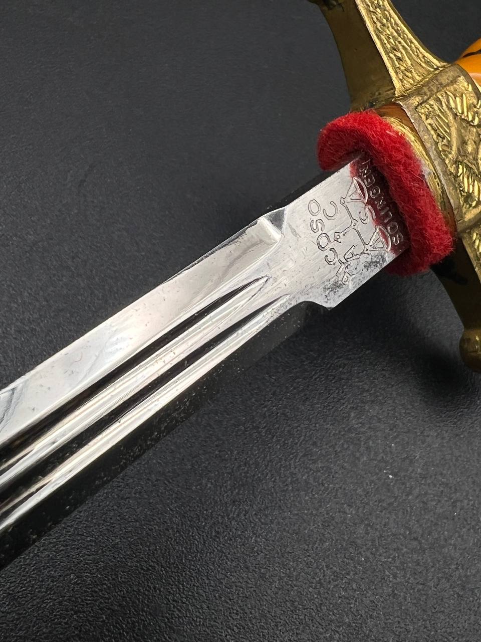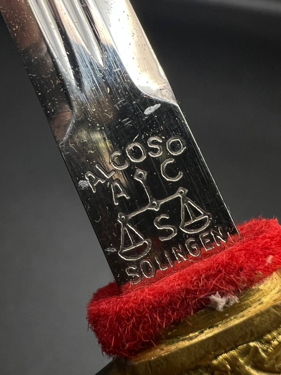 Miniature Kriegsmarine dagger by Alcoso (A•C•S) Solingen. Gilt brass fittings with naval motifs, bright orange contoured grip, and a blade with long fullers and the classic Alcoso scales logo. Complete with original decorated brass scabbard. A fine representative example of a naval officer’s miniature dagger.