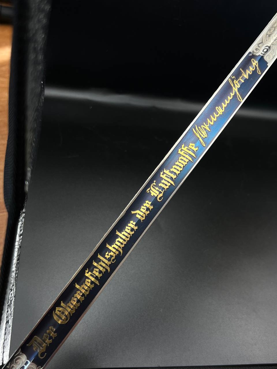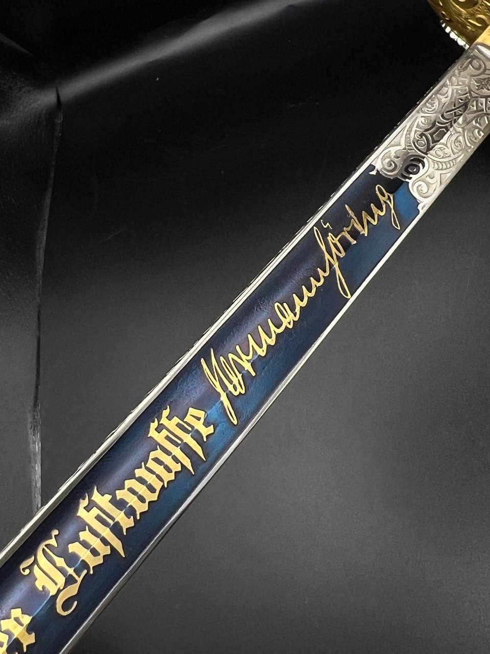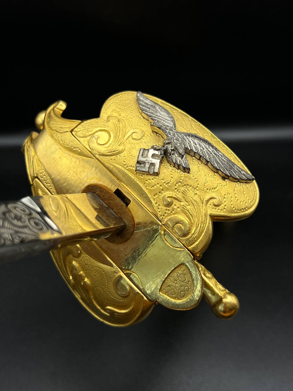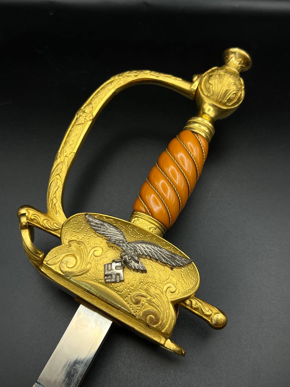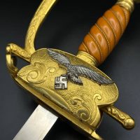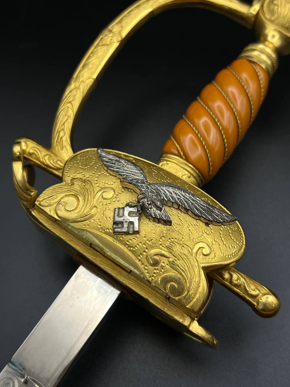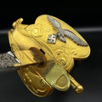 This is the classic version manufactured by Carl Eickhorn Solingen. The hilt fittings in fire-gilt non-ferrous metal, the grip mounts hand-decorated. On the obverse quillon, the separately applied silver-plated Luftwaffe national eagle, triple-riveted. The grip in amber color with gilt wire wrap. Straight nickel-plated and etched blade with fullers on both sides, gilt dedication on the obverse “In dankbarer Anerkennung” (In Grateful Recognition), on the reverse “Der Oberbefehlshaber der Luftwaffe – Hermann Göring” (The Commander-in-Chief of the Luftwaffe – Hermann Göring), each gilt with blued background. On the ricasso with maker’s mark “Original Eickhorn Solingen”. Black leather scabbard with gilt mounts, reverse side clamped.