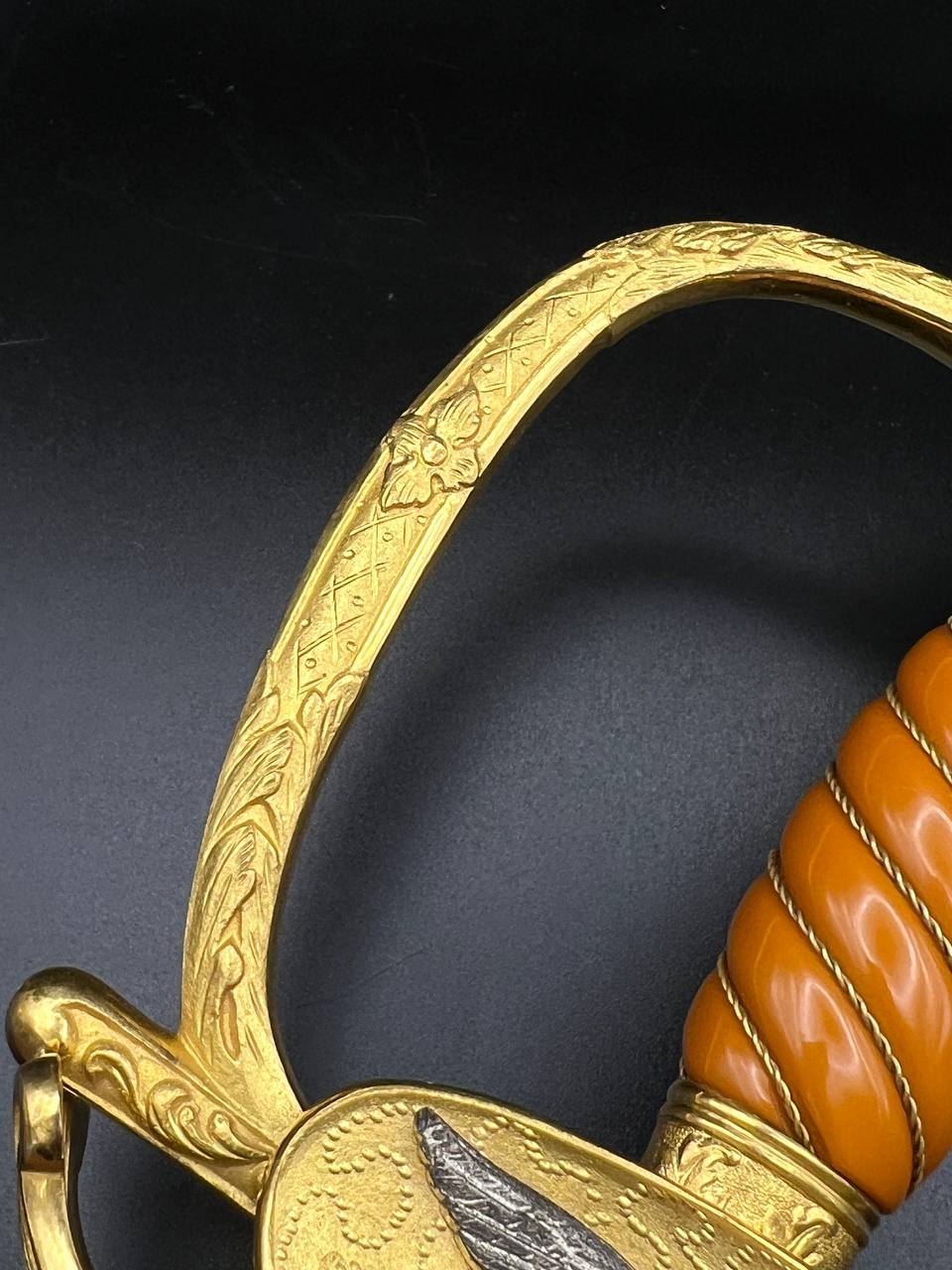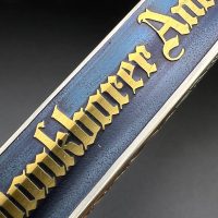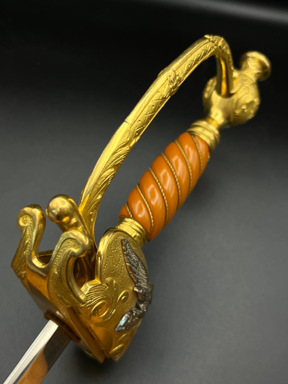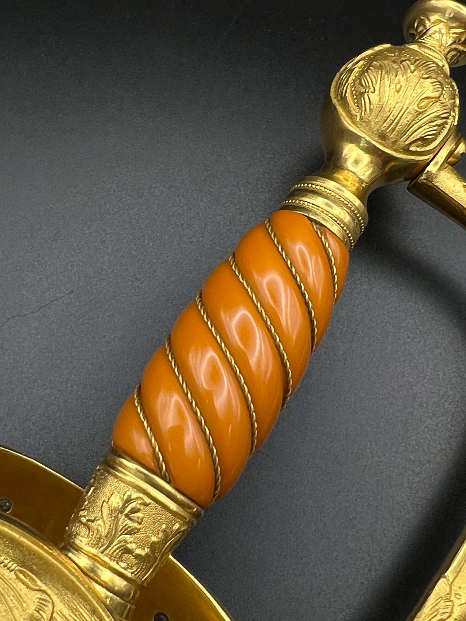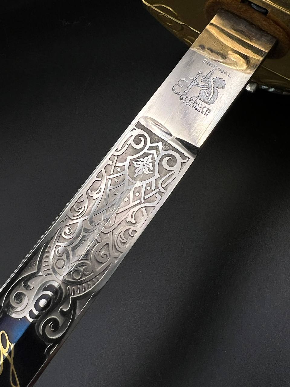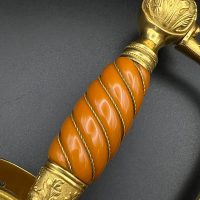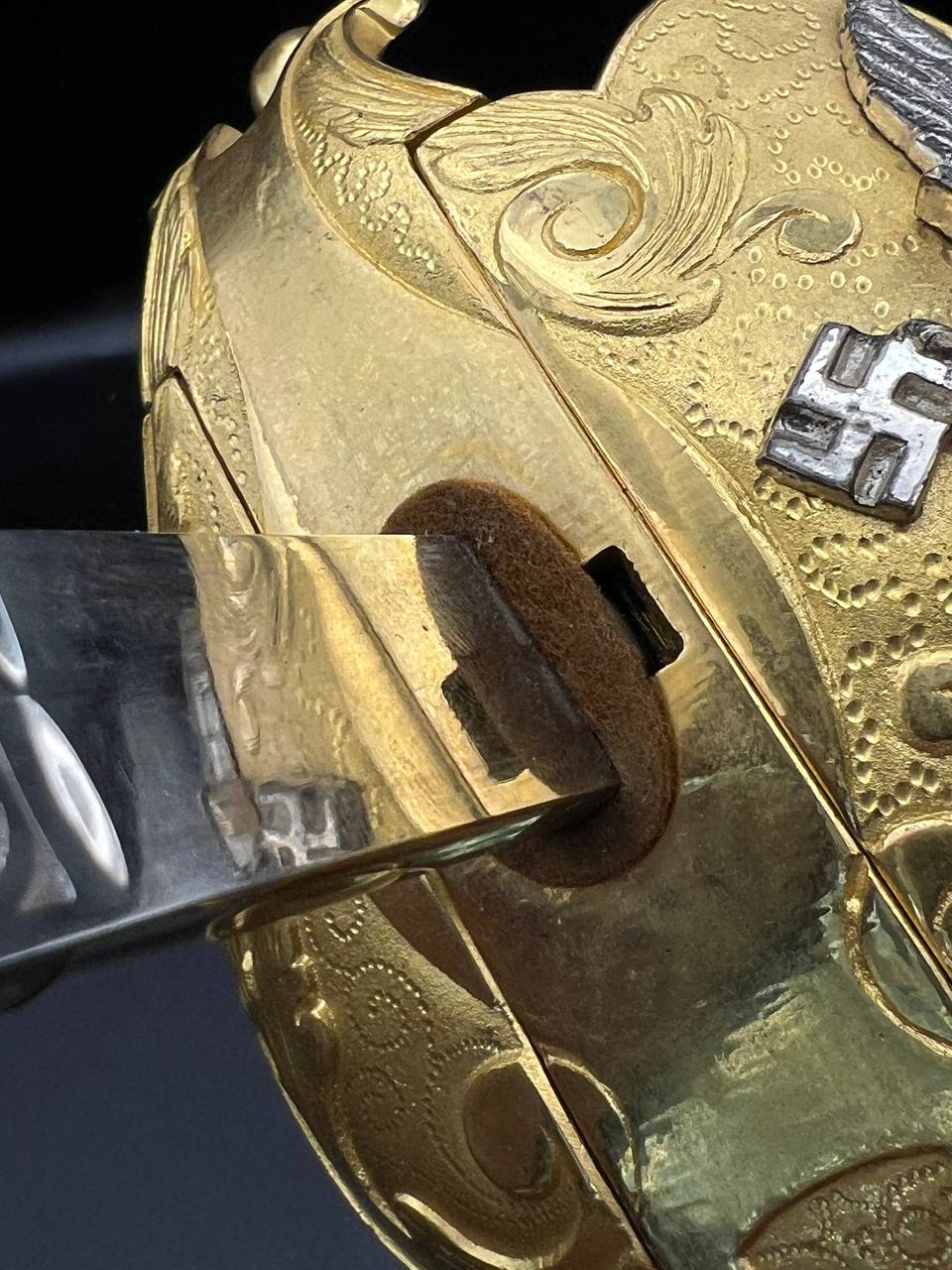 This is the classic version manufactured by Carl Eickhorn Solingen. The hilt fittings in fire-gilt non-ferrous metal, the grip mounts hand-decorated. On the obverse quillon, the separately applied silver-plated Luftwaffe national eagle, triple-riveted. The grip in amber color with gilt wire wrap. Straight nickel-plated and etched blade with fullers on both sides, gilt dedication on the obverse “In dankbarer Anerkennung” (In Grateful Recognition), on the reverse “Der Oberbefehlshaber der Luftwaffe – Hermann Göring” (The Commander-in-Chief of the Luftwaffe – Hermann Göring), each gilt with blued background. On the ricasso with maker’s mark “Original Eickhorn Solingen”. Black leather scabbard with gilt mounts, reverse side clamped.