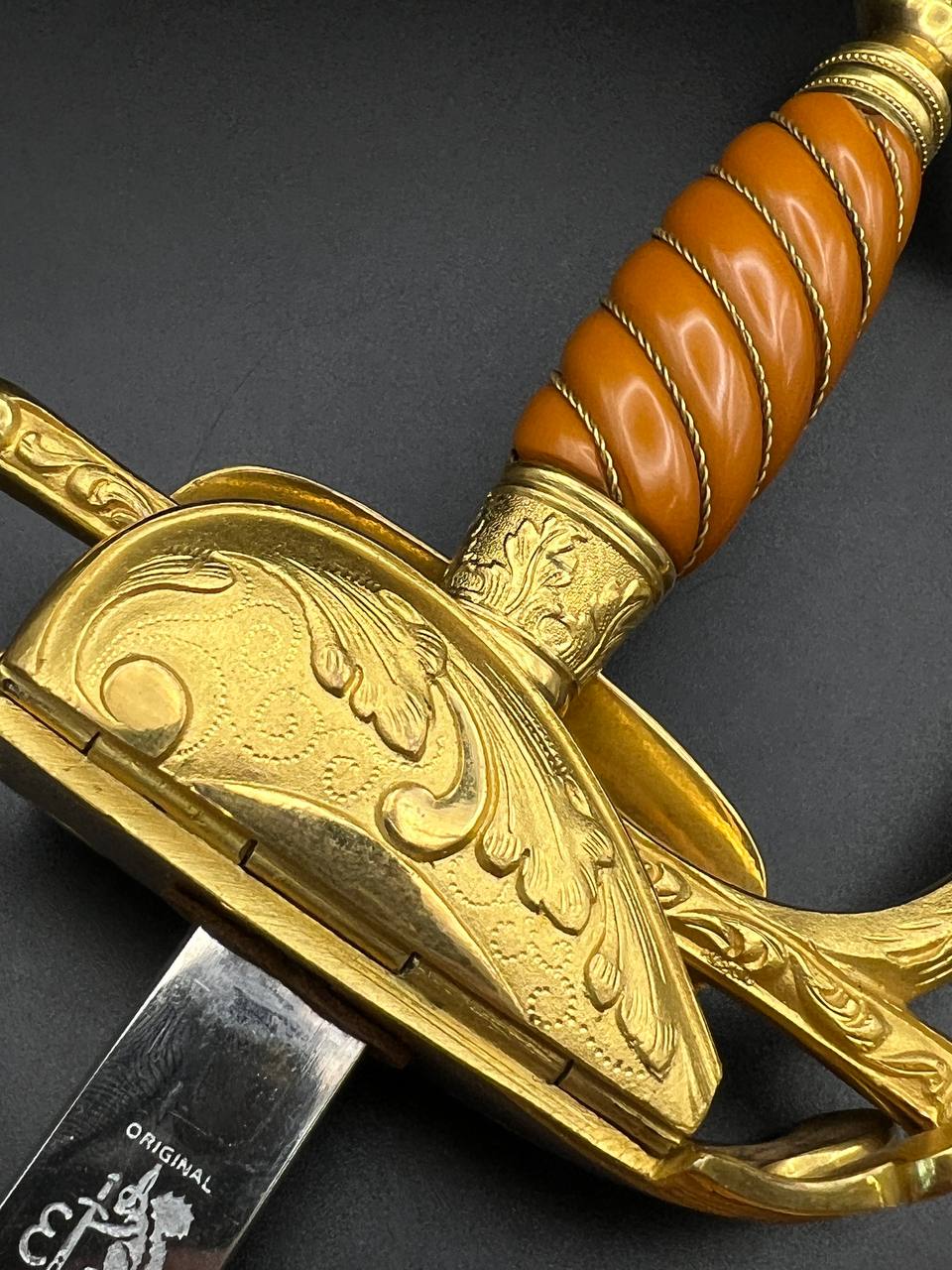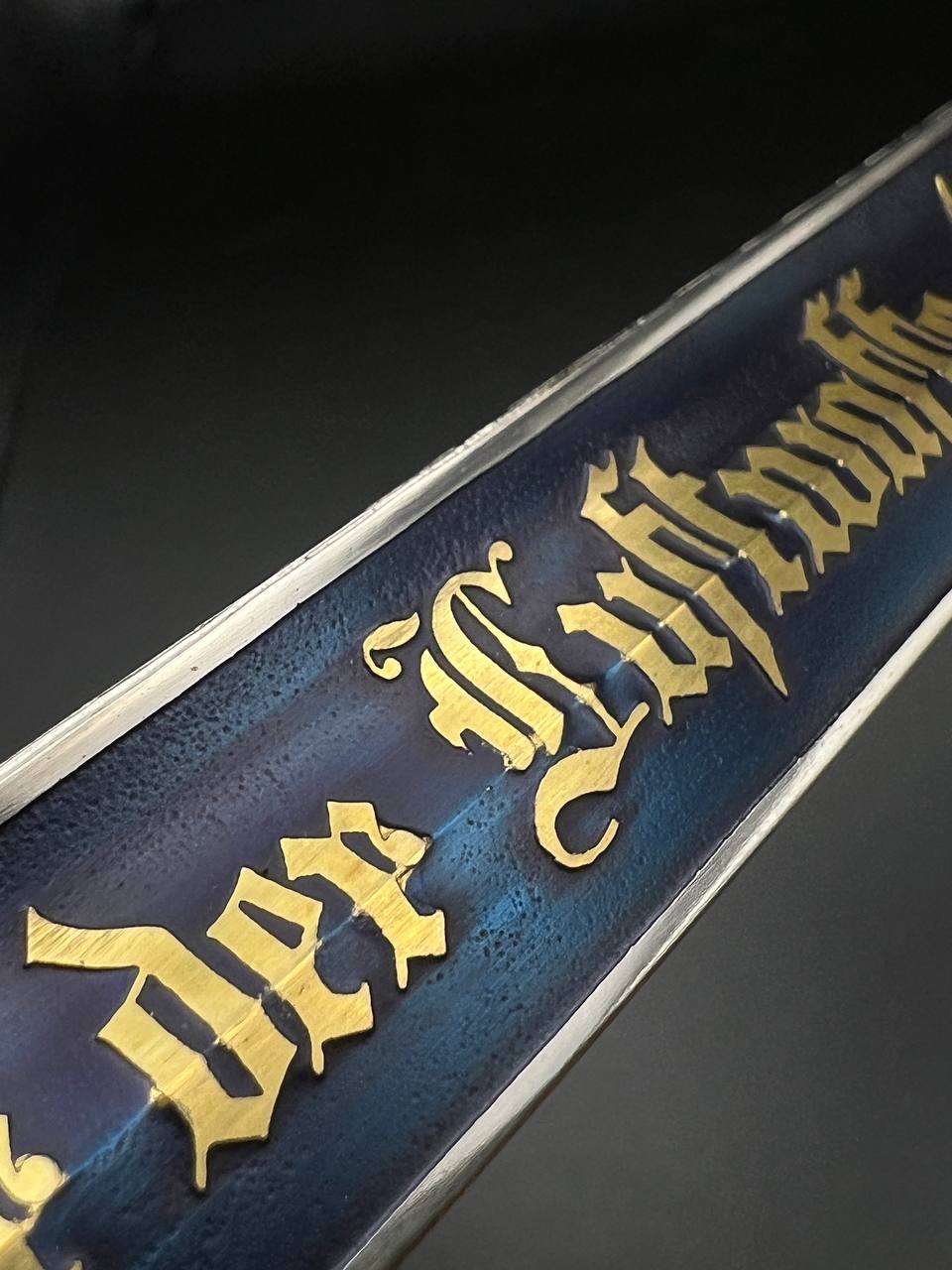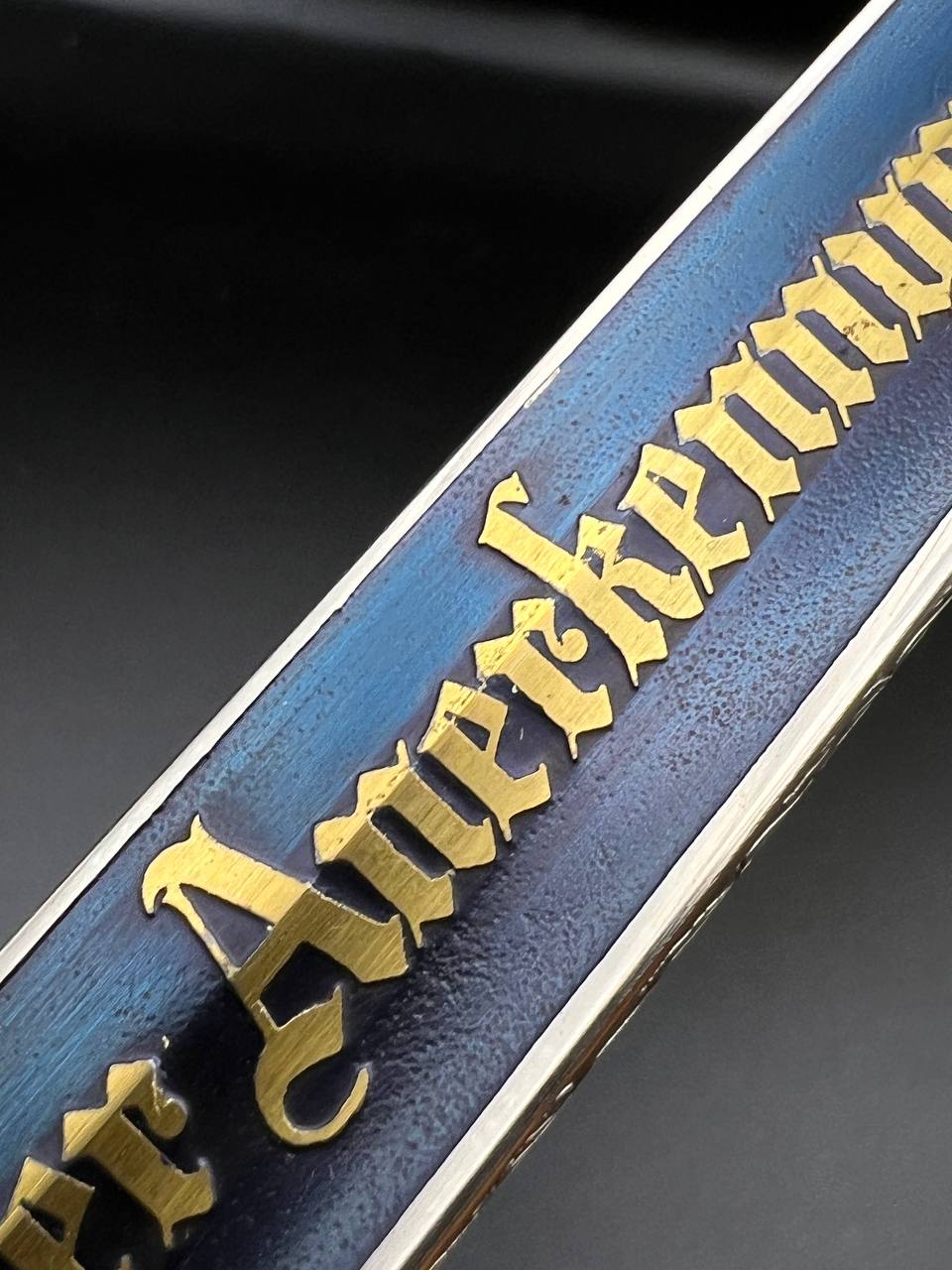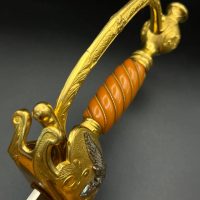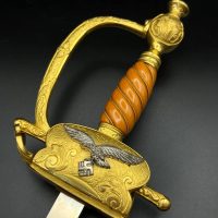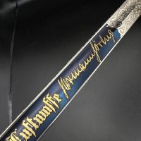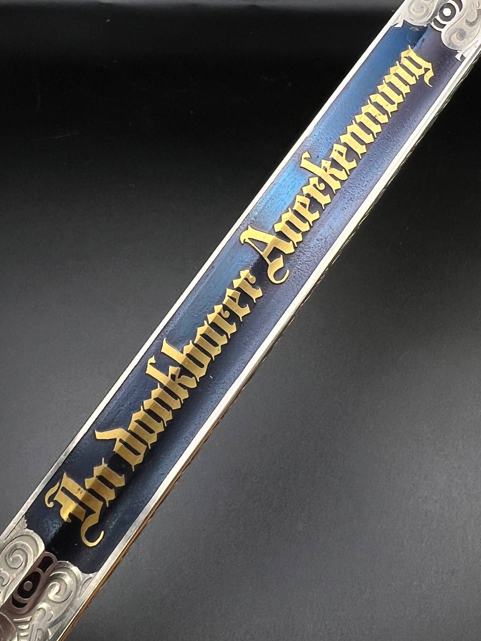 This is the classic version manufactured by Carl Eickhorn Solingen. The hilt fittings in fire-gilt non-ferrous metal, the grip mounts hand-decorated. On the obverse quillon, the separately applied silver-plated Luftwaffe national eagle, triple-riveted. The grip in amber color with gilt wire wrap. Straight nickel-plated and etched blade with fullers on both sides, gilt dedication on the obverse “In dankbarer Anerkennung” (In Grateful Recognition), on the reverse “Der Oberbefehlshaber der Luftwaffe – Hermann Göring” (The Commander-in-Chief of the Luftwaffe – Hermann Göring), each gilt with blued background. On the ricasso with maker’s mark “Original Eickhorn Solingen”. Black leather scabbard with gilt mounts, reverse side clamped.