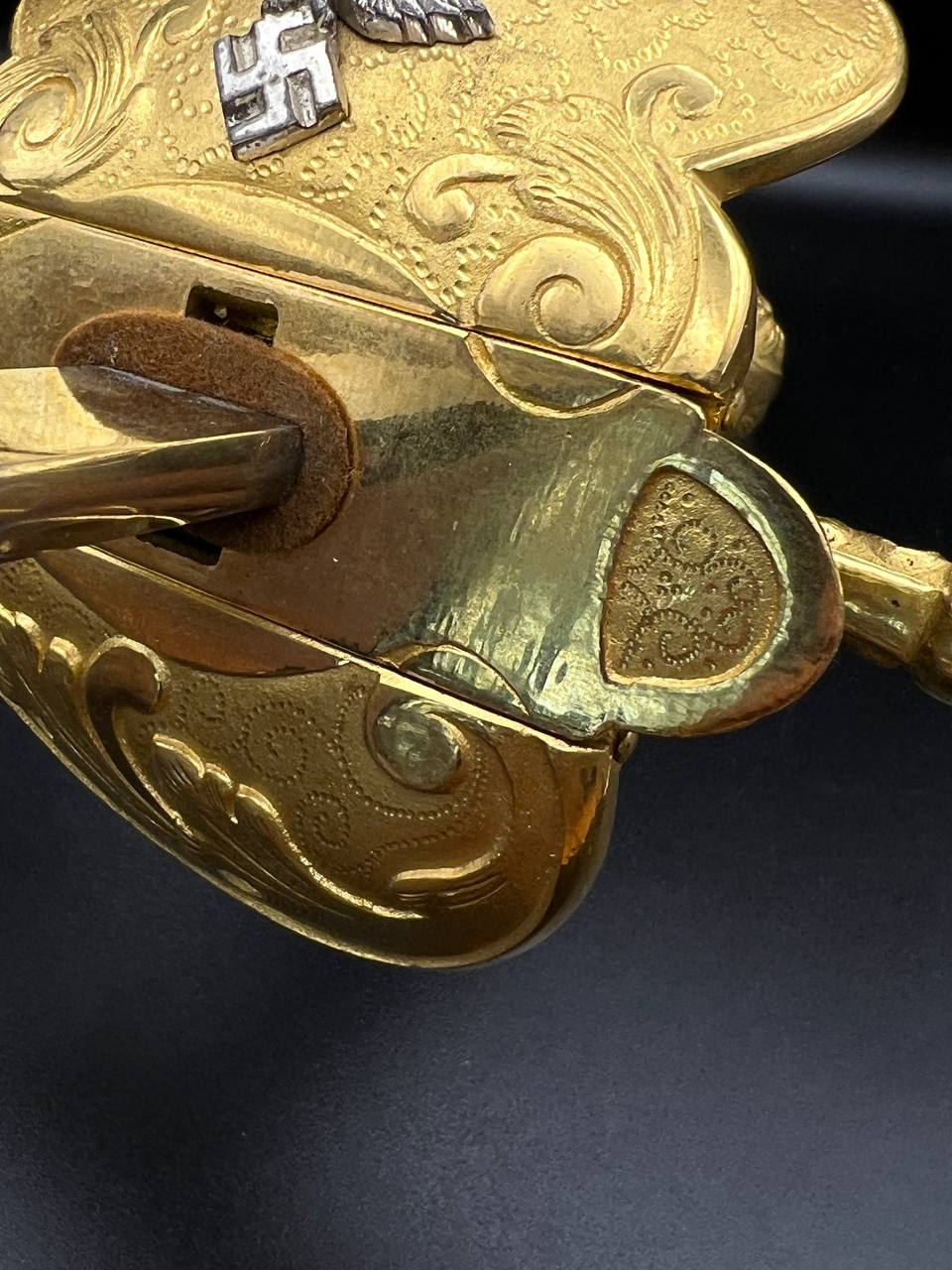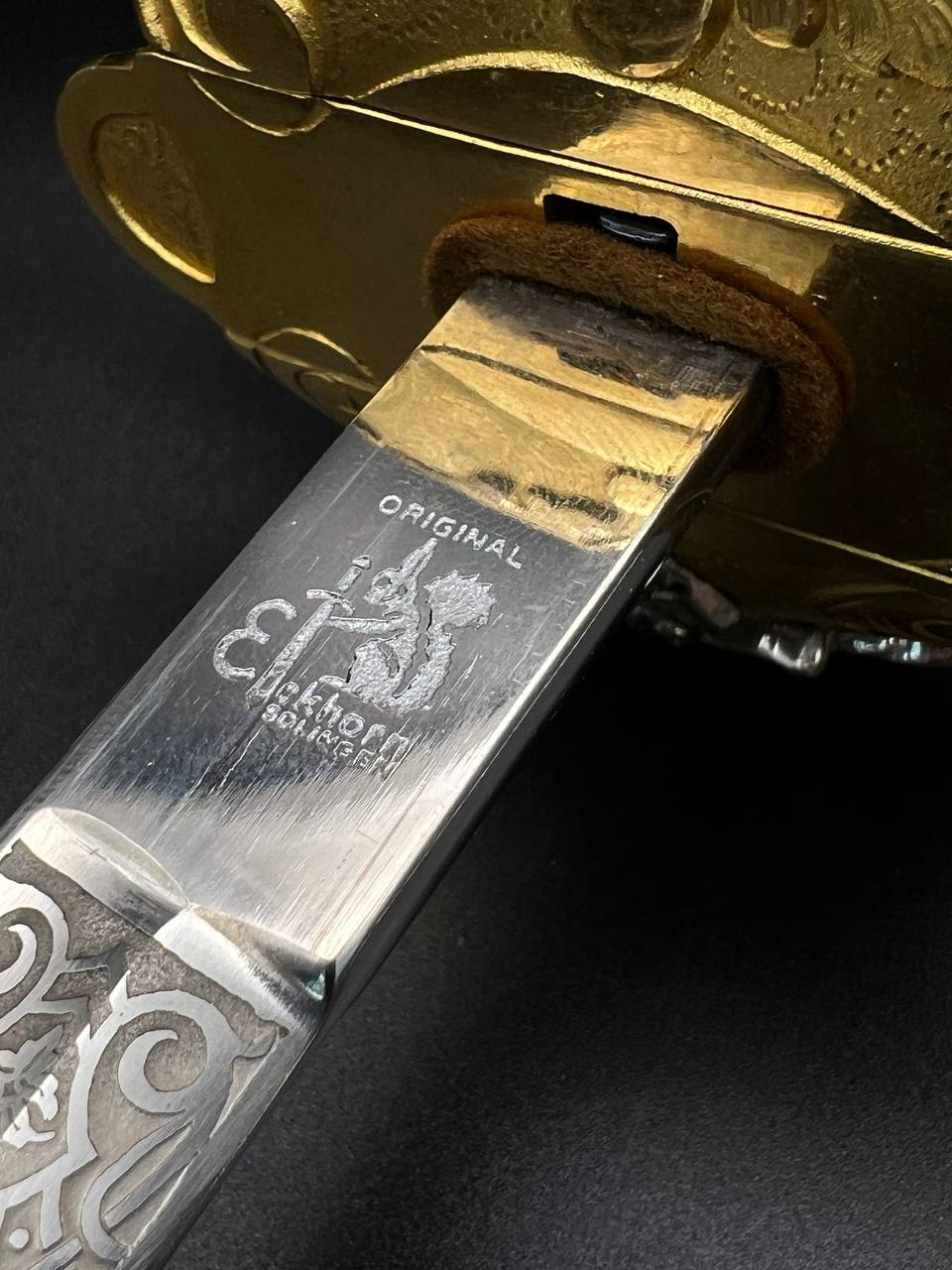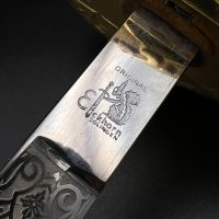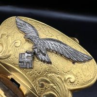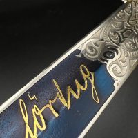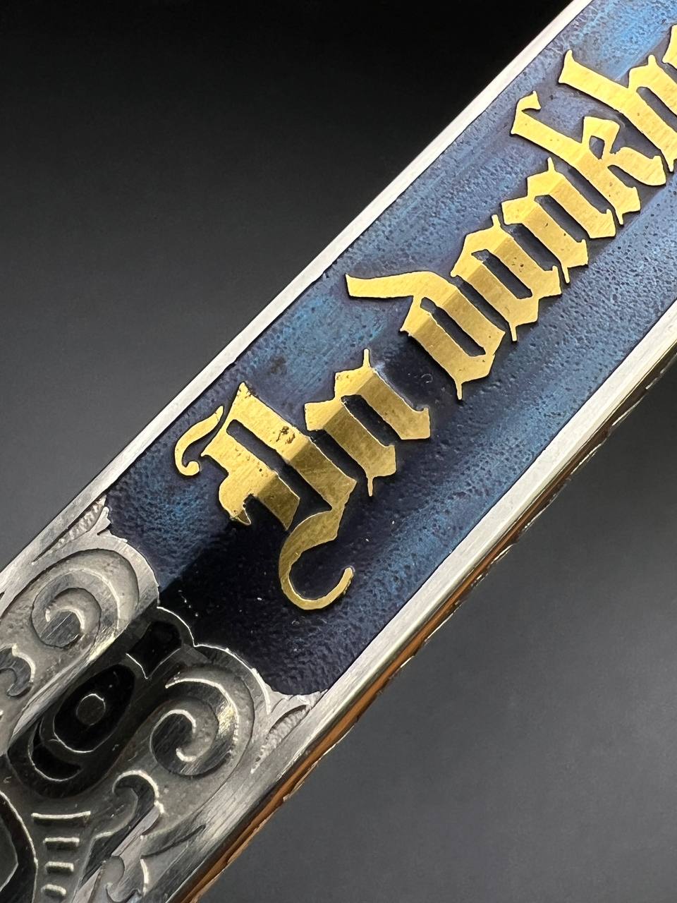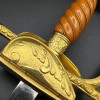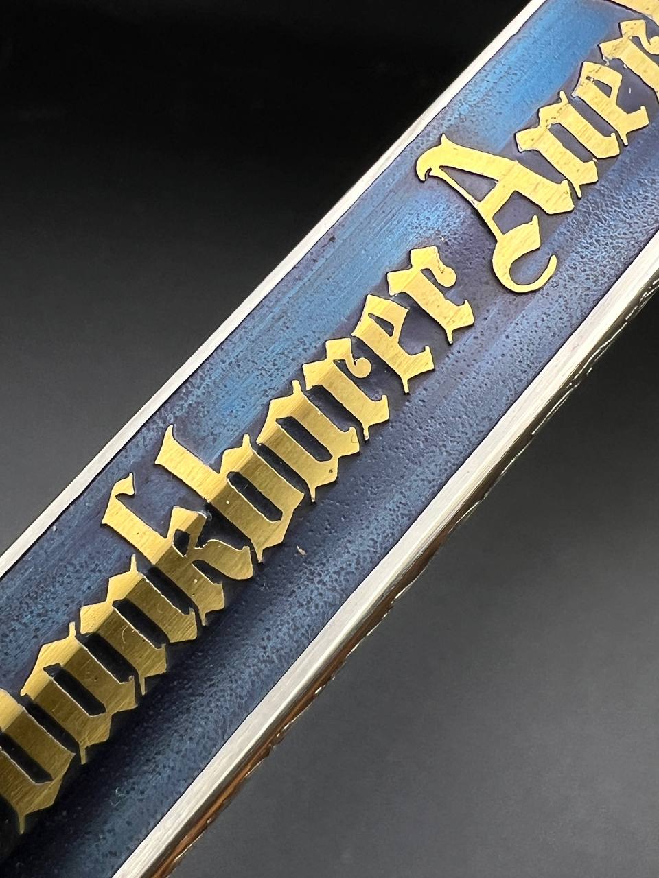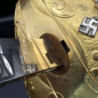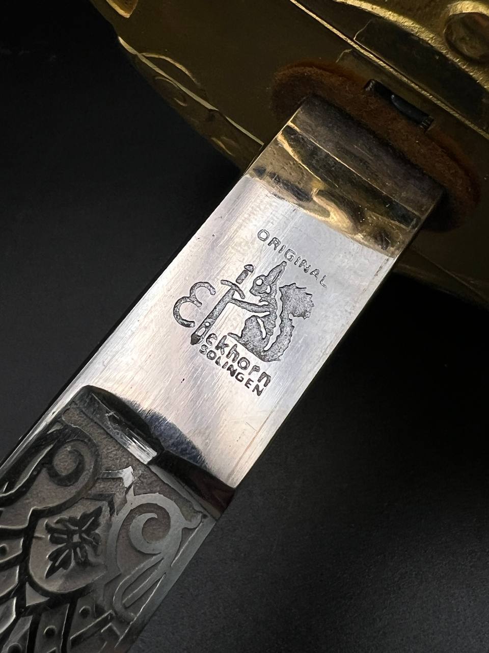 This is the classic version manufactured by Carl Eickhorn Solingen. The hilt fittings in fire-gilt non-ferrous metal, the grip mounts hand-decorated. On the obverse quillon, the separately applied silver-plated Luftwaffe national eagle, triple-riveted. The grip in amber color with gilt wire wrap. Straight nickel-plated and etched blade with fullers on both sides, gilt dedication on the obverse “In dankbarer Anerkennung” (In Grateful Recognition), on the reverse “Der Oberbefehlshaber der Luftwaffe – Hermann Göring” (The Commander-in-Chief of the Luftwaffe – Hermann Göring), each gilt with blued background. On the ricasso with maker’s mark “Original Eickhorn Solingen”. Black leather scabbard with gilt mounts, reverse side clamped.