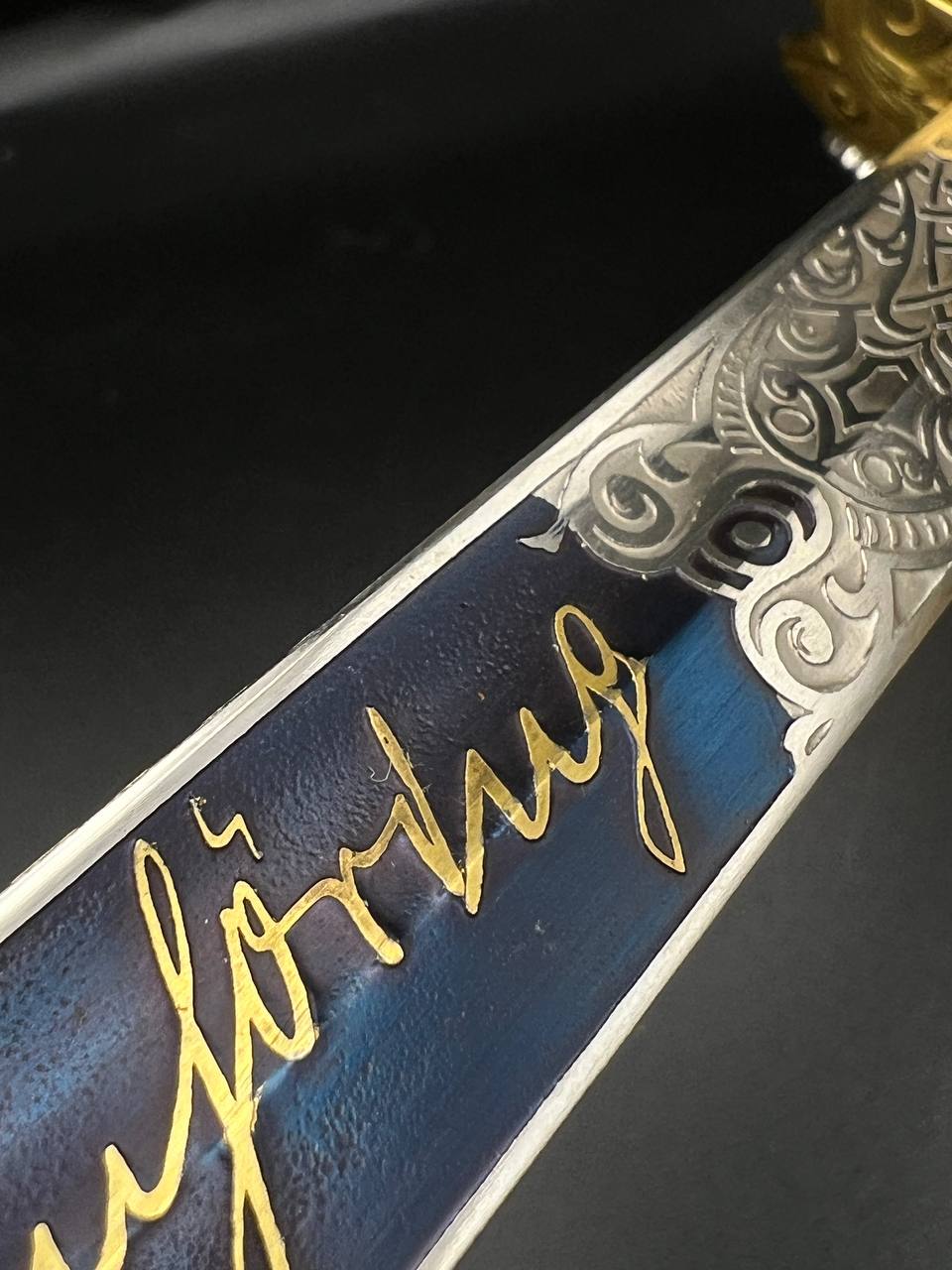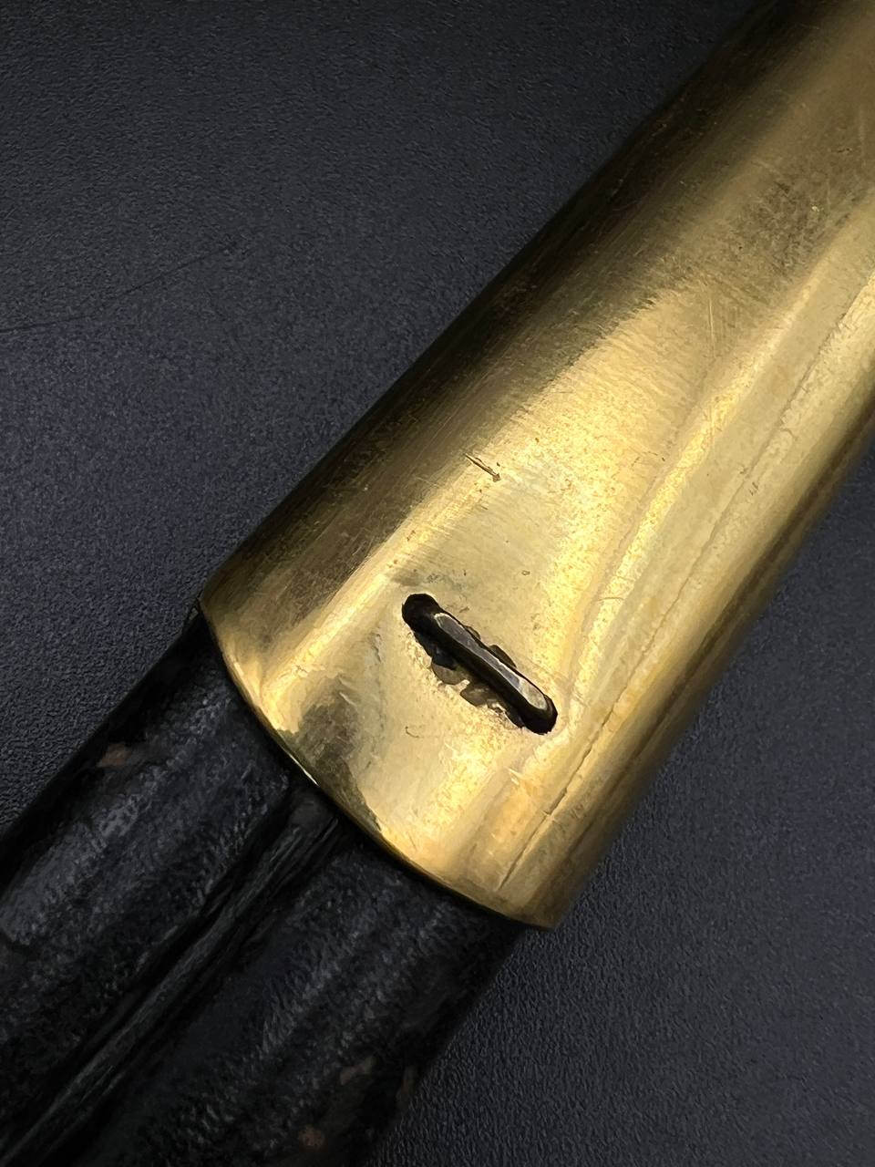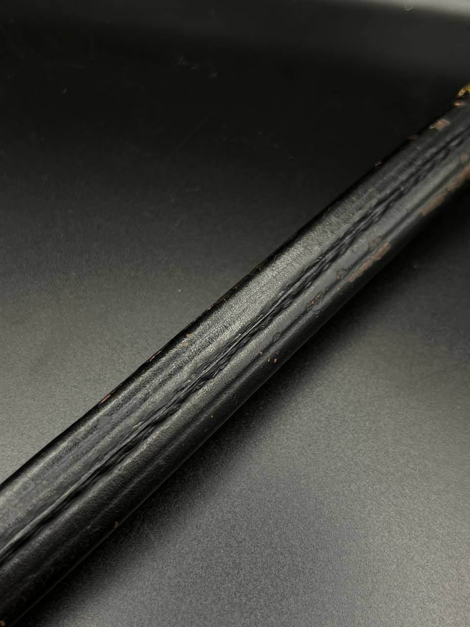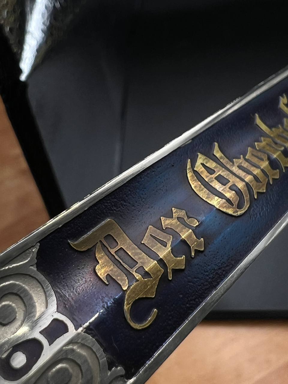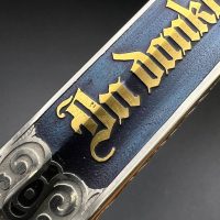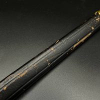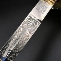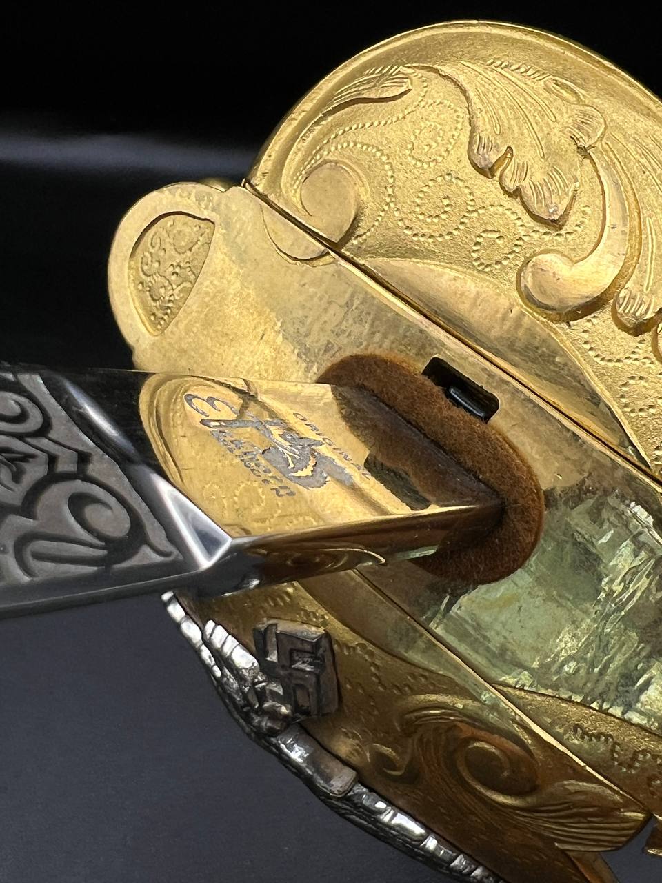 This is the classic version manufactured by Carl Eickhorn Solingen. The hilt fittings in fire-gilt non-ferrous metal, the grip mounts hand-decorated. On the obverse quillon, the separately applied silver-plated Luftwaffe national eagle, triple-riveted. The grip in amber color with gilt wire wrap. Straight nickel-plated and etched blade with fullers on both sides, gilt dedication on the obverse “In dankbarer Anerkennung” (In Grateful Recognition), on the reverse “Der Oberbefehlshaber der Luftwaffe – Hermann Göring” (The Commander-in-Chief of the Luftwaffe – Hermann Göring), each gilt with blued background. On the ricasso with maker’s mark “Original Eickhorn Solingen”. Black leather scabbard with gilt mounts, reverse side clamped.