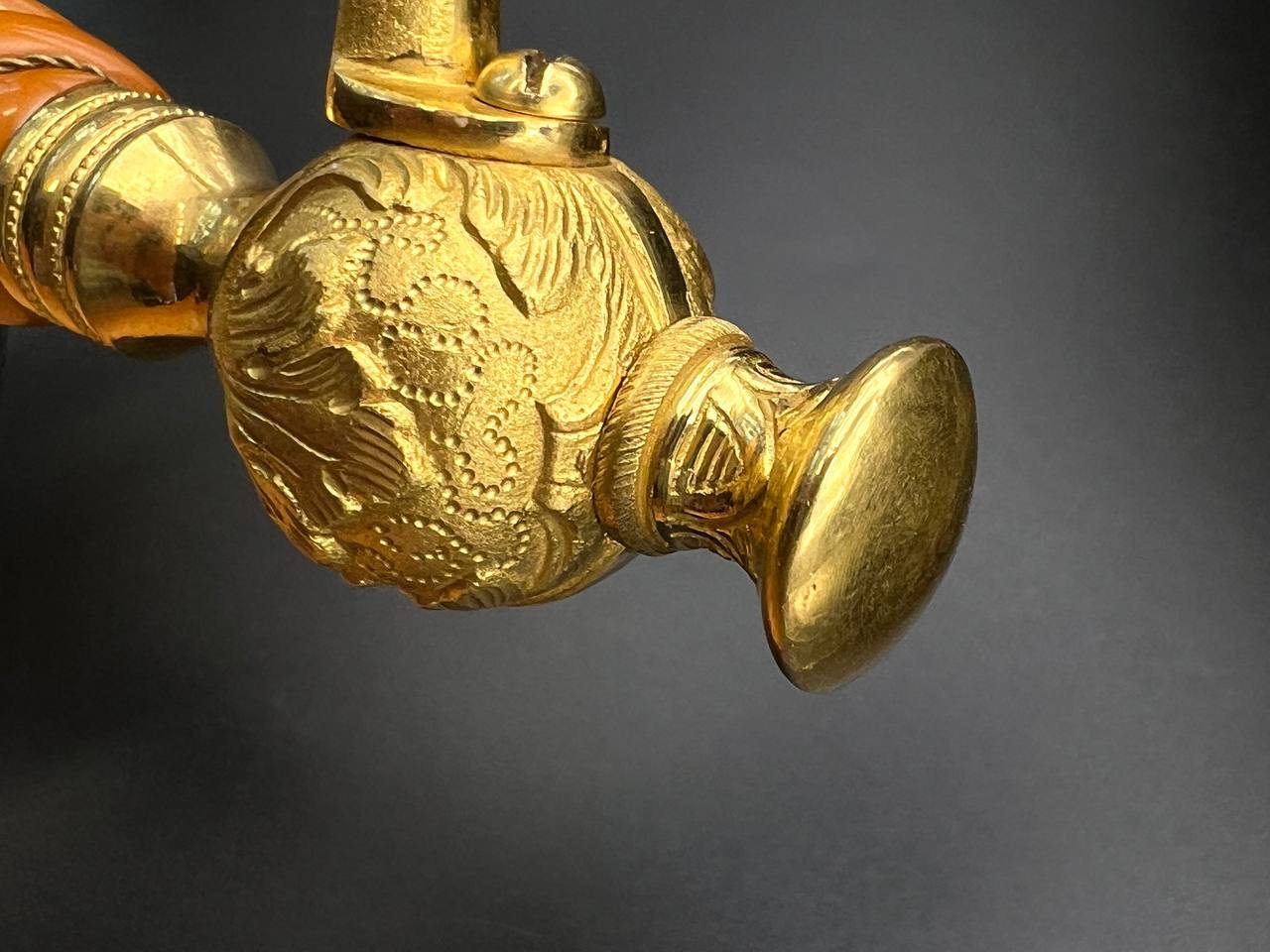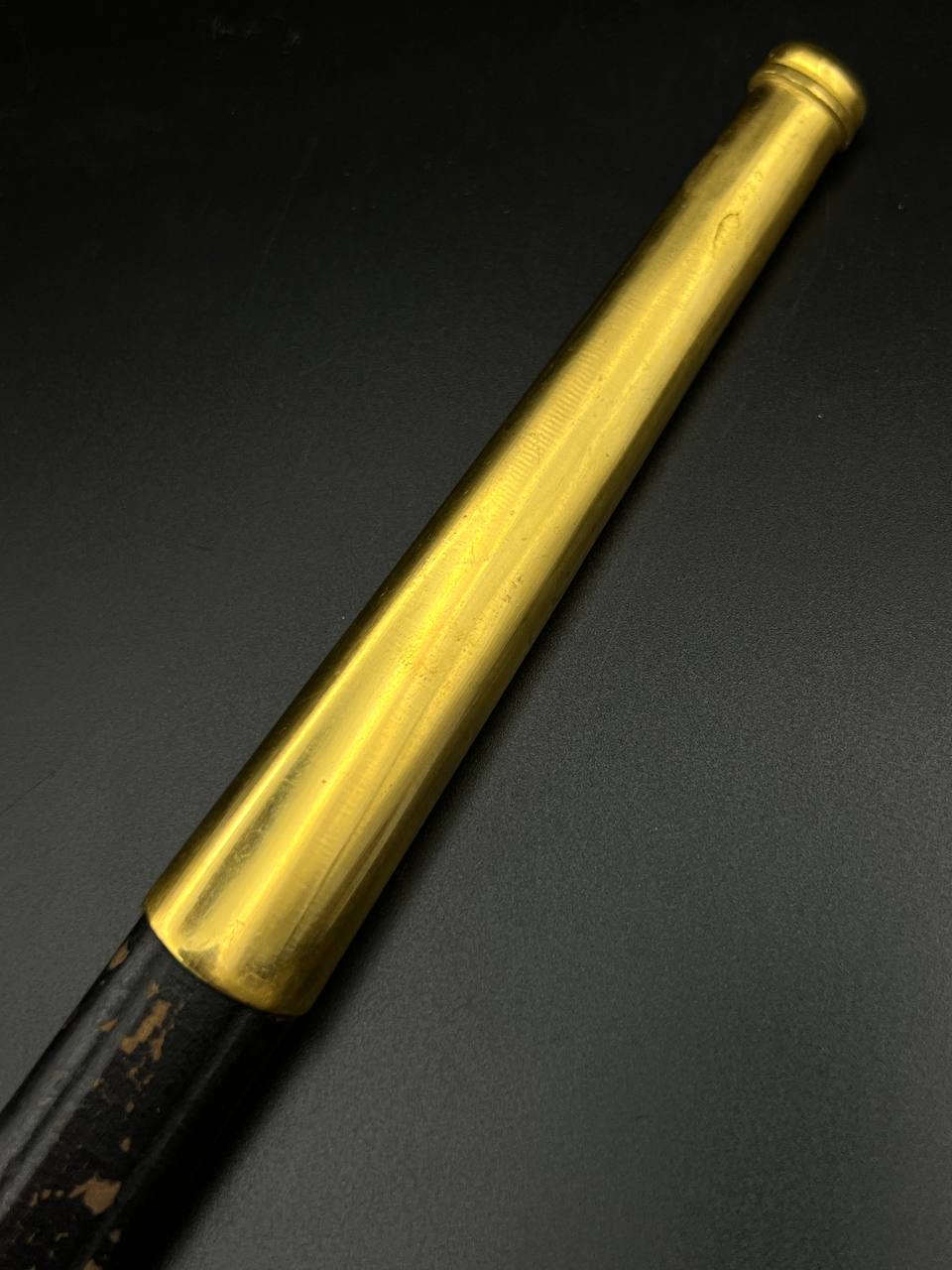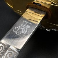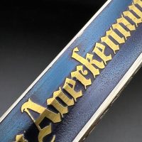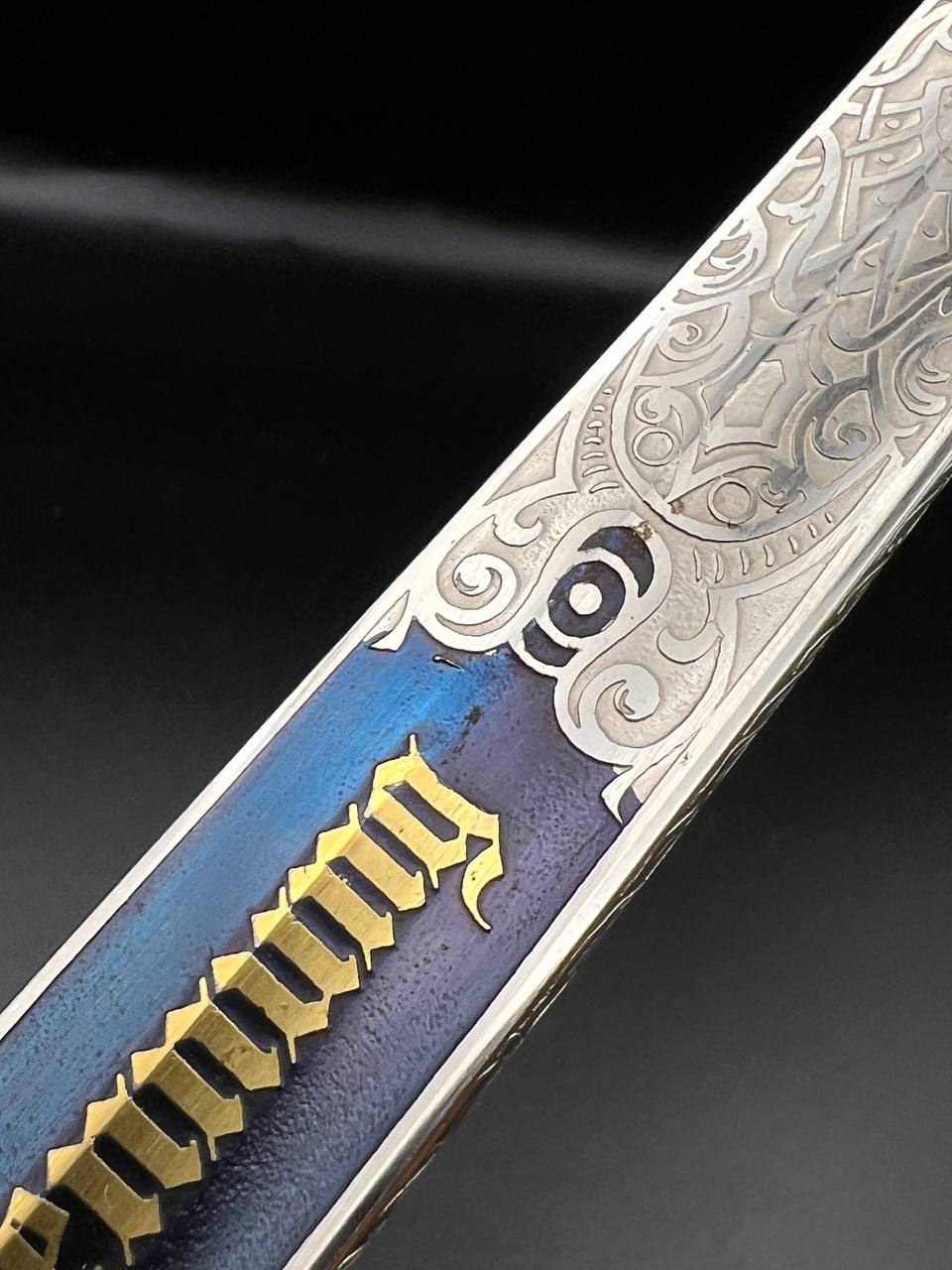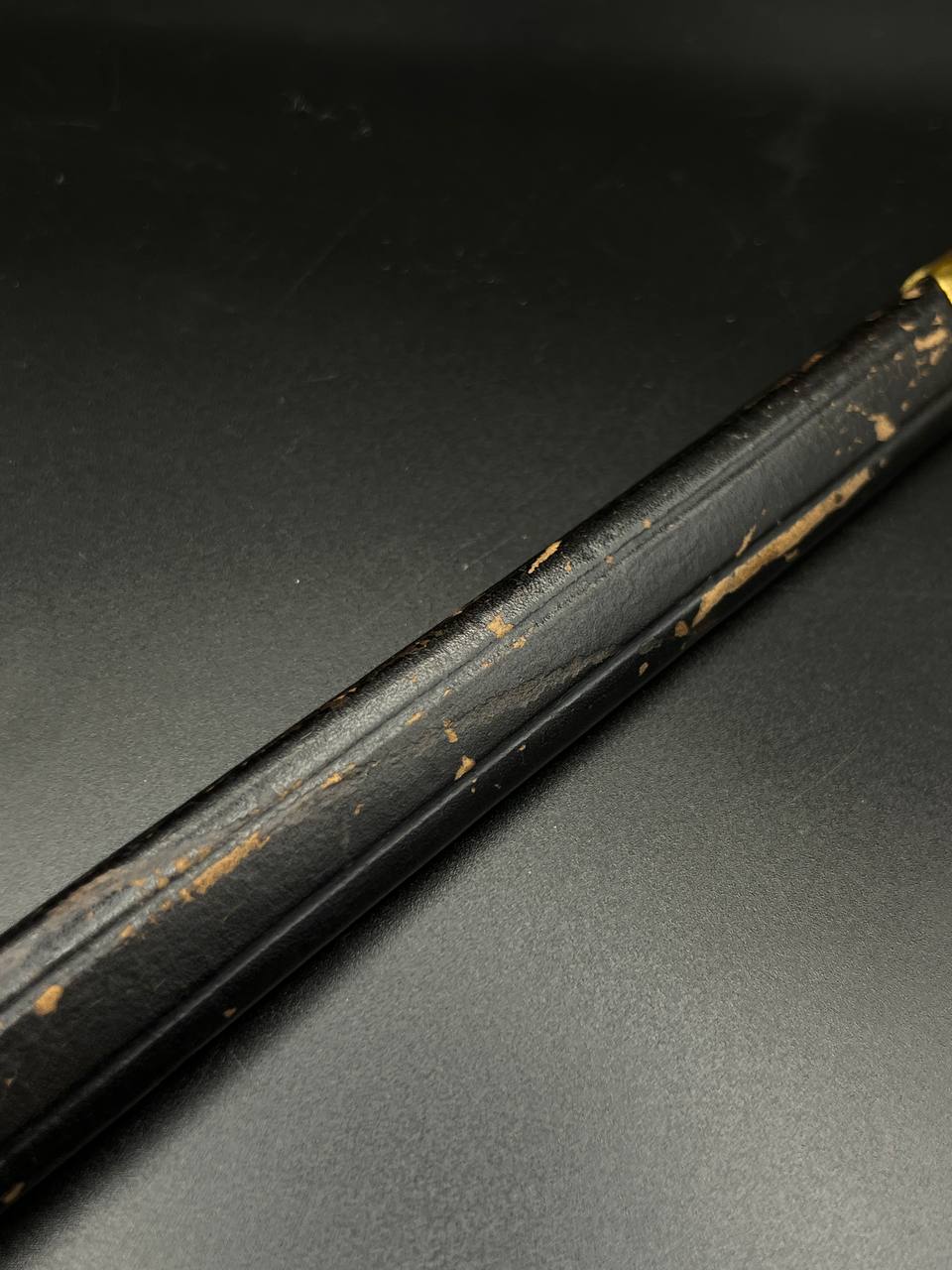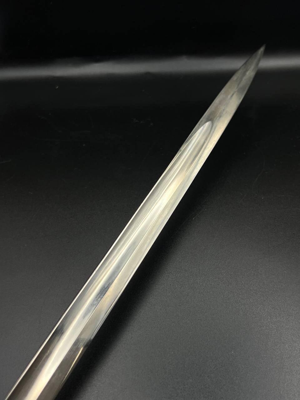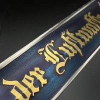 This is the classic version manufactured by Carl Eickhorn Solingen. The hilt fittings in fire-gilt non-ferrous metal, the grip mounts hand-decorated. On the obverse quillon, the separately applied silver-plated Luftwaffe national eagle, triple-riveted. The grip in amber color with gilt wire wrap. Straight nickel-plated and etched blade with fullers on both sides, gilt dedication on the obverse “In dankbarer Anerkennung” (In Grateful Recognition), on the reverse “Der Oberbefehlshaber der Luftwaffe – Hermann Göring” (The Commander-in-Chief of the Luftwaffe – Hermann Göring), each gilt with blued background. On the ricasso with maker’s mark “Original Eickhorn Solingen”. Black leather scabbard with gilt mounts, reverse side clamped.