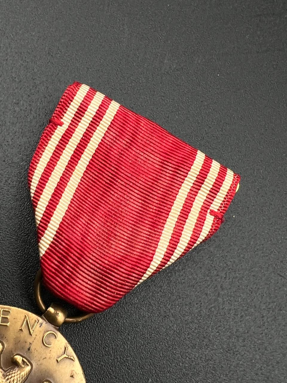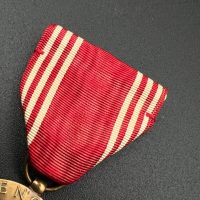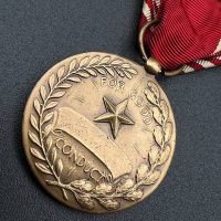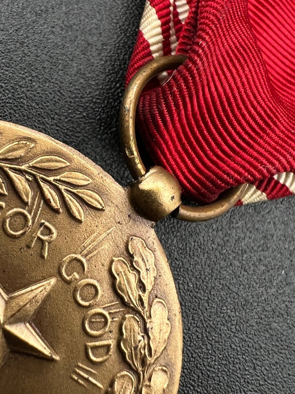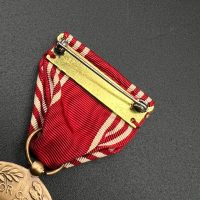 The medal is made of bronze, suspended from a red ribbon with white edge stripes.