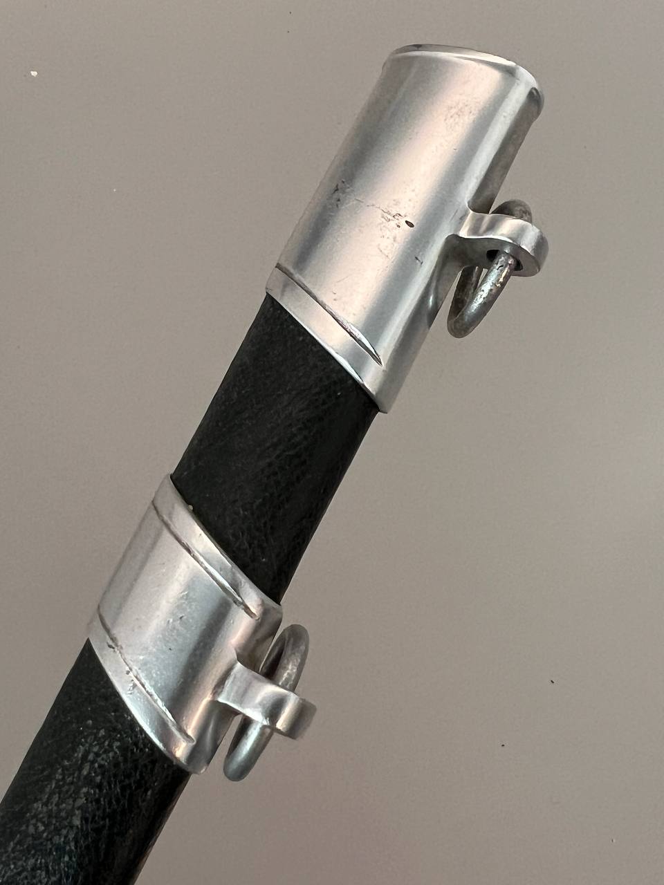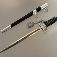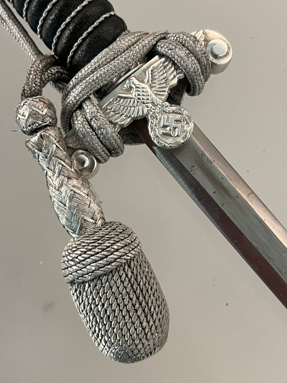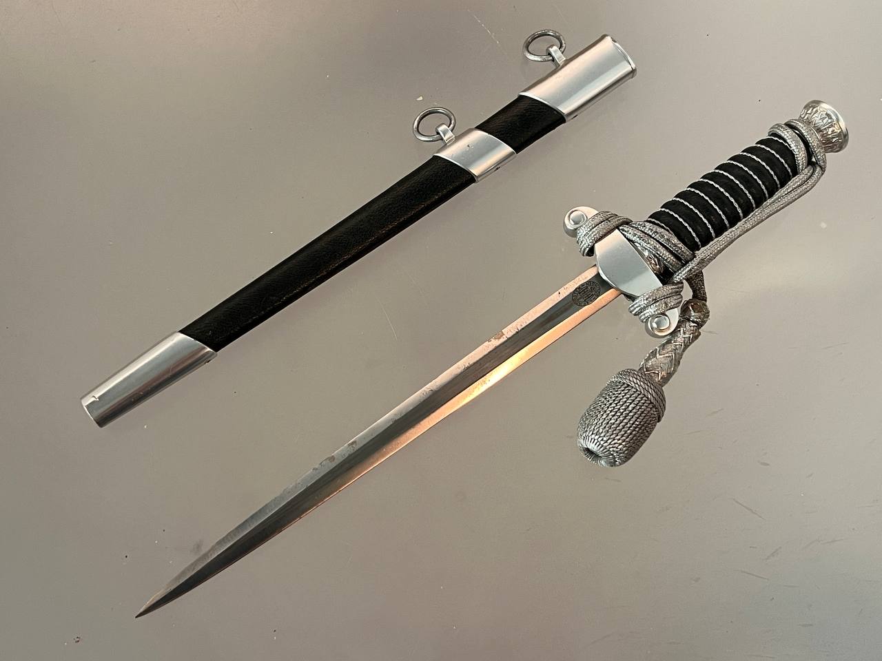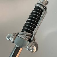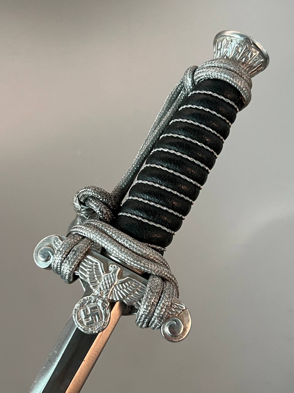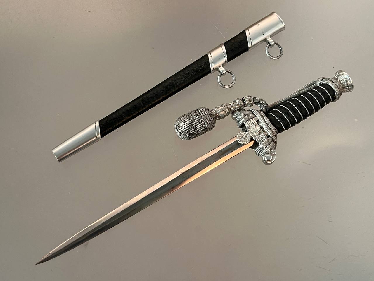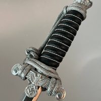 Clean blade by the maker “E.&F. Hörster Solingen”, aluminum fittings, dark green leather-covered grip with intact wire wrapping, also dark green leather-covered scabbard with aluminum fittings, no visible damage, with a simple Wehrmacht portepee. A very well-preserved dagger showing only minor signs of age.