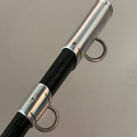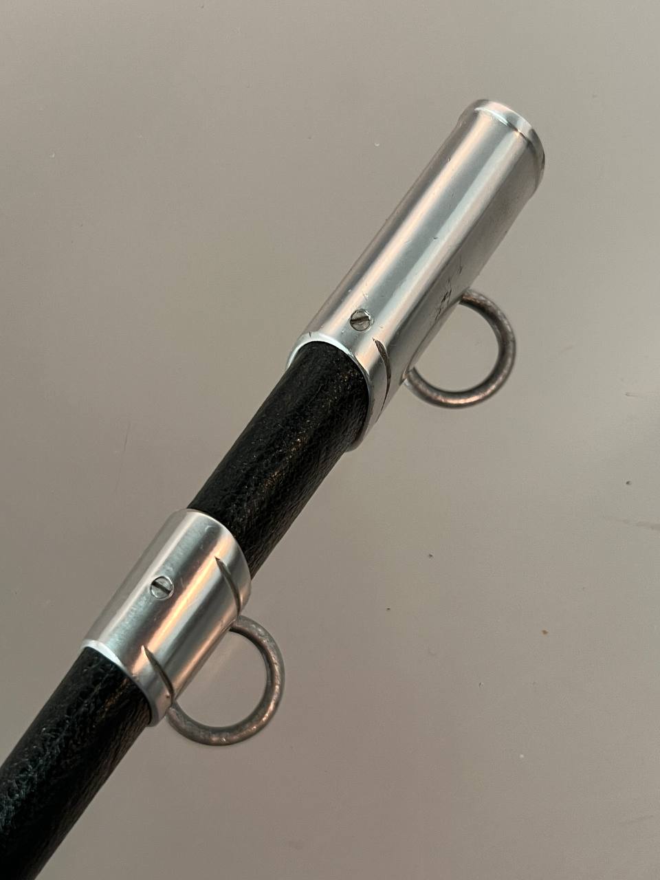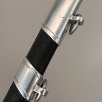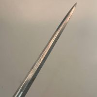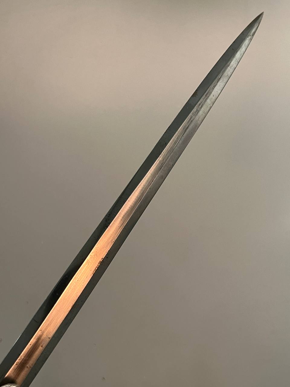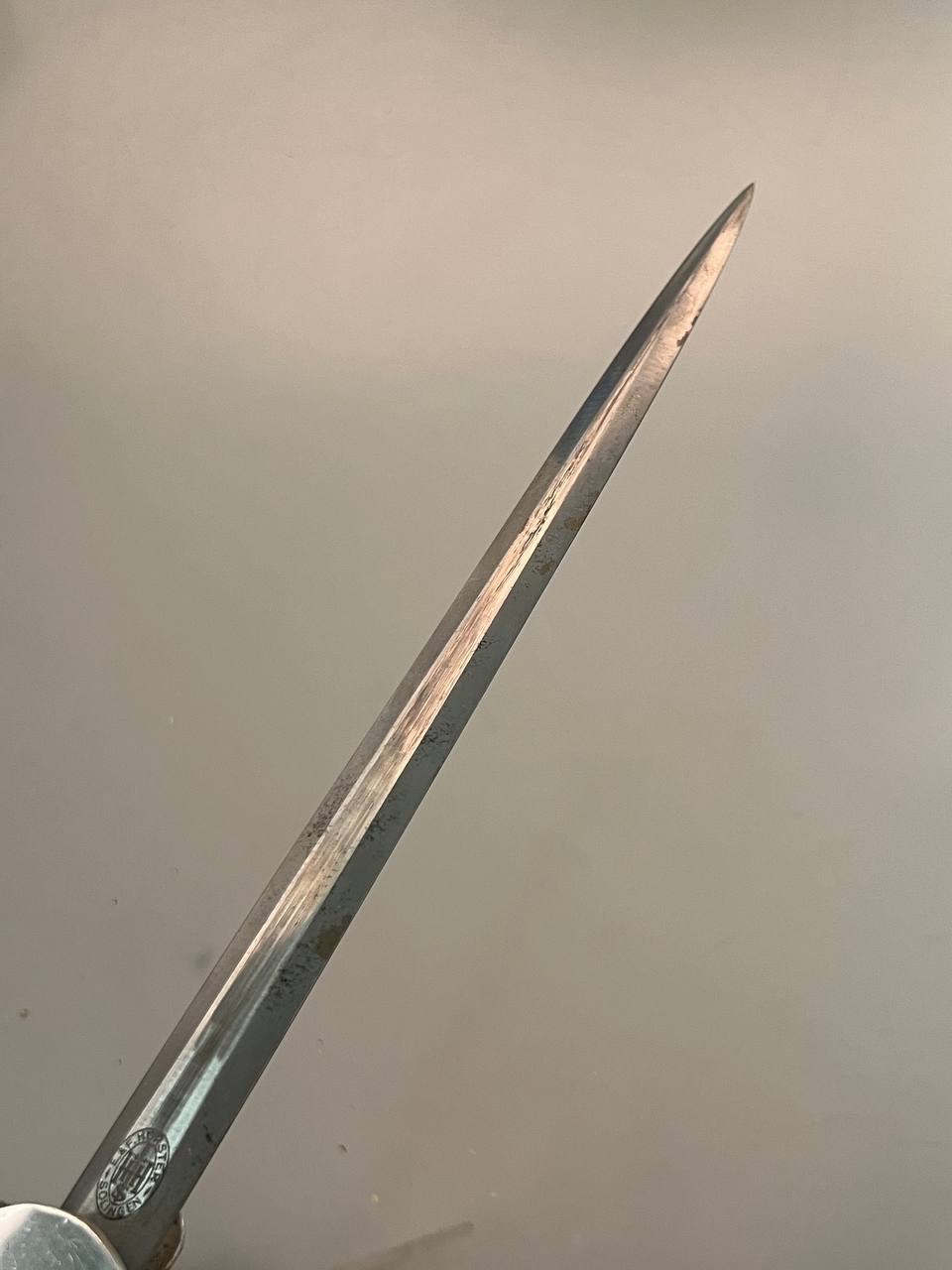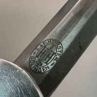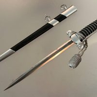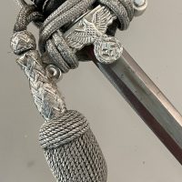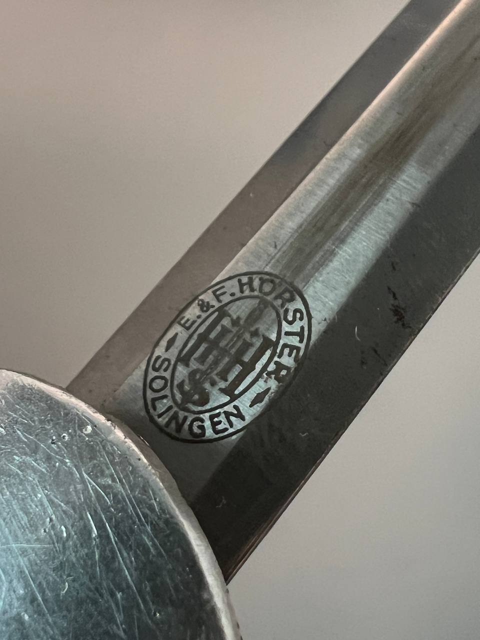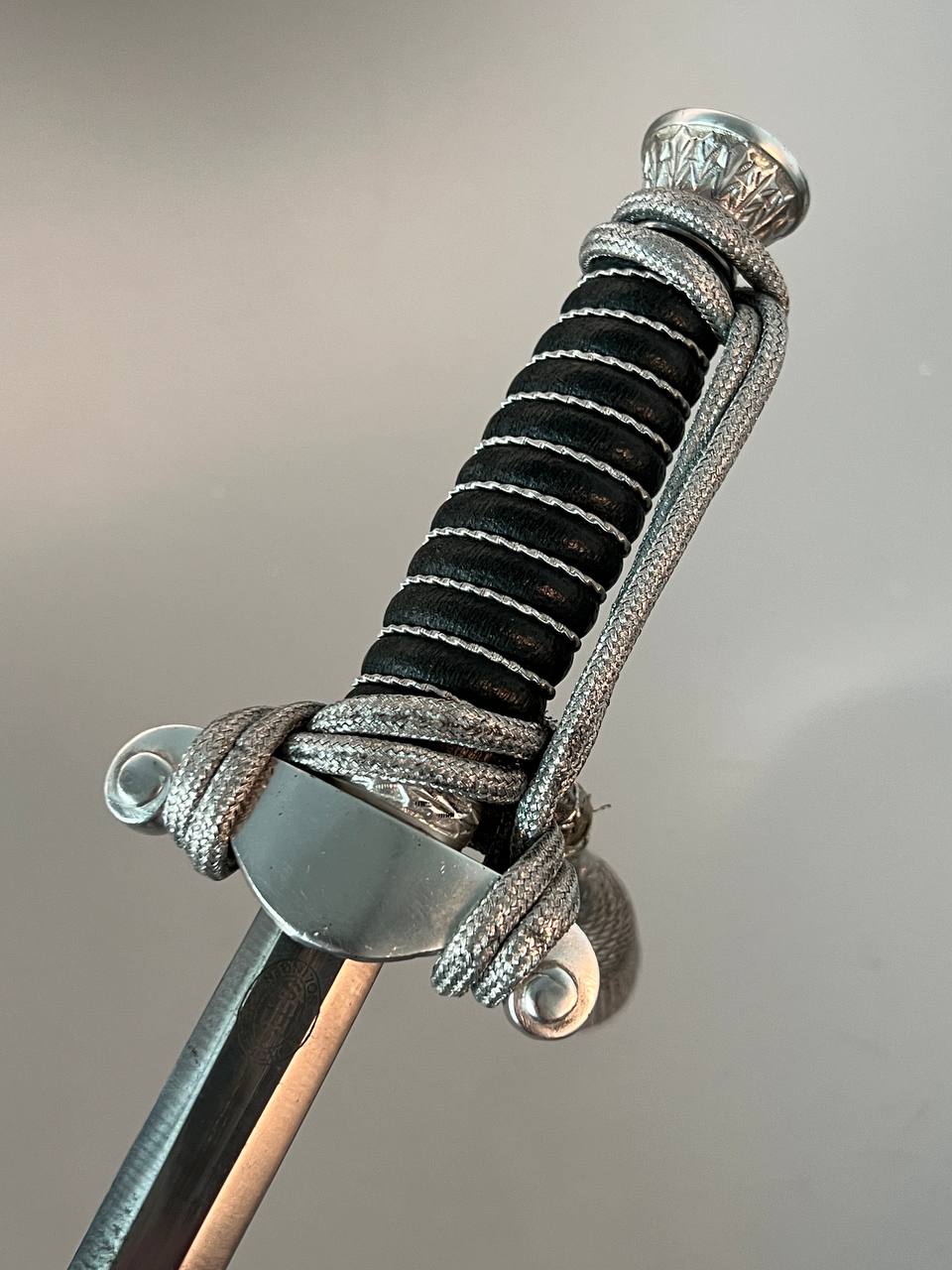 Clean blade by the maker “E.&F. Hörster Solingen”, aluminum fittings, dark green leather-covered grip with intact wire wrapping, also dark green leather-covered scabbard with aluminum fittings, no visible damage, with a simple Wehrmacht portepee. A very well-preserved dagger showing only minor signs of age.
