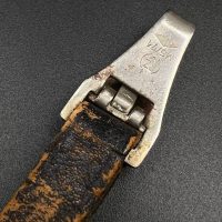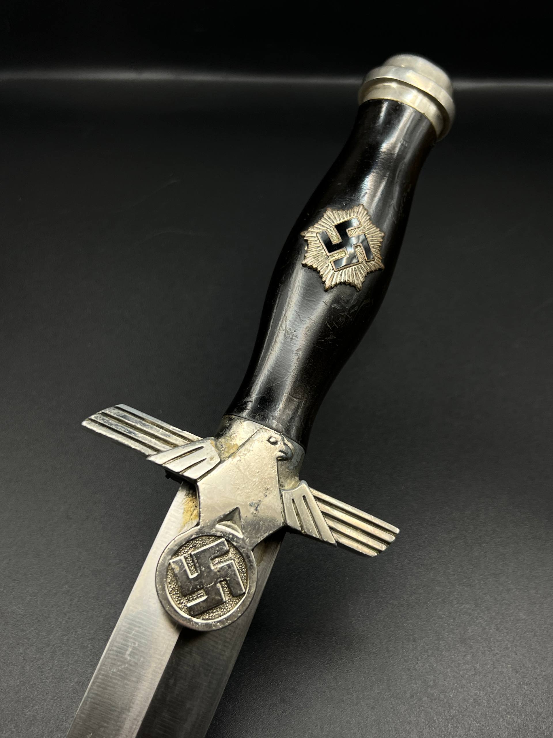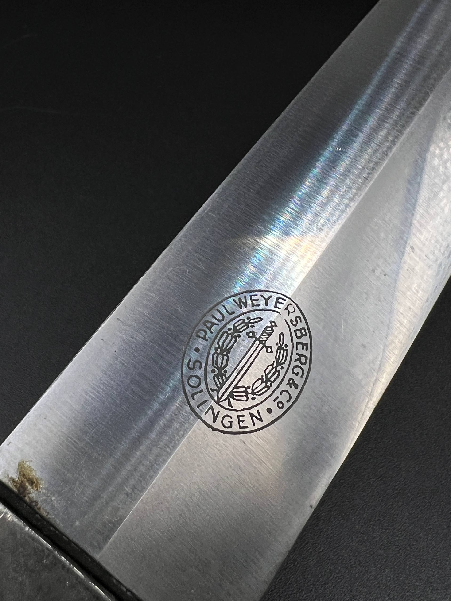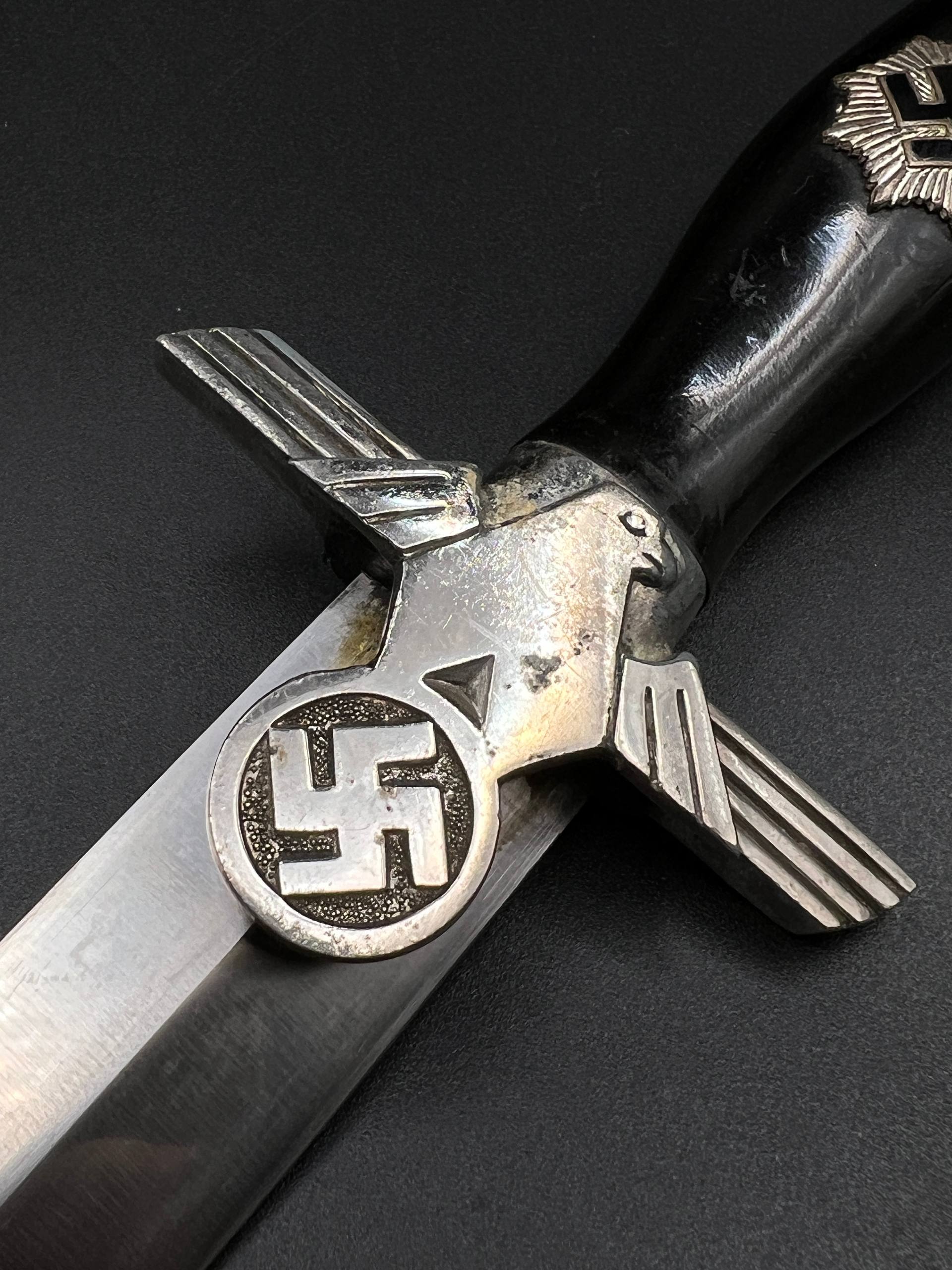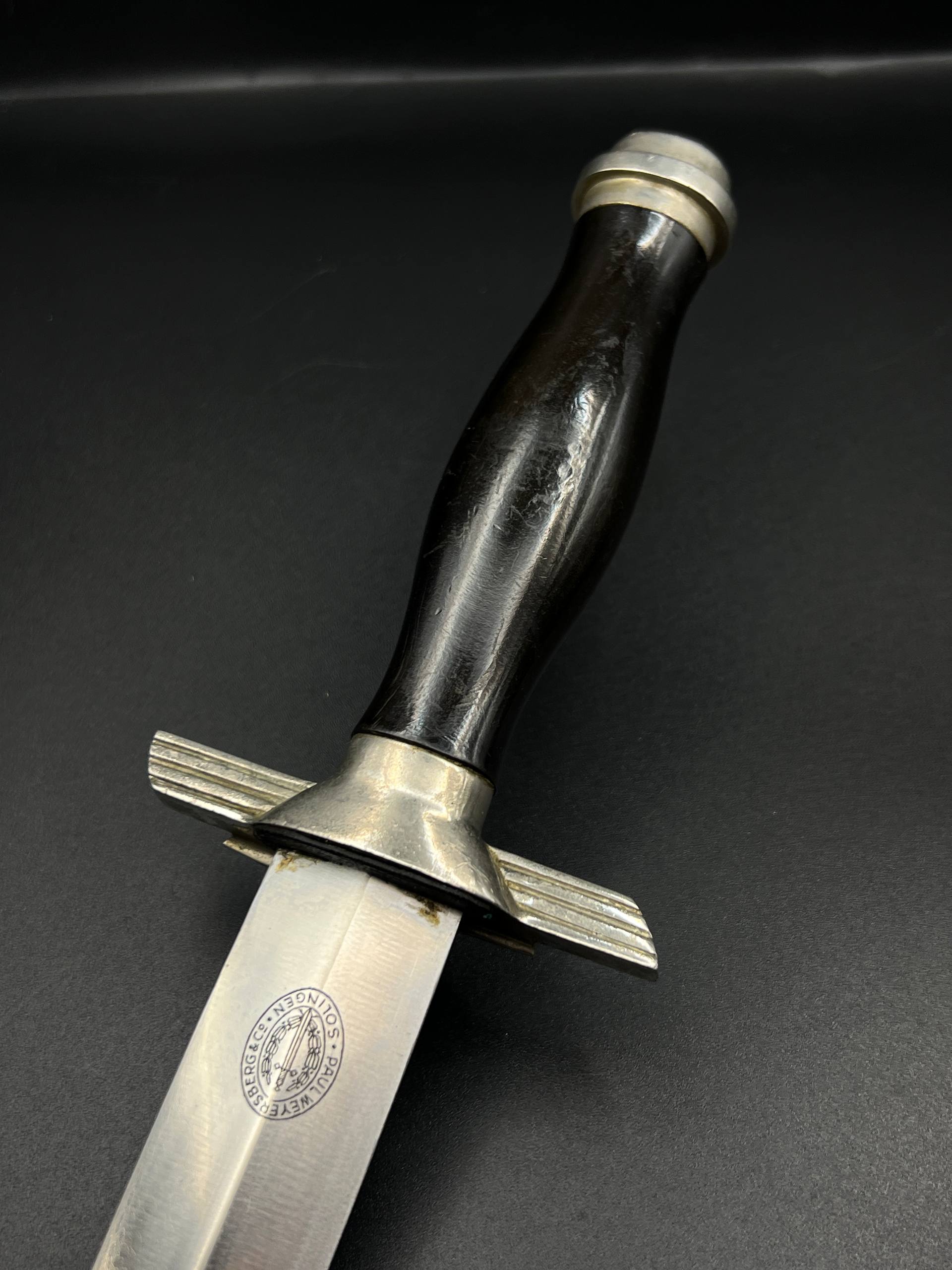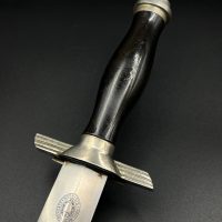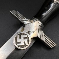 This dagger features a beautiful blade that retains all the original cross grain and has a very nice maker mark from Weyersberg. The eagle on the cross guard shows a few marks and some of the plating is lifted. The grip is clean with very minimal wear and has a excellent RLB emblem. The scabbard has very nice original black paint and no dings or dents. It does retain the original leather tab style hanger, that is heavily worn but still functions properly. Overall a fine example of this style dagger.
