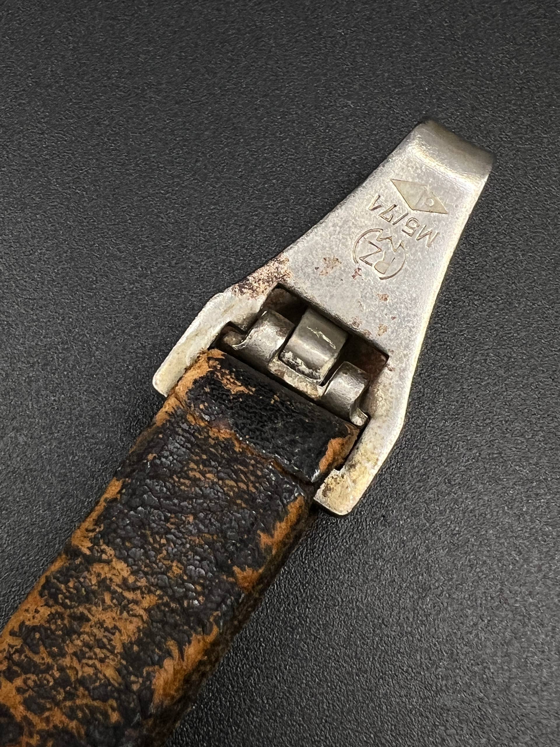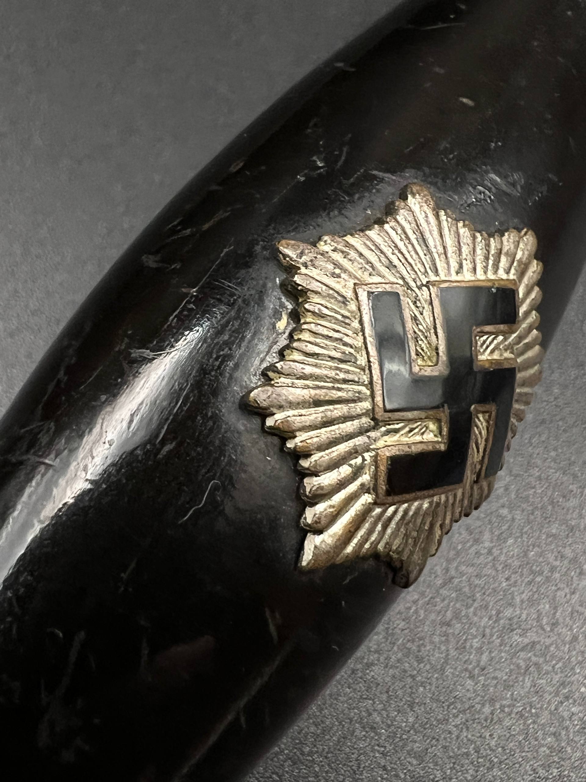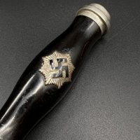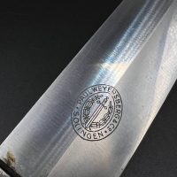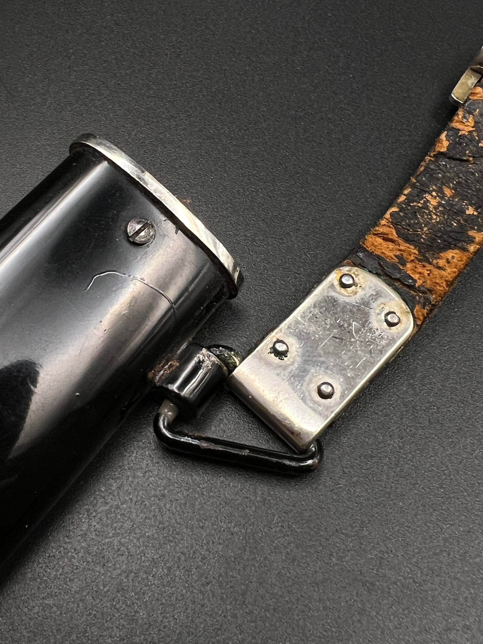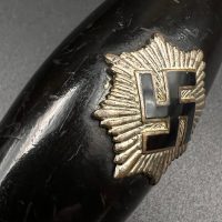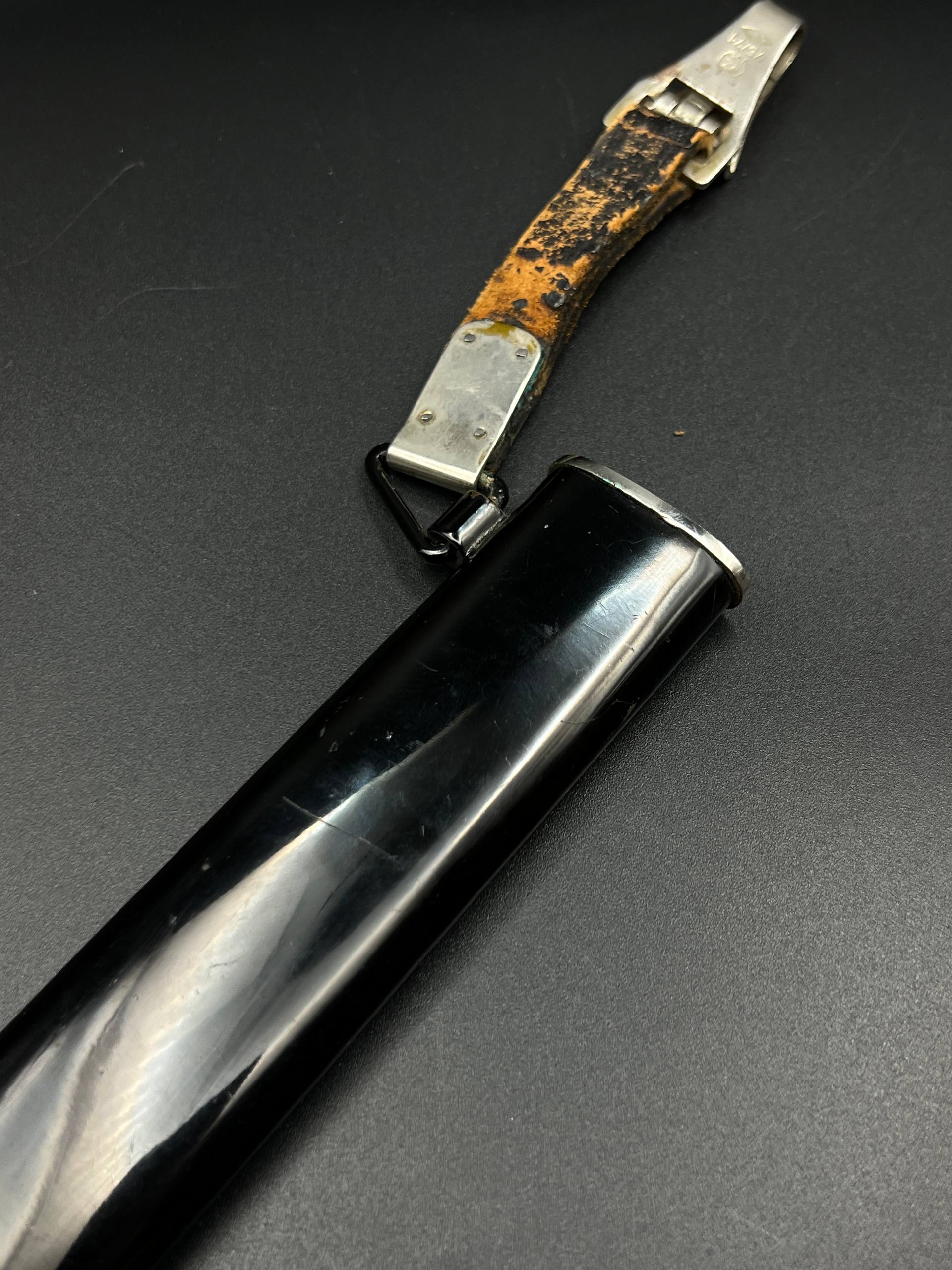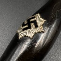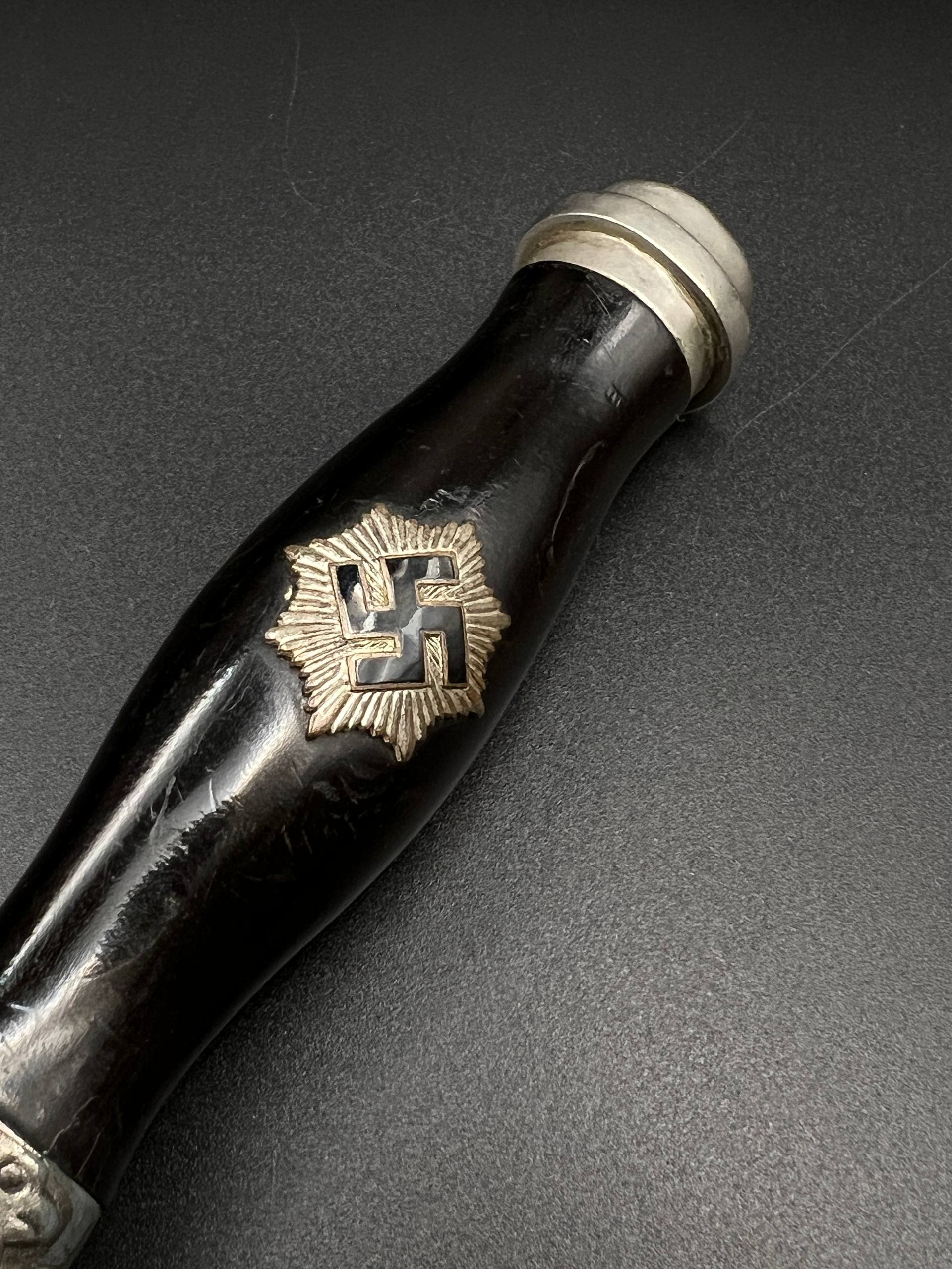 This dagger features a beautiful blade that retains all the original cross grain and has a very nice maker mark from Weyersberg. The eagle on the cross guard shows a few marks and some of the plating is lifted. The grip is clean with very minimal wear and has a excellent RLB emblem. The scabbard has very nice original black paint and no dings or dents. It does retain the original leather tab style hanger, that is heavily worn but still functions properly. Overall a fine example of this style dagger.