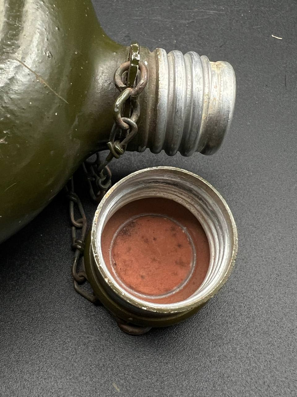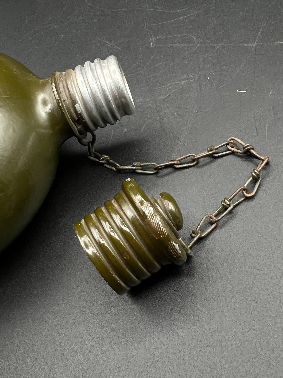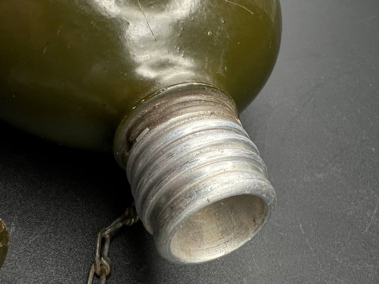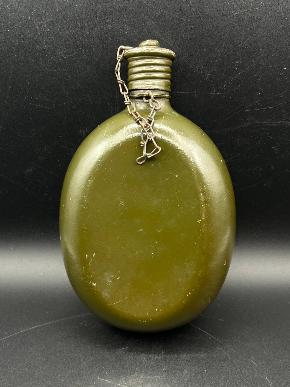 Aluminum infantry canteen of the World War II era, produced in Germany in 1946 as part of war reparations for the USSR. The body bears a clear “G.R.” maker’s mark and the date “1946.” Painted in olive-green, with an aluminum screw cap attached by a chain. This type of canteen continued the wartime design of the 1930s–1940s but belongs to the immediate postwar reparations production.