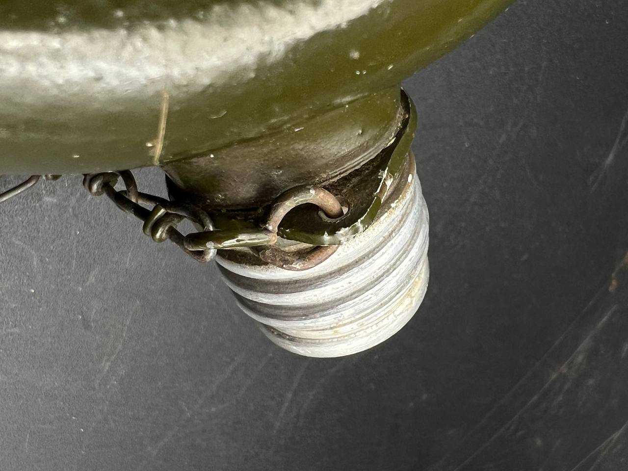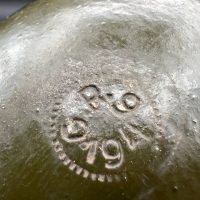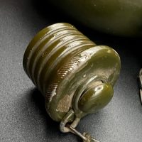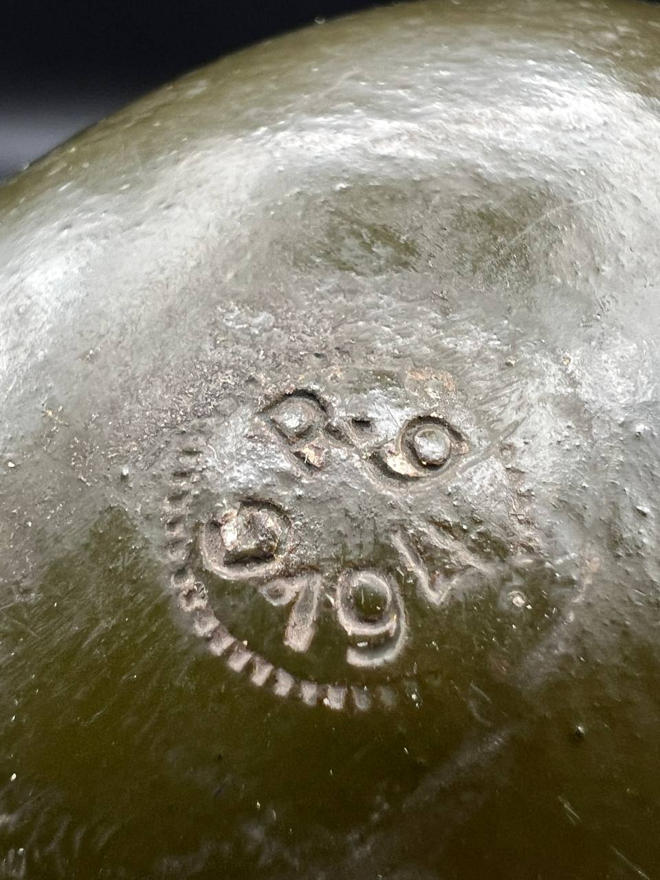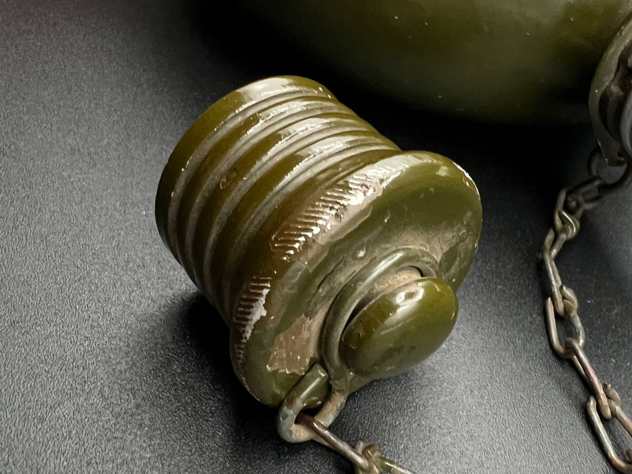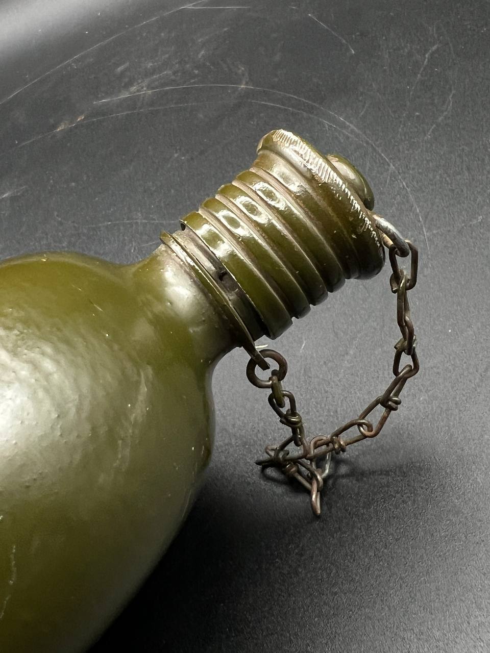 Aluminum infantry canteen of the World War II era, produced in Germany in 1946 as part of war reparations for the USSR. The body bears a clear “G.R.” maker’s mark and the date “1946.” Painted in olive-green, with an aluminum screw cap attached by a chain. This type of canteen continued the wartime design of the 1930s–1940s but belongs to the immediate postwar reparations production.