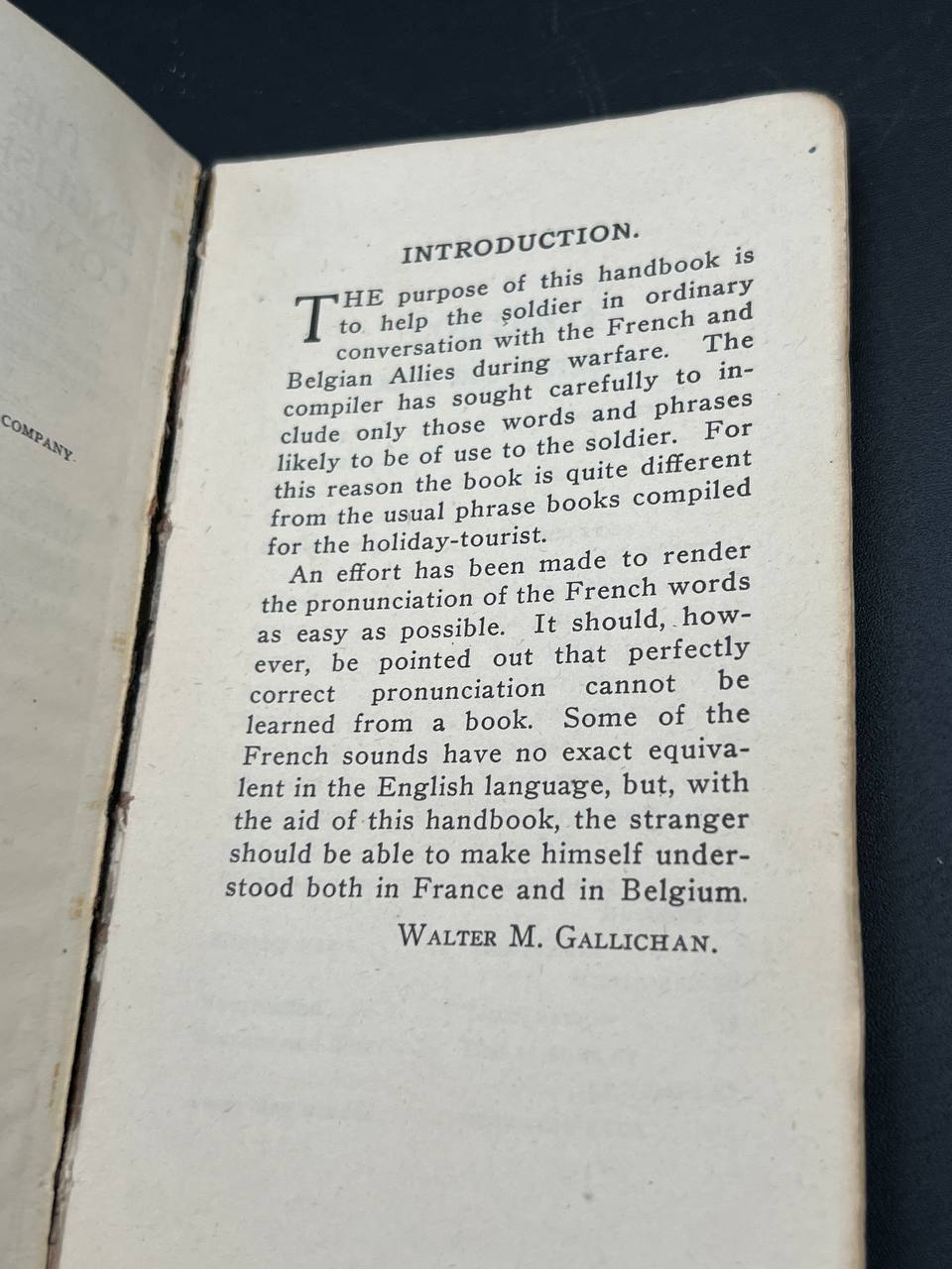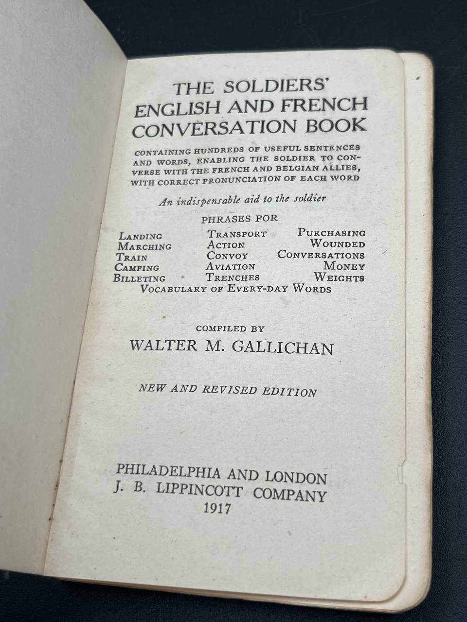 Compiled by Walter M. Gallichan and published by J. B. Lippincott Company (Philadelphia and London) in 1917, this New and Revised Edition contains hundreds of practical phrases and words enabling soldiers to communicate effectively with French and Belgian Allies during wartime.