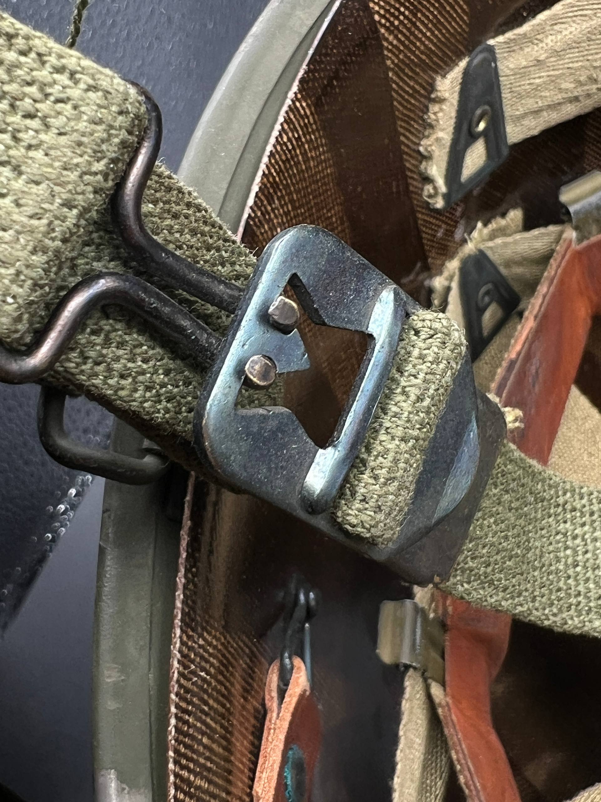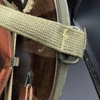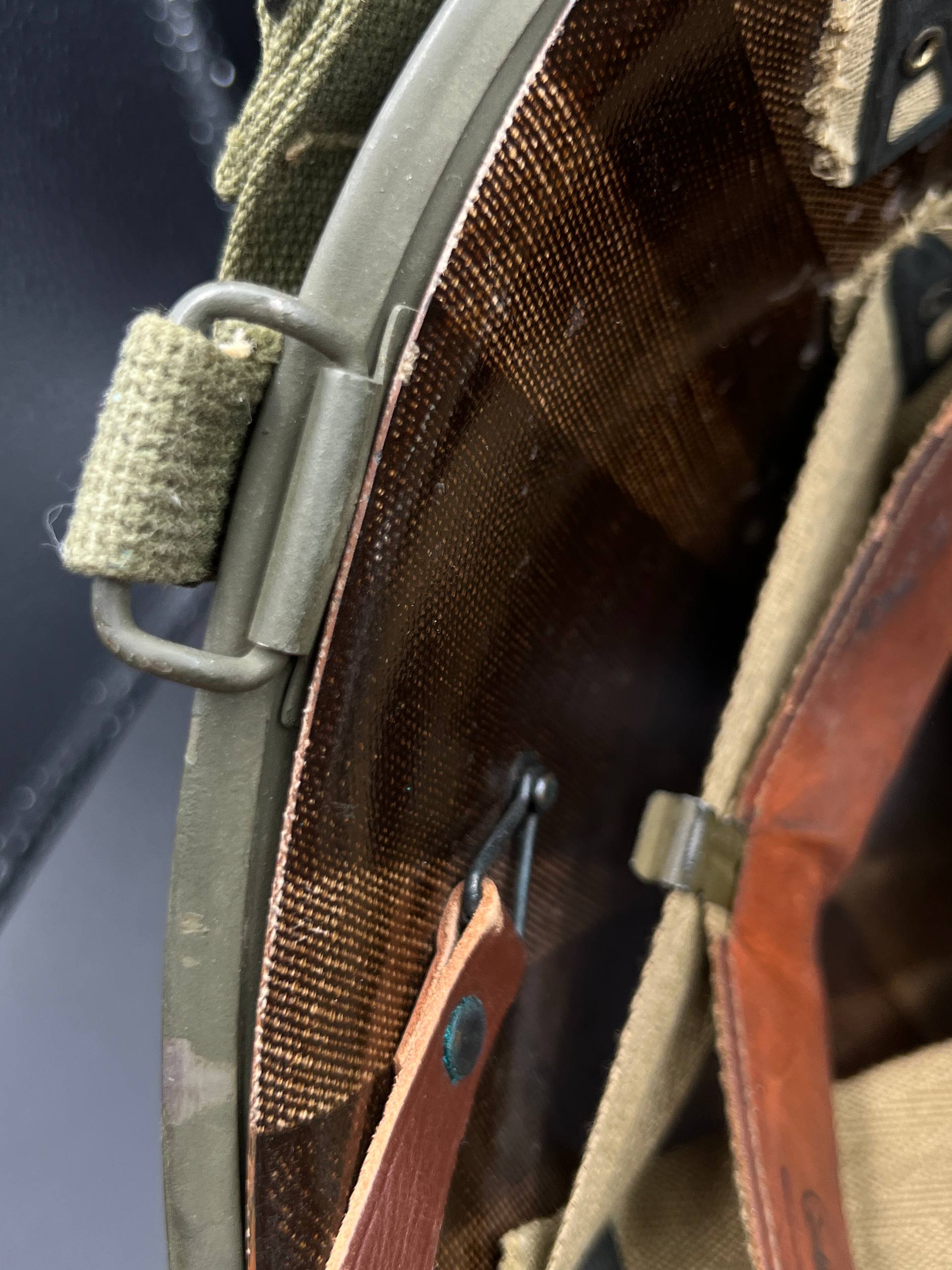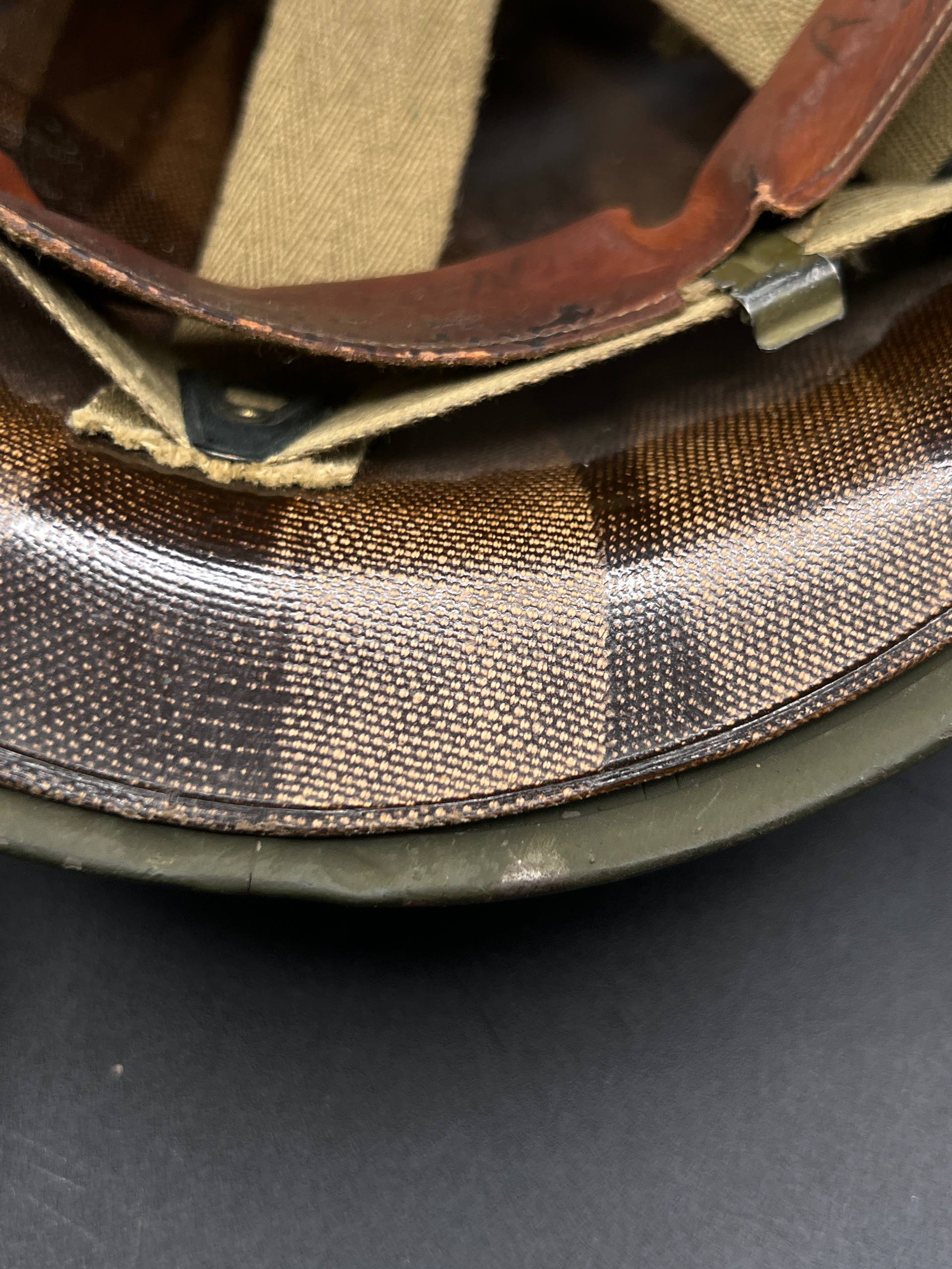 Complete with WWII-era liner featuring khaki web suspension system and leather sweatband. Canvas chinstrap present with correct early-style hardware and darkened steel buckle. Interior components show age and use but remain structurally sound.