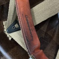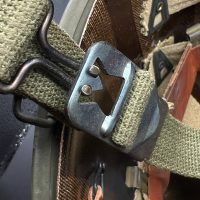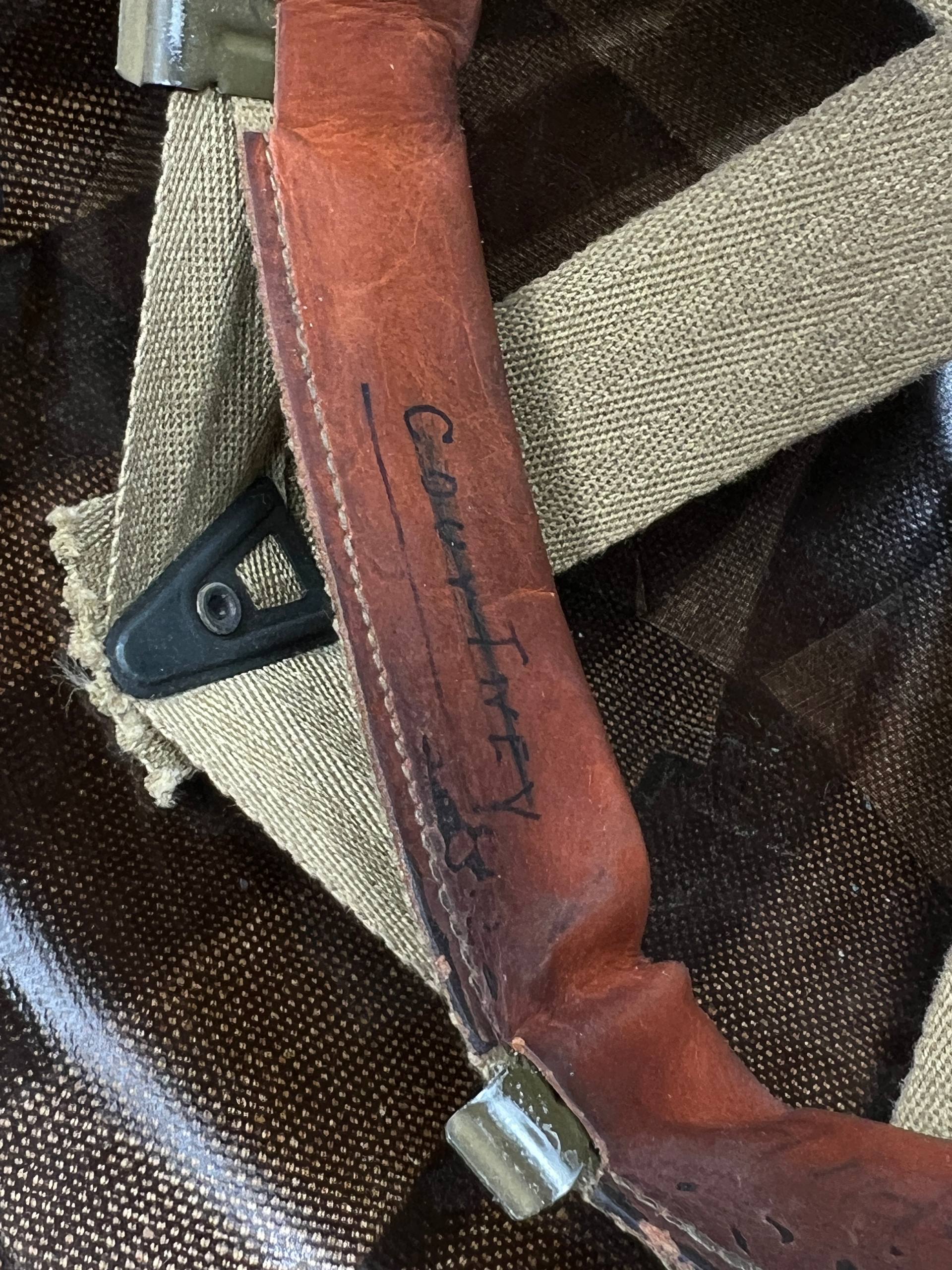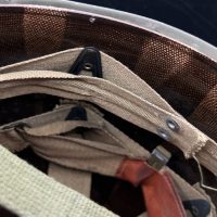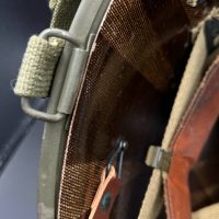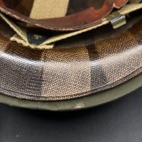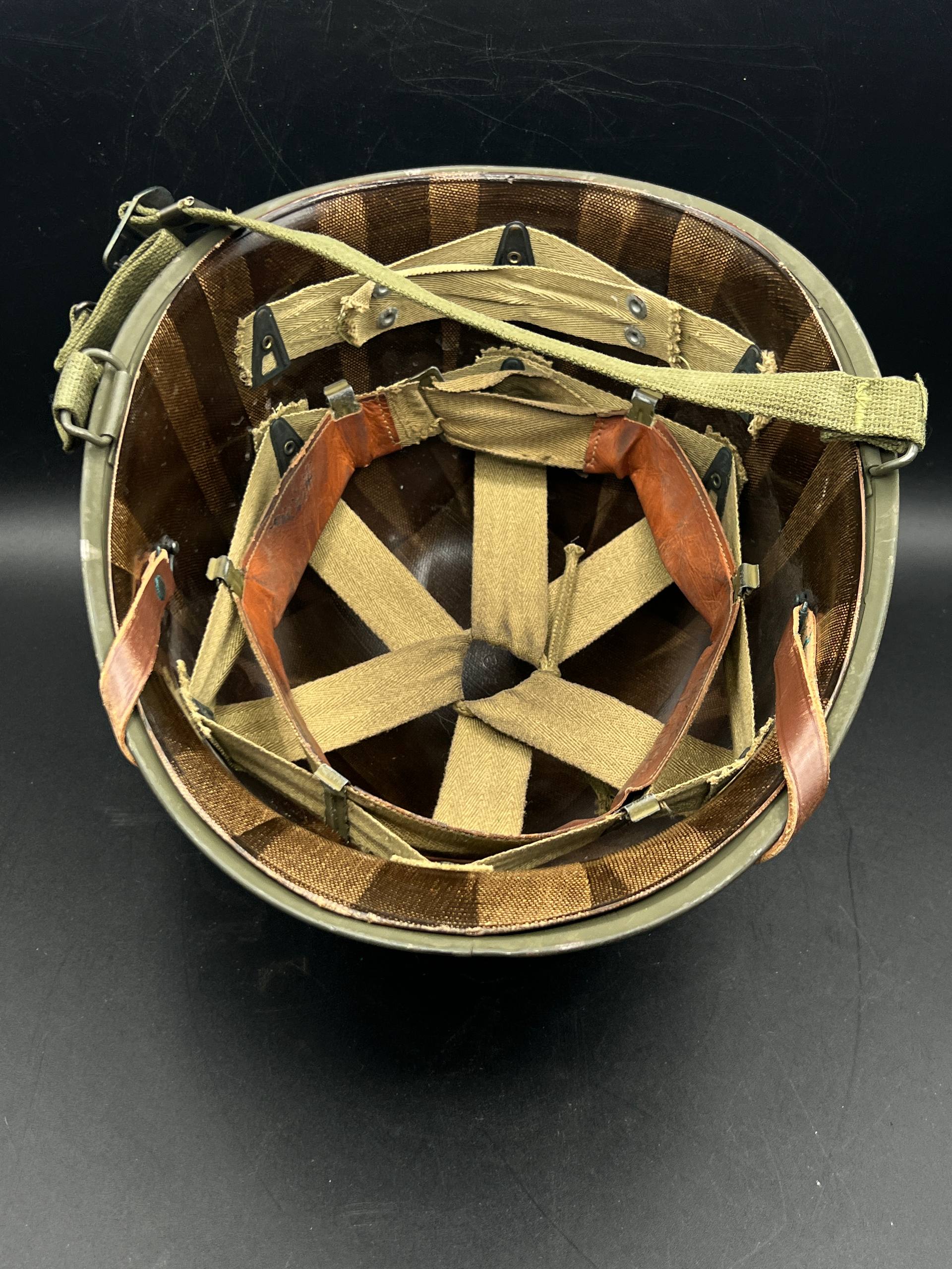 Complete with WWII-era liner featuring khaki web suspension system and leather sweatband. Canvas chinstrap present with correct early-style hardware and darkened steel buckle. Interior components show age and use but remain structurally sound.