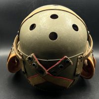 Steel shell painted in olive drab with ventilation holes to the crown. Complete with leather ear flaps and internal padding. Interior is clearly stamped: