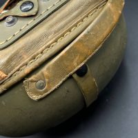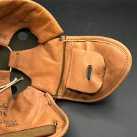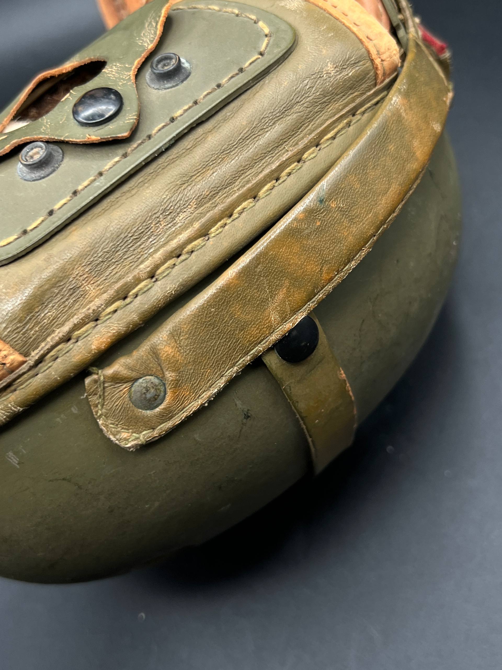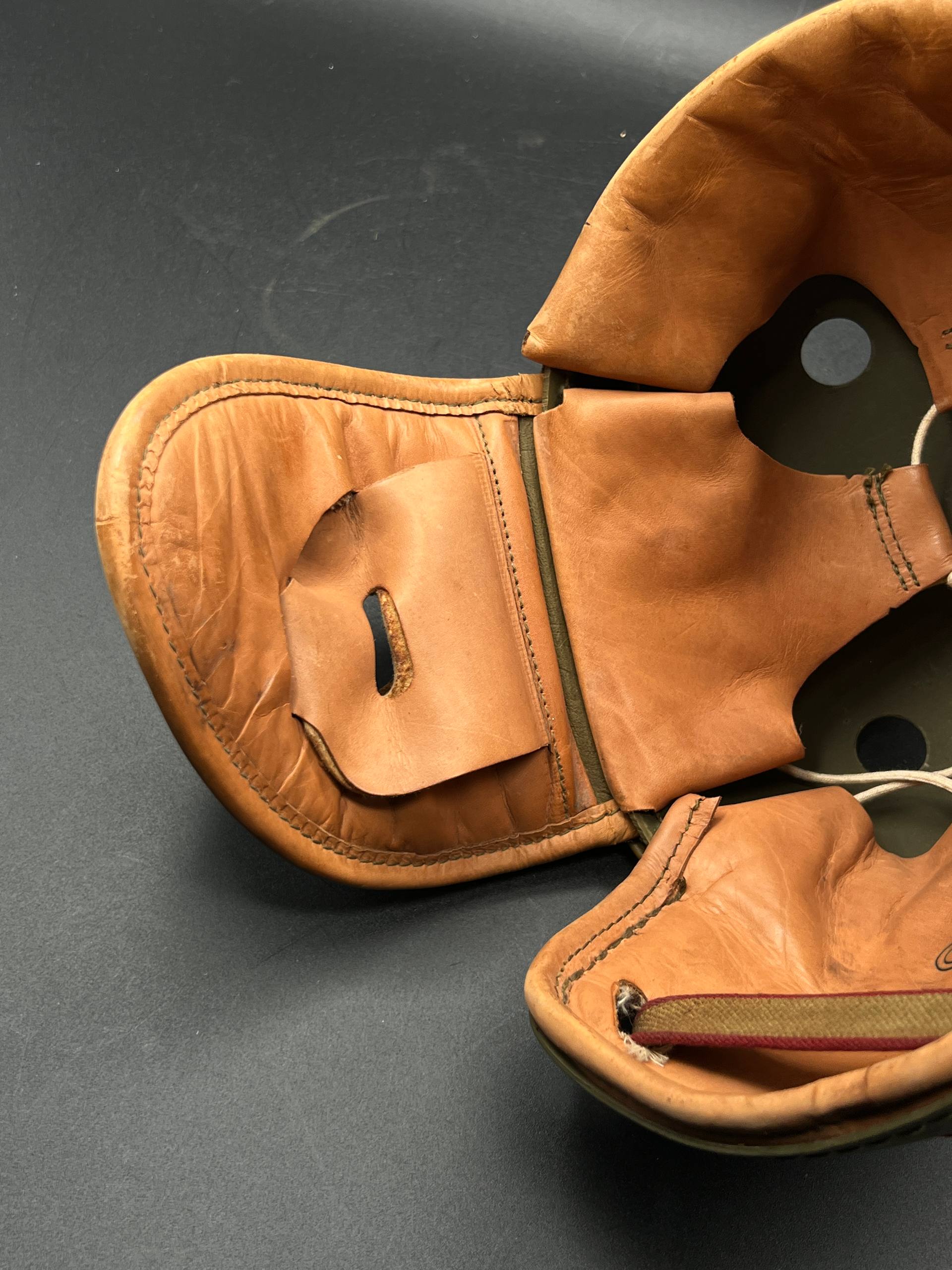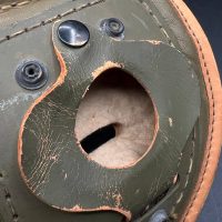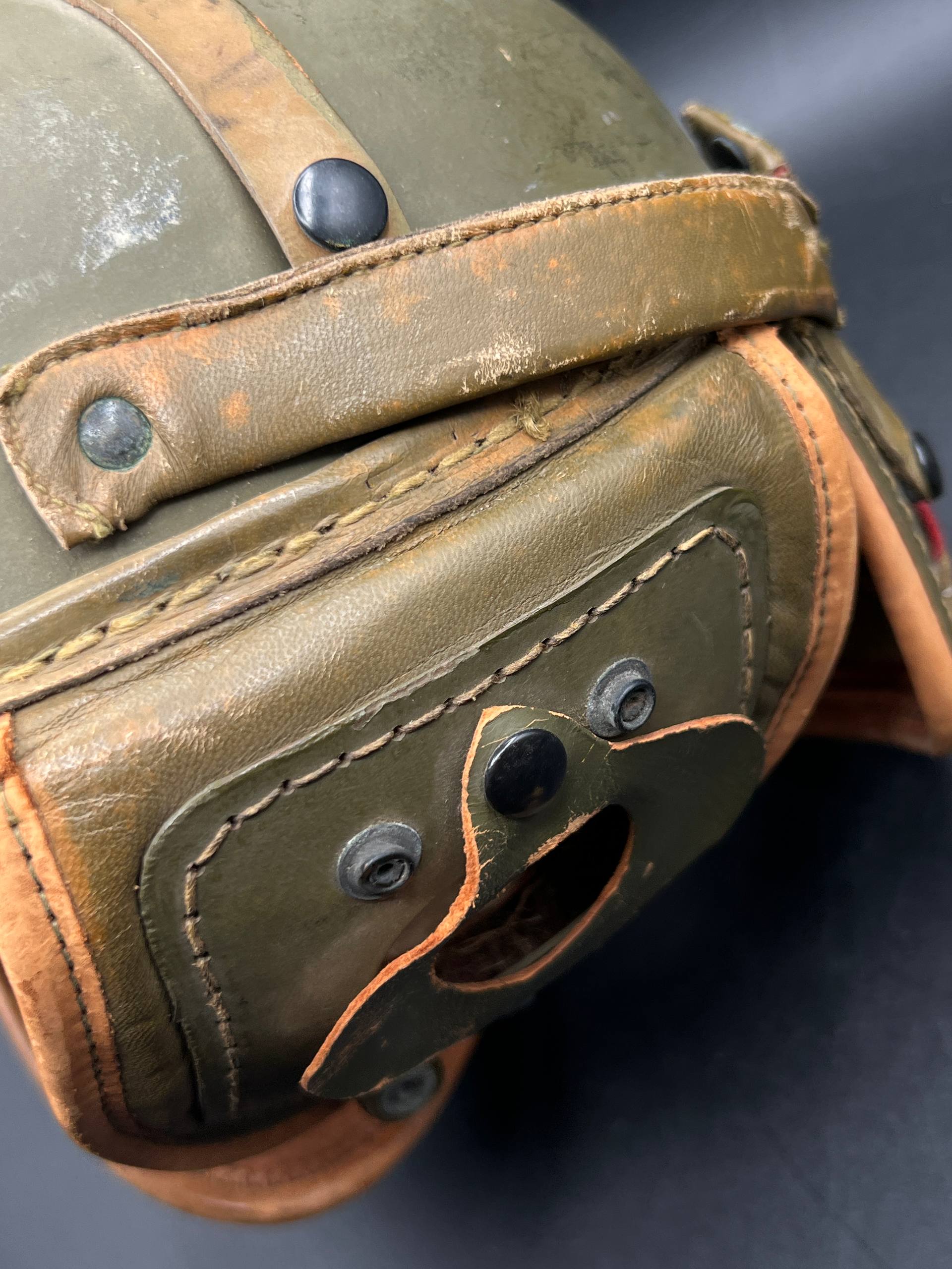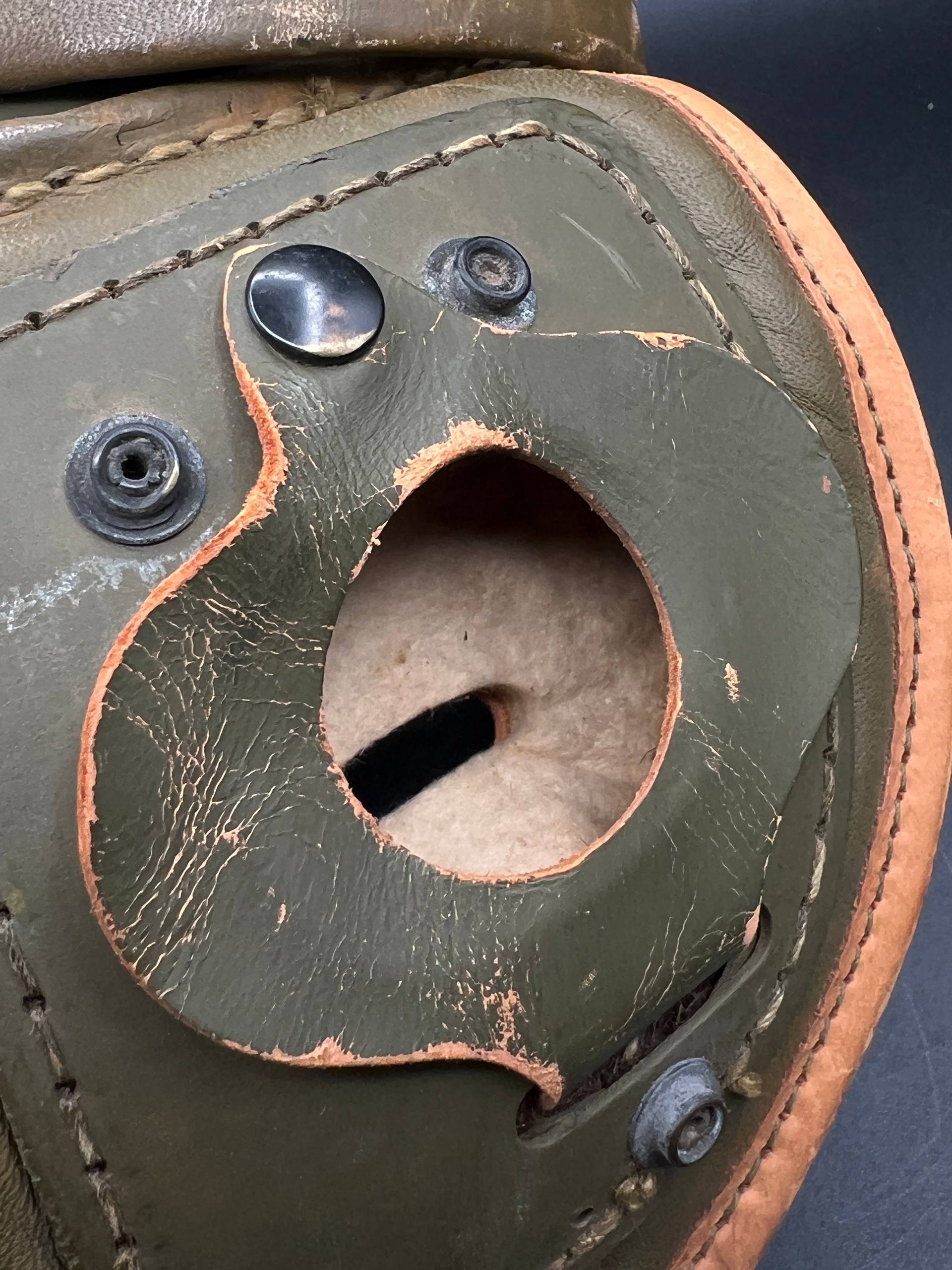The leather remains supple with honest service wear. Some surface cracking and paint loss to the ear protection plates consistent with age and use. All components appear present.